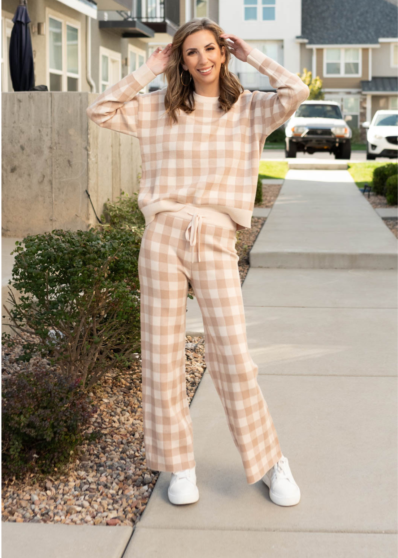 - Gingham print in neutral colors
