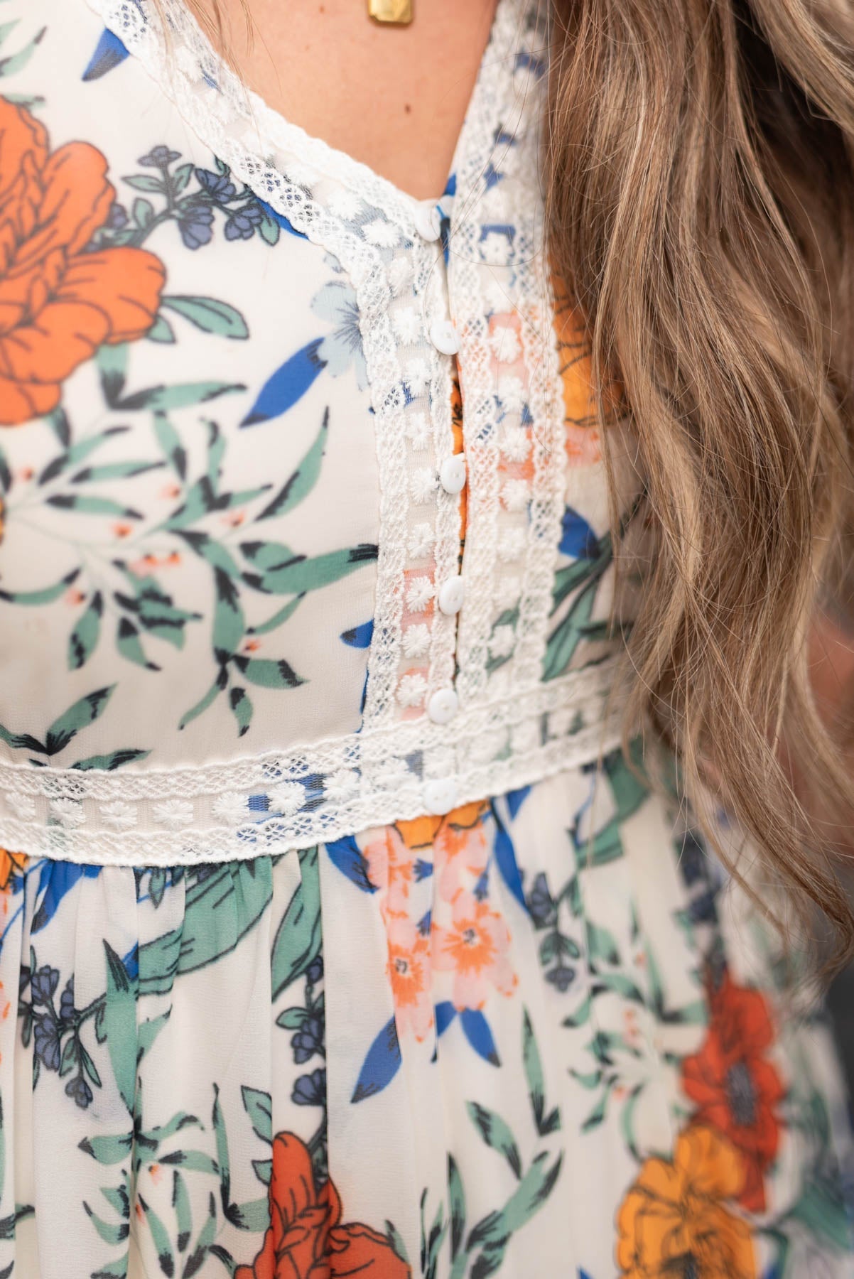 - Dainty lace trim along the neckline and tiered skirt