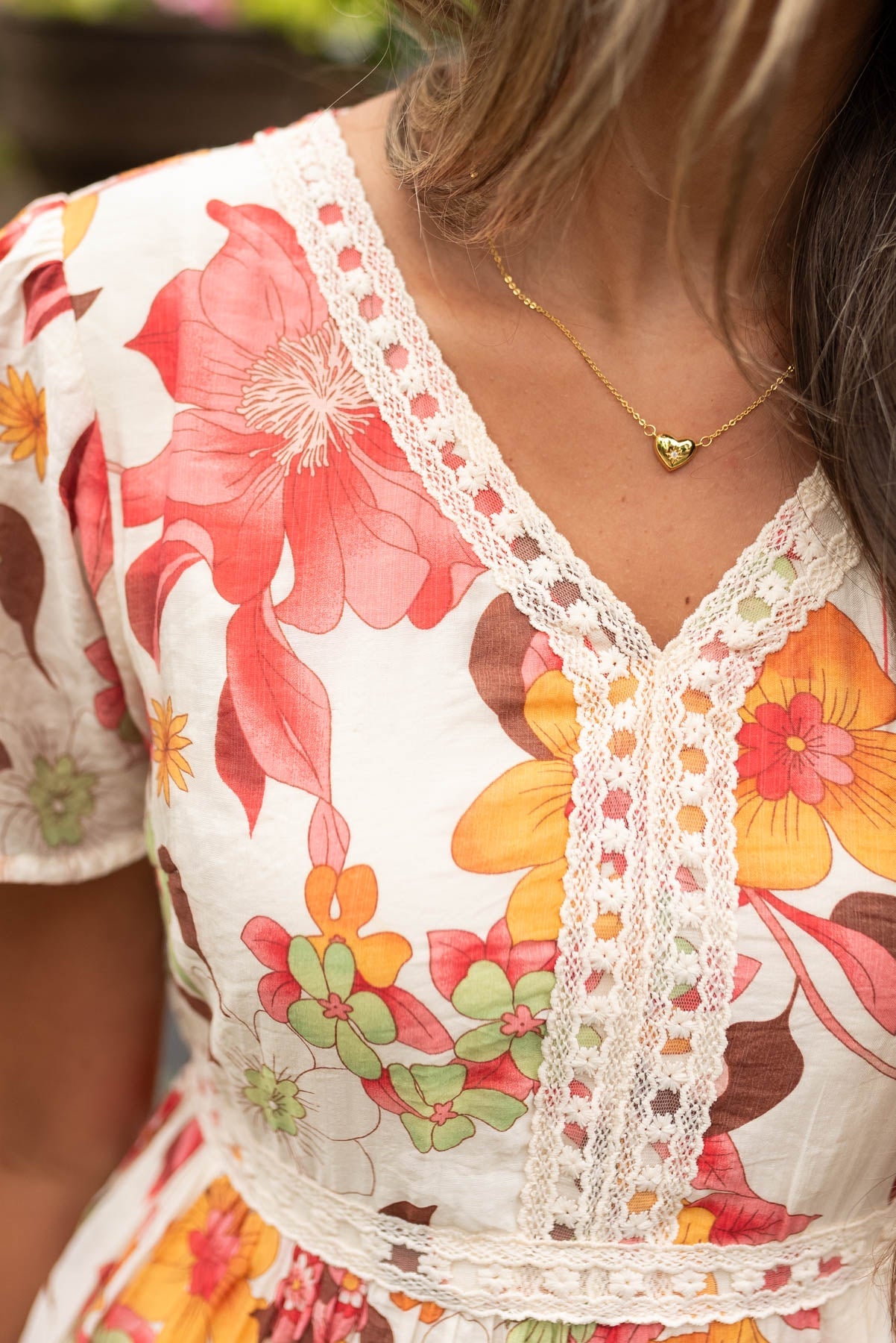 - Dainty lace trim along the neckline and tiered skirt