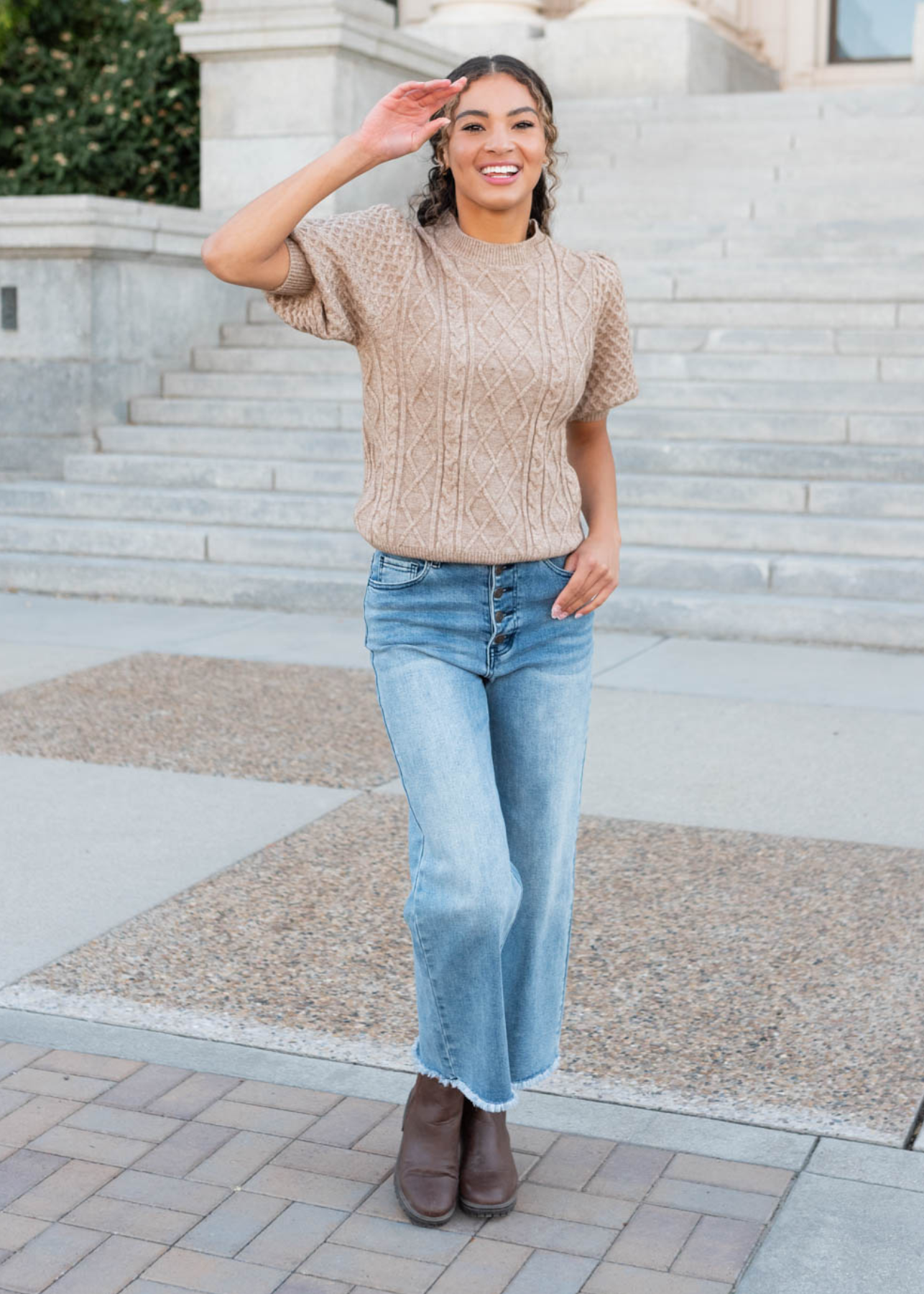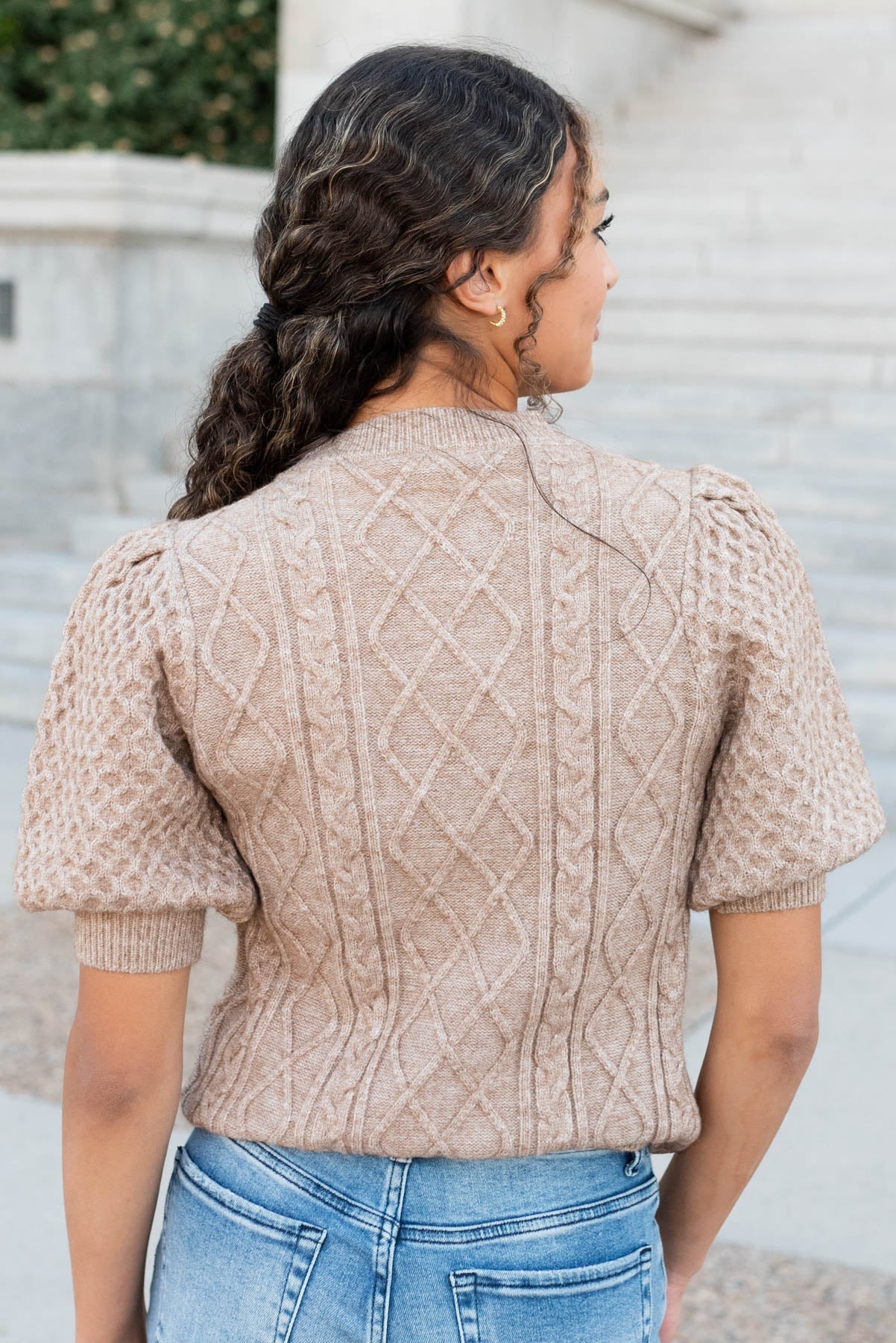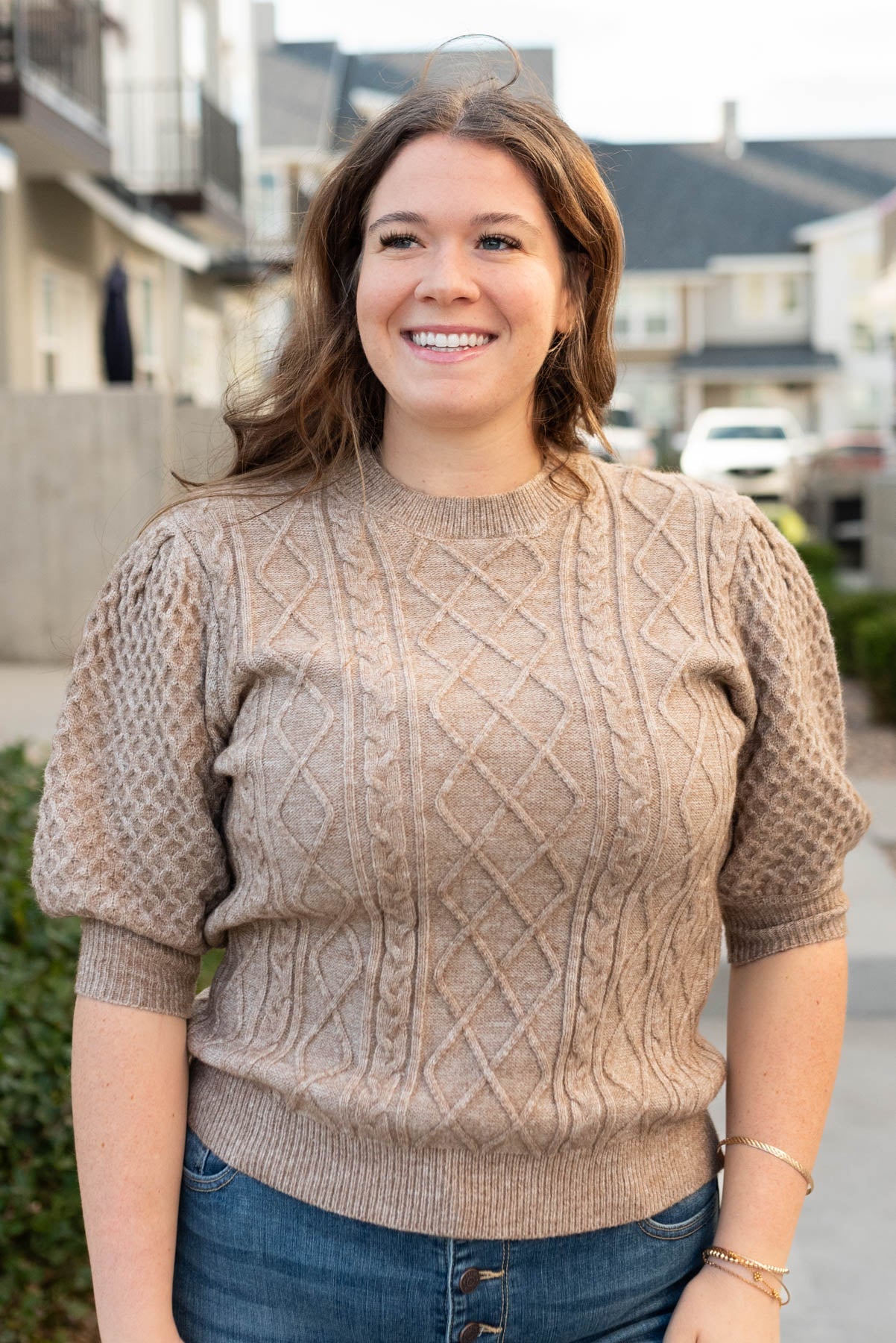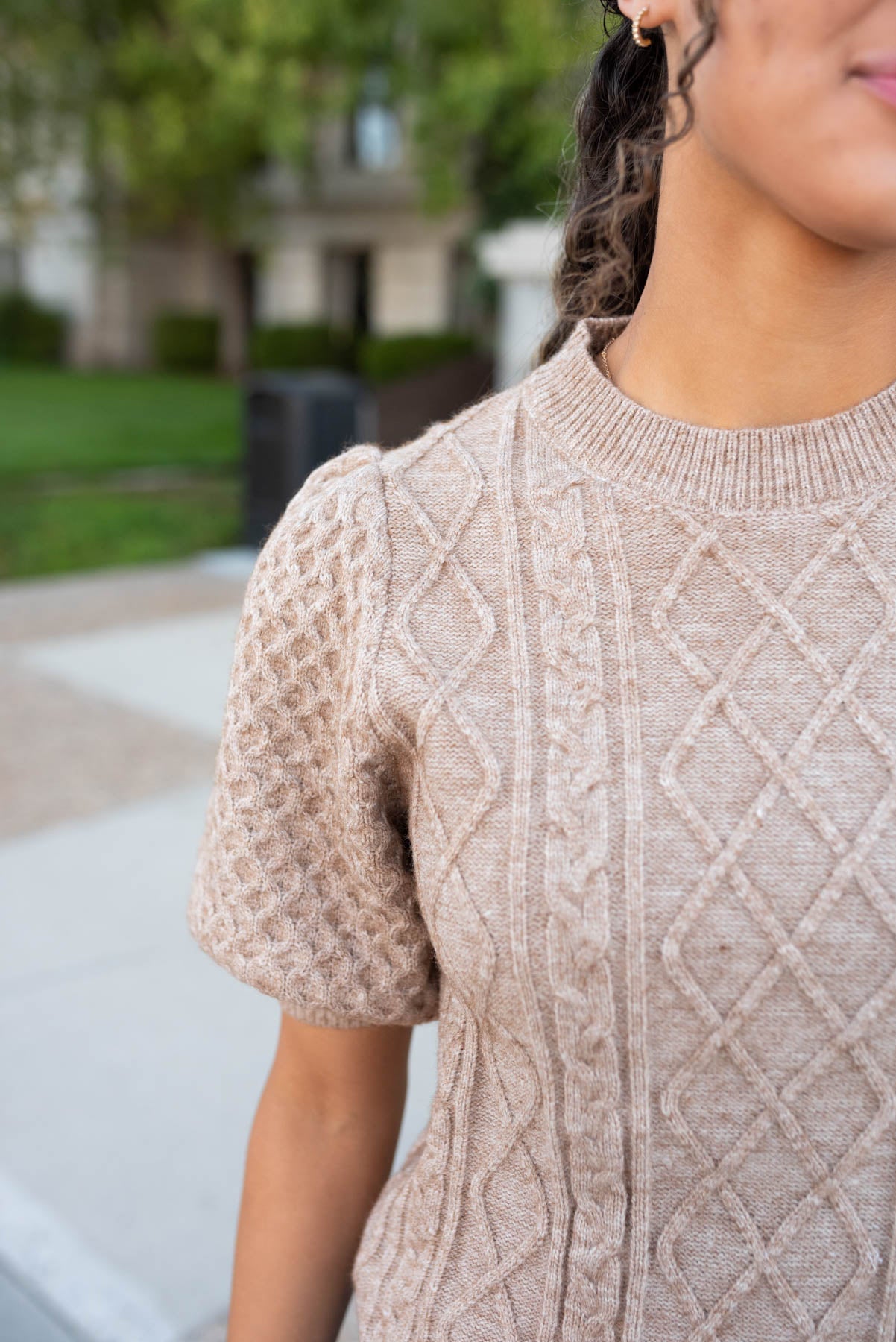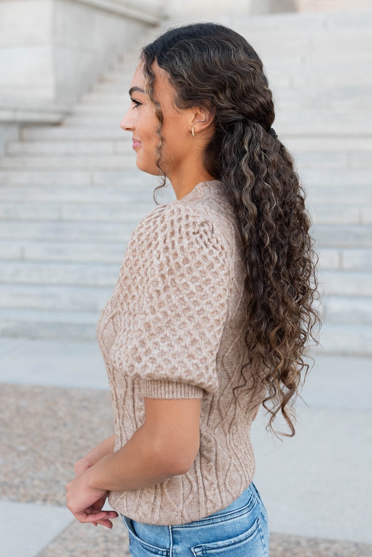 - Pretty cable knit texture through the front and geometric texture in the sleeves