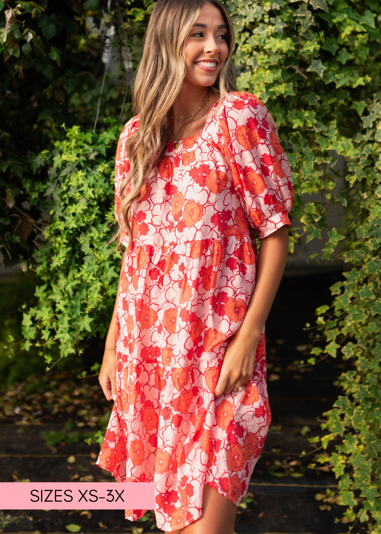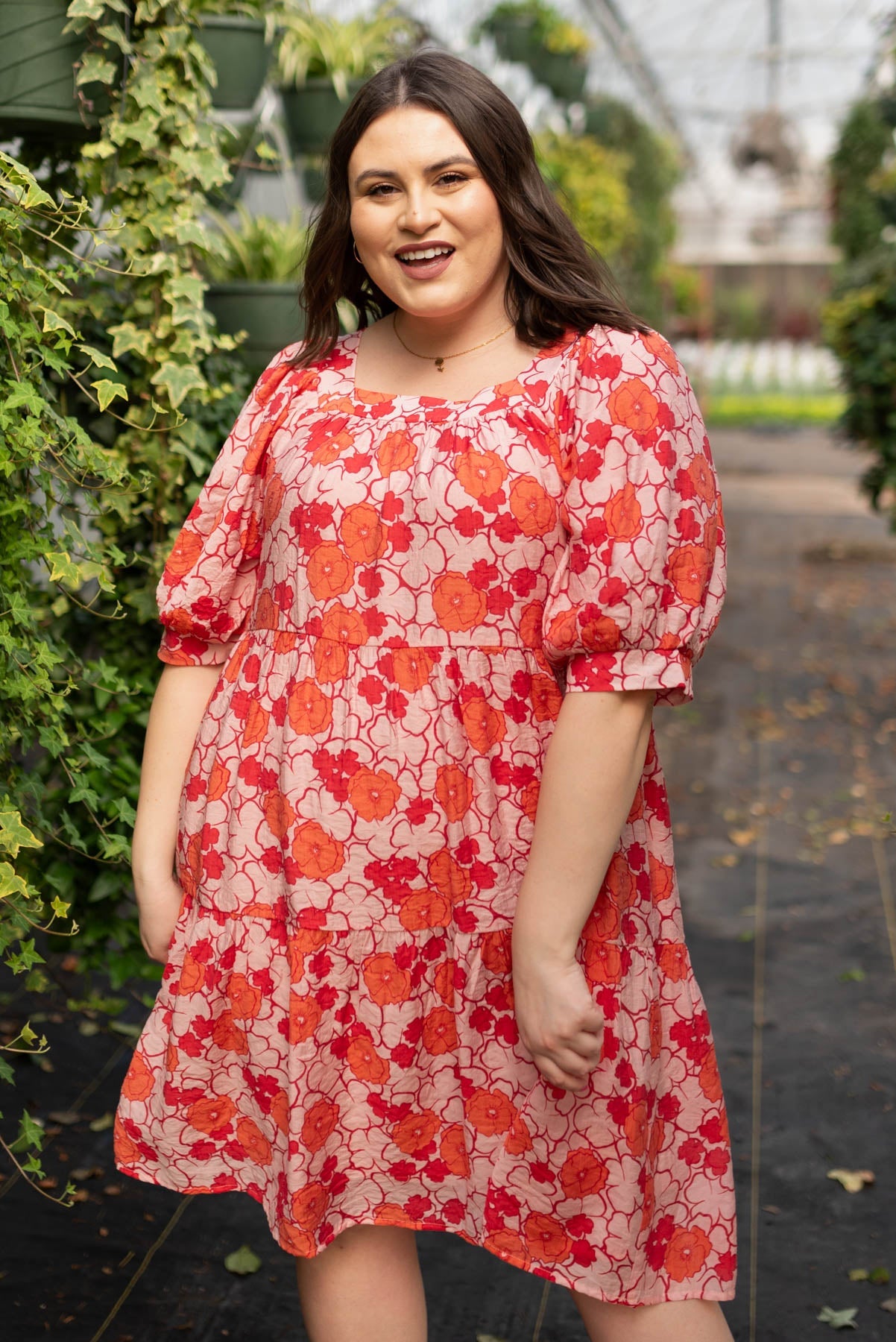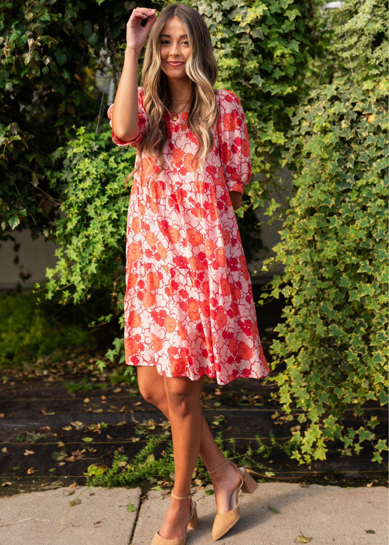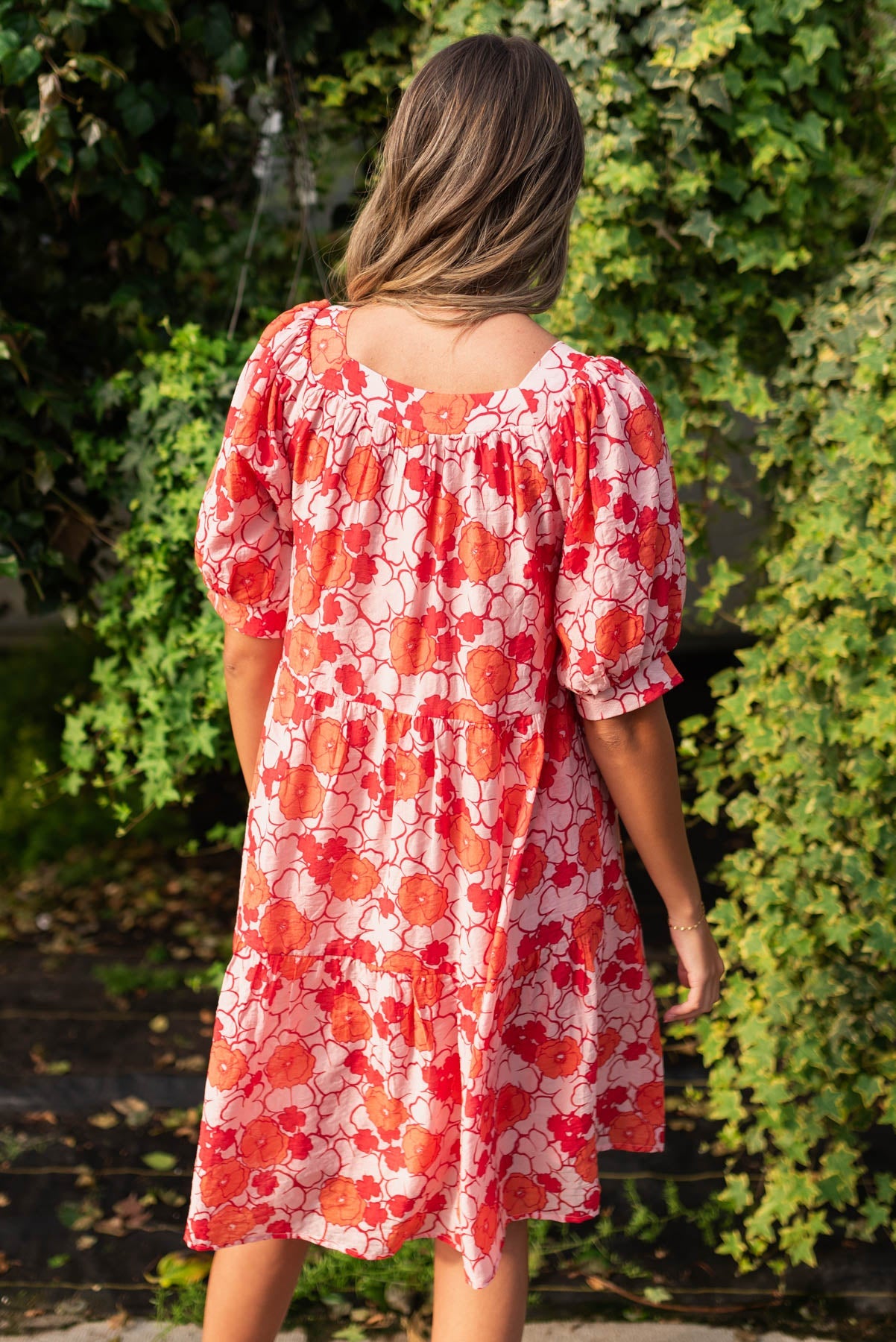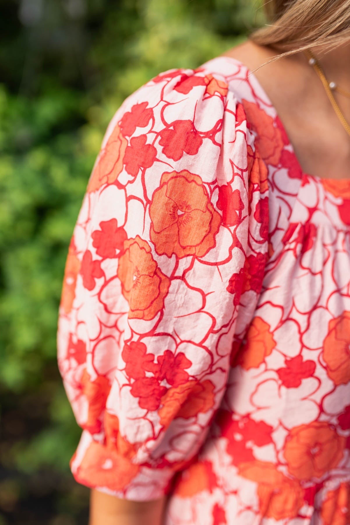 - Beautiful bright and vibrant floral print in shades of pink, peach, and orange