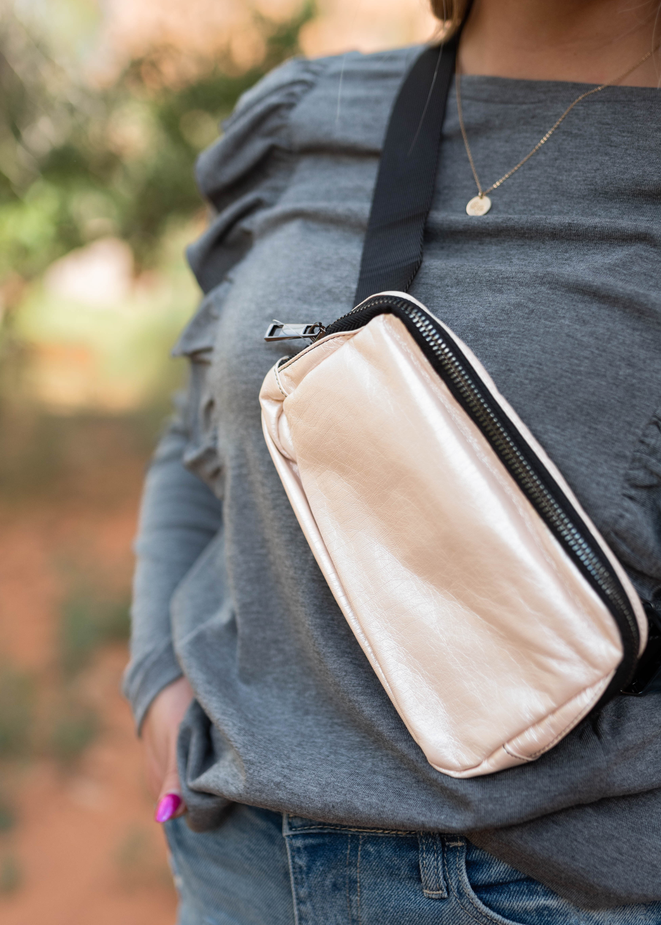 Description. Buckle strap, top and back zipper pockets, vegan leather
