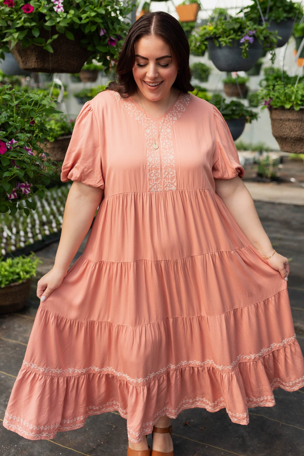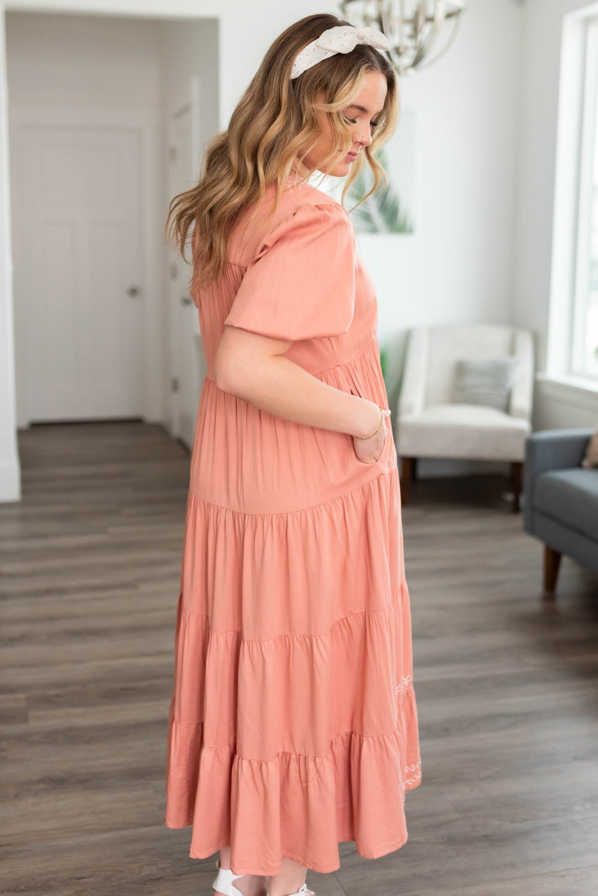 - Geometric embroidery along the neckline and bottom tiers of the skirt