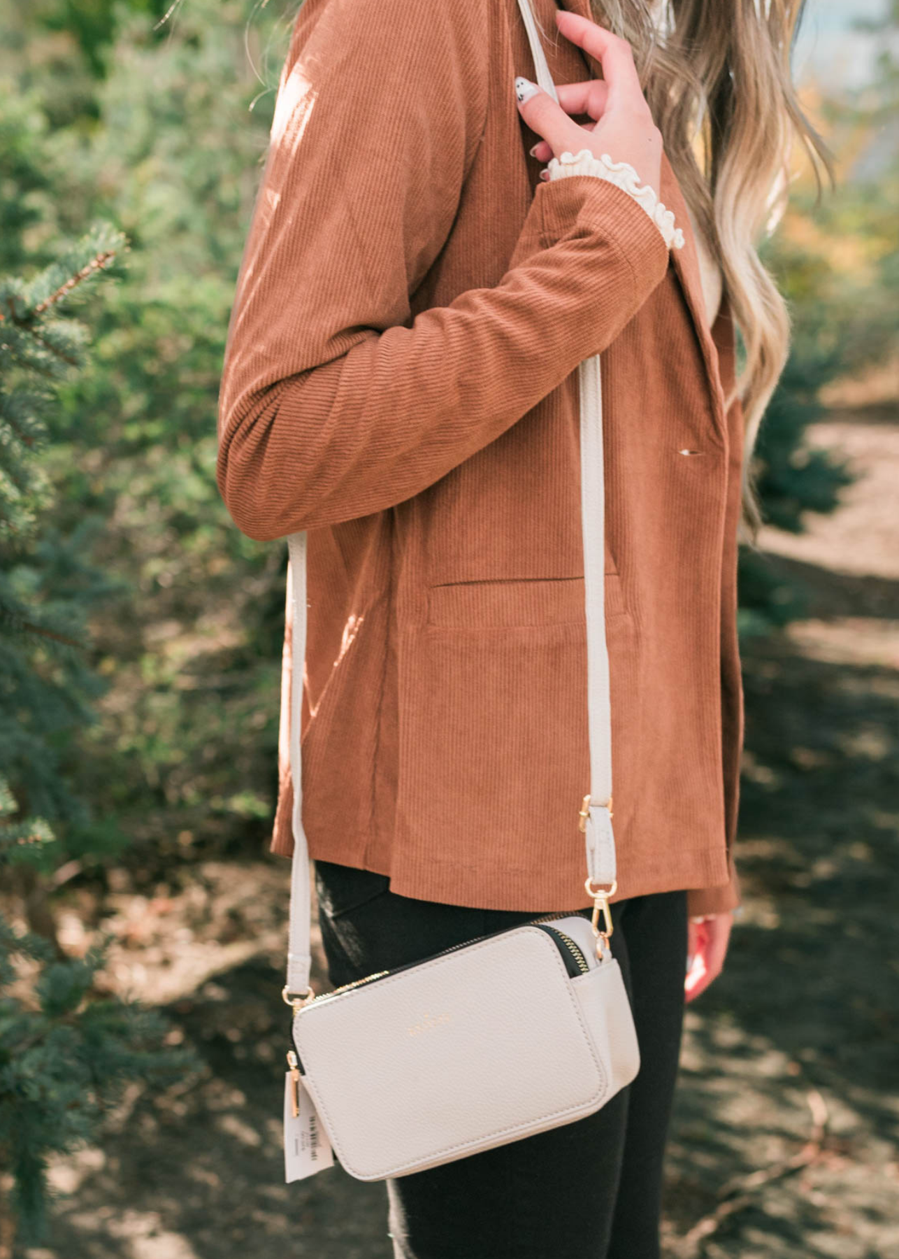 Description: Square, Leather, two zip sections but one pocket, adjustable strap