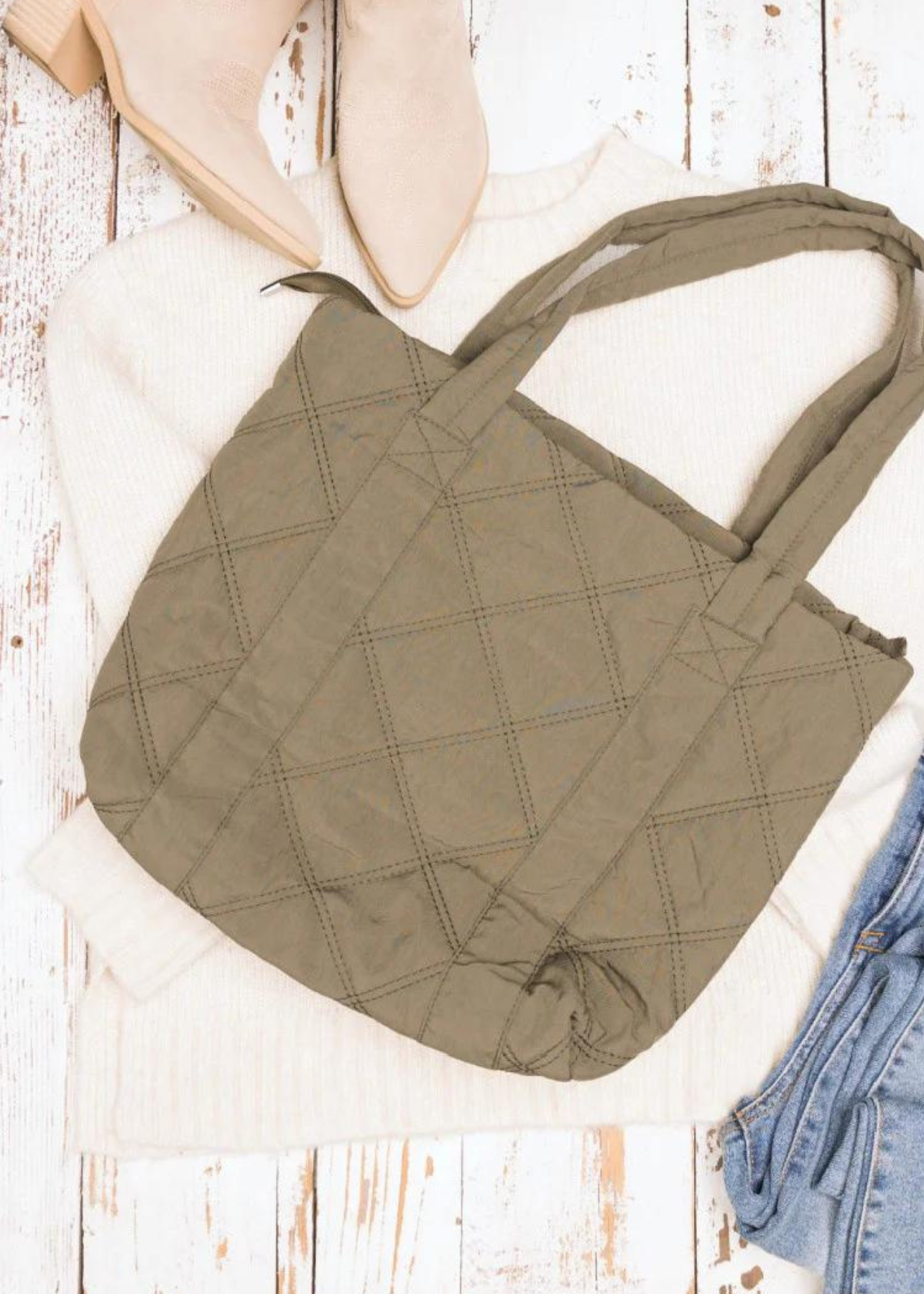Puffed quilted design. Top zipper closure. 100% easy clean polyester. Three open interior sidewall pockets
