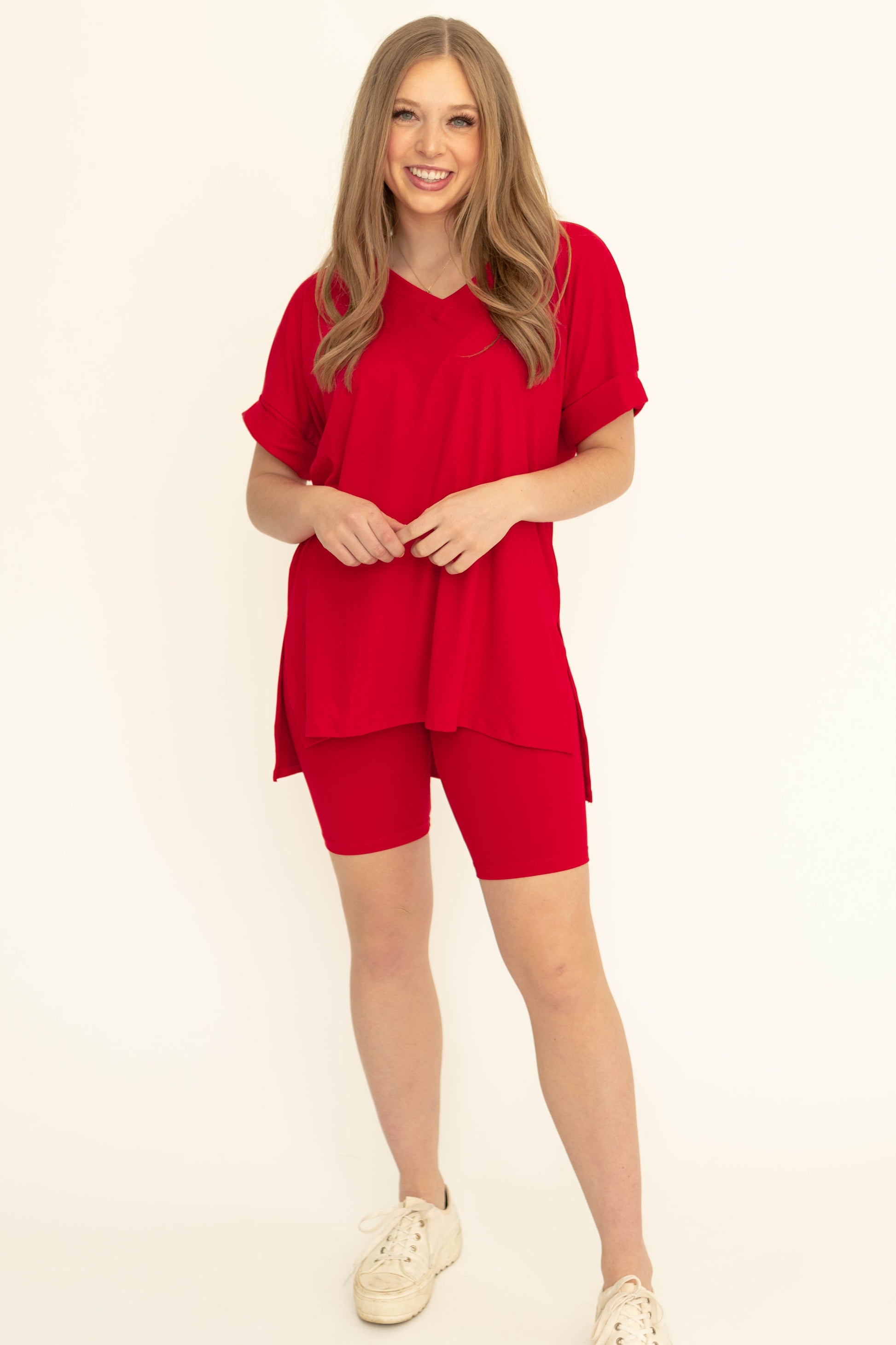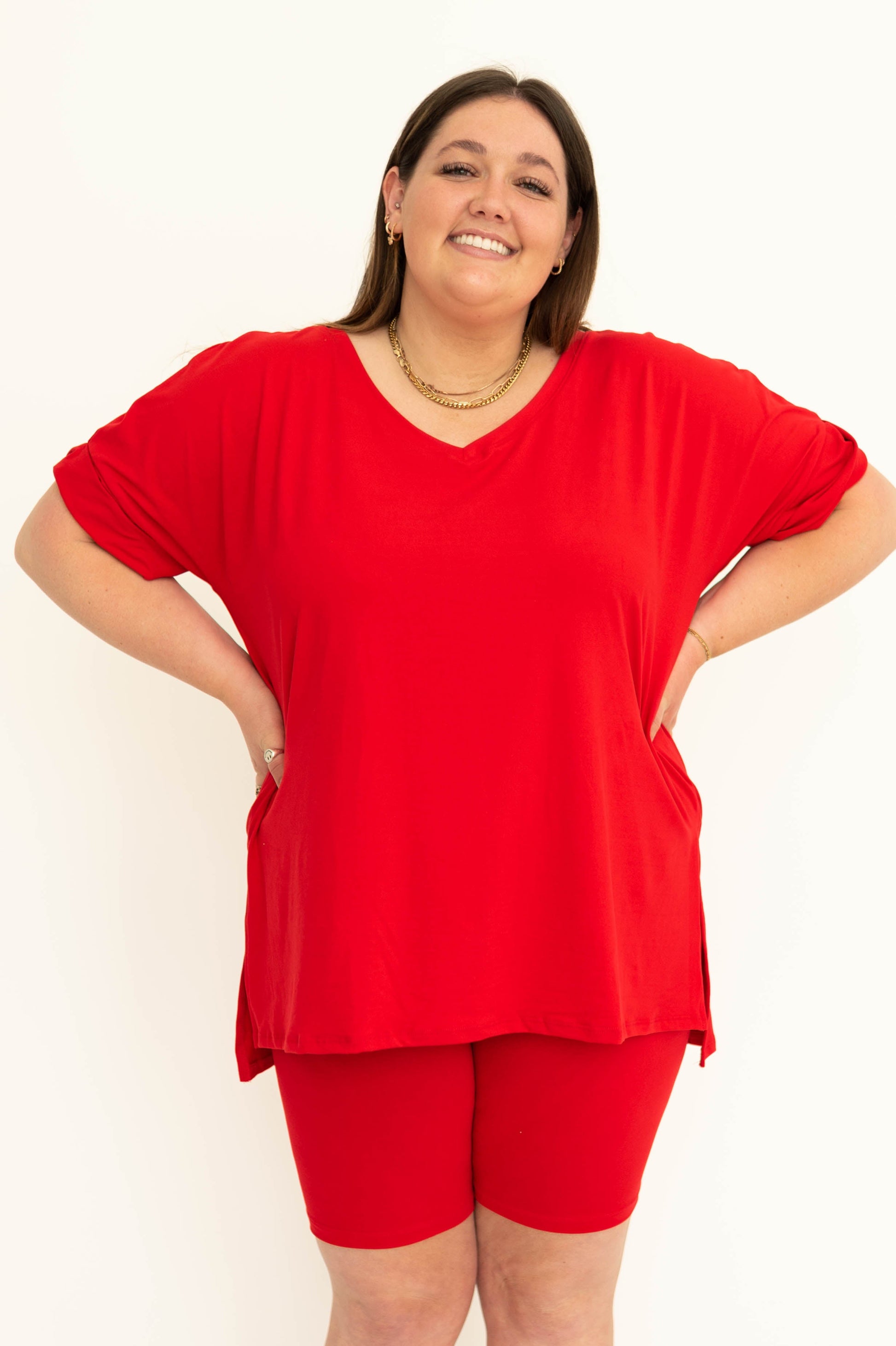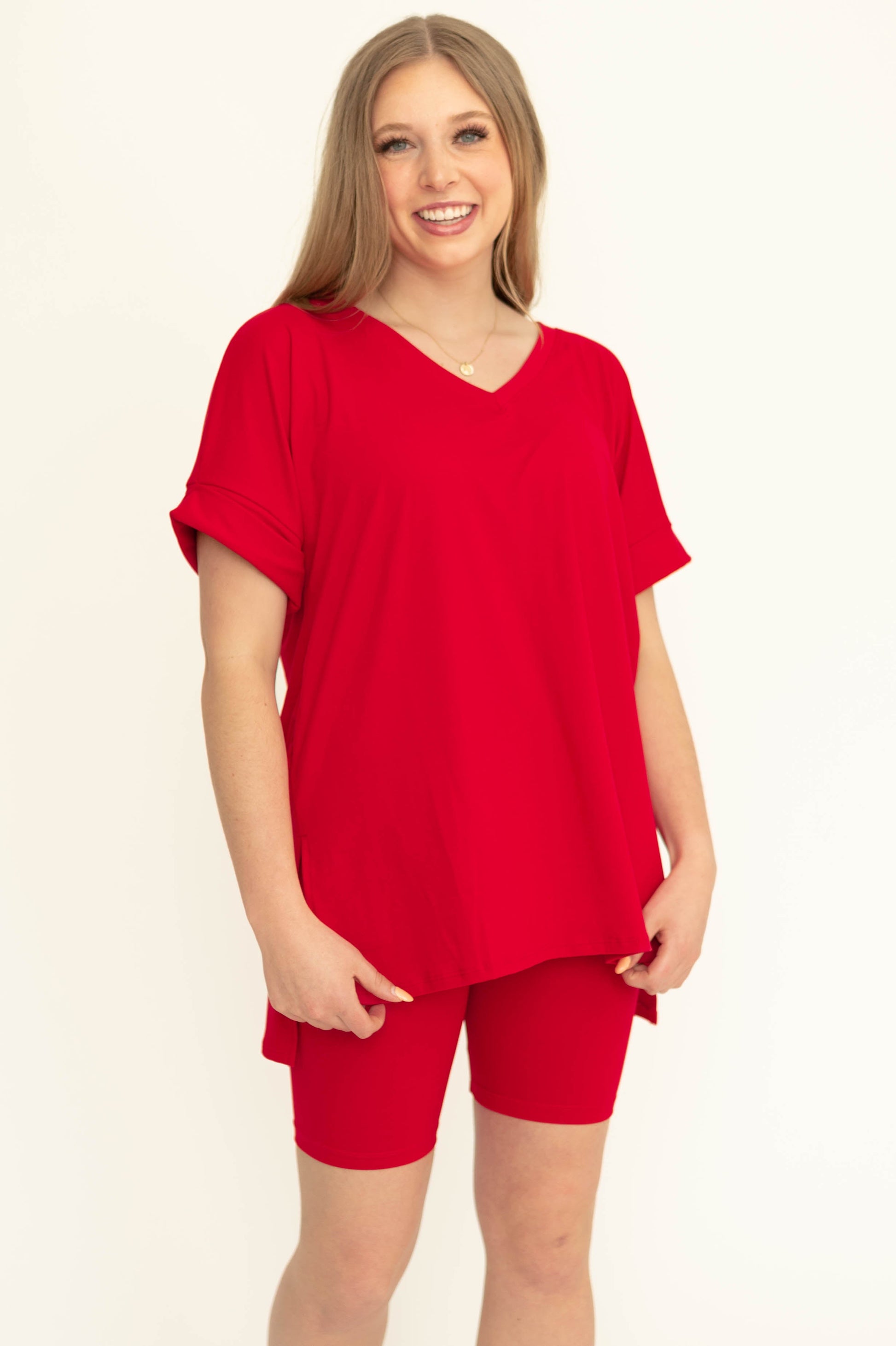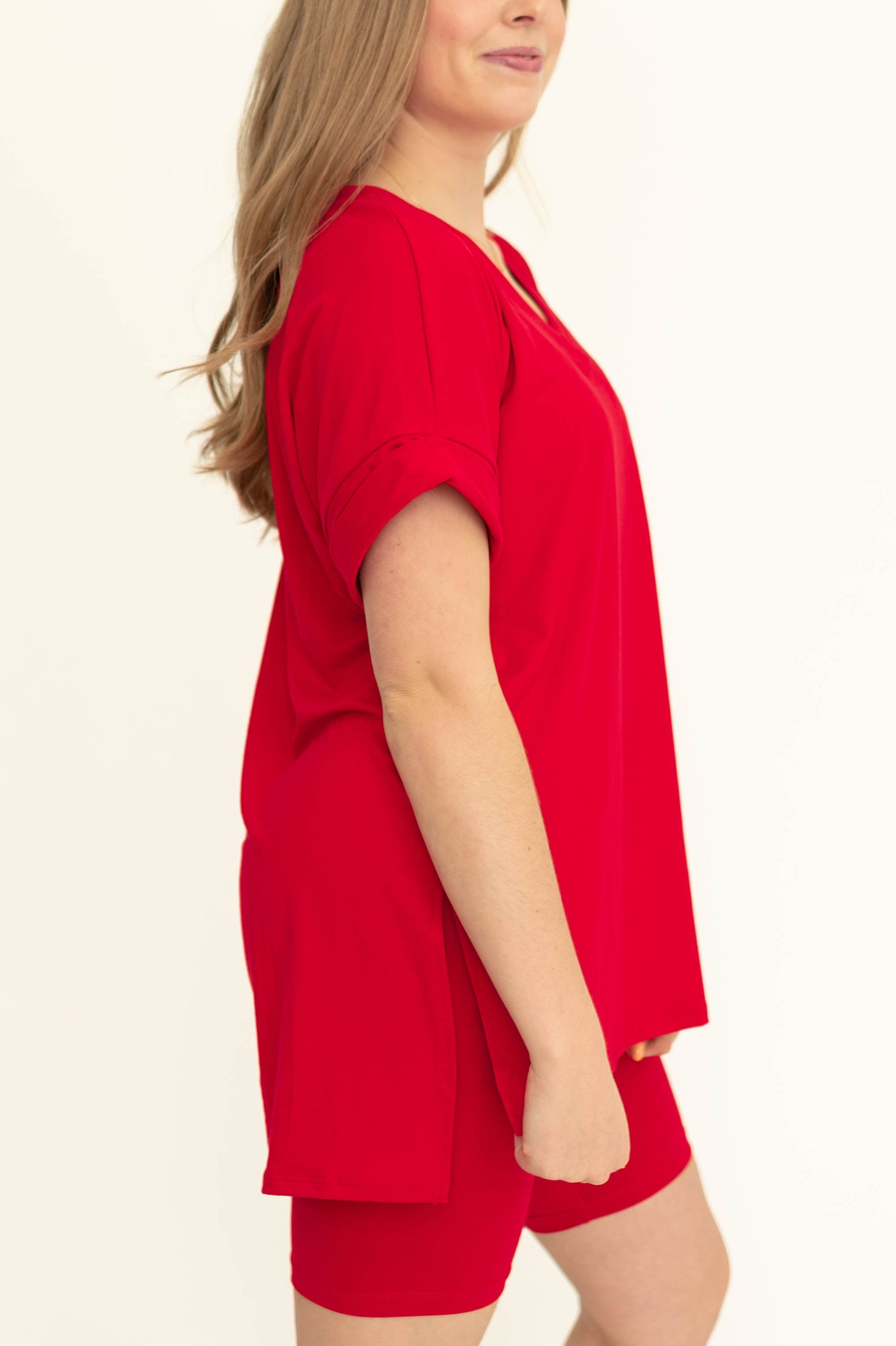 - Flattering v-neckline + cuffed sleeves