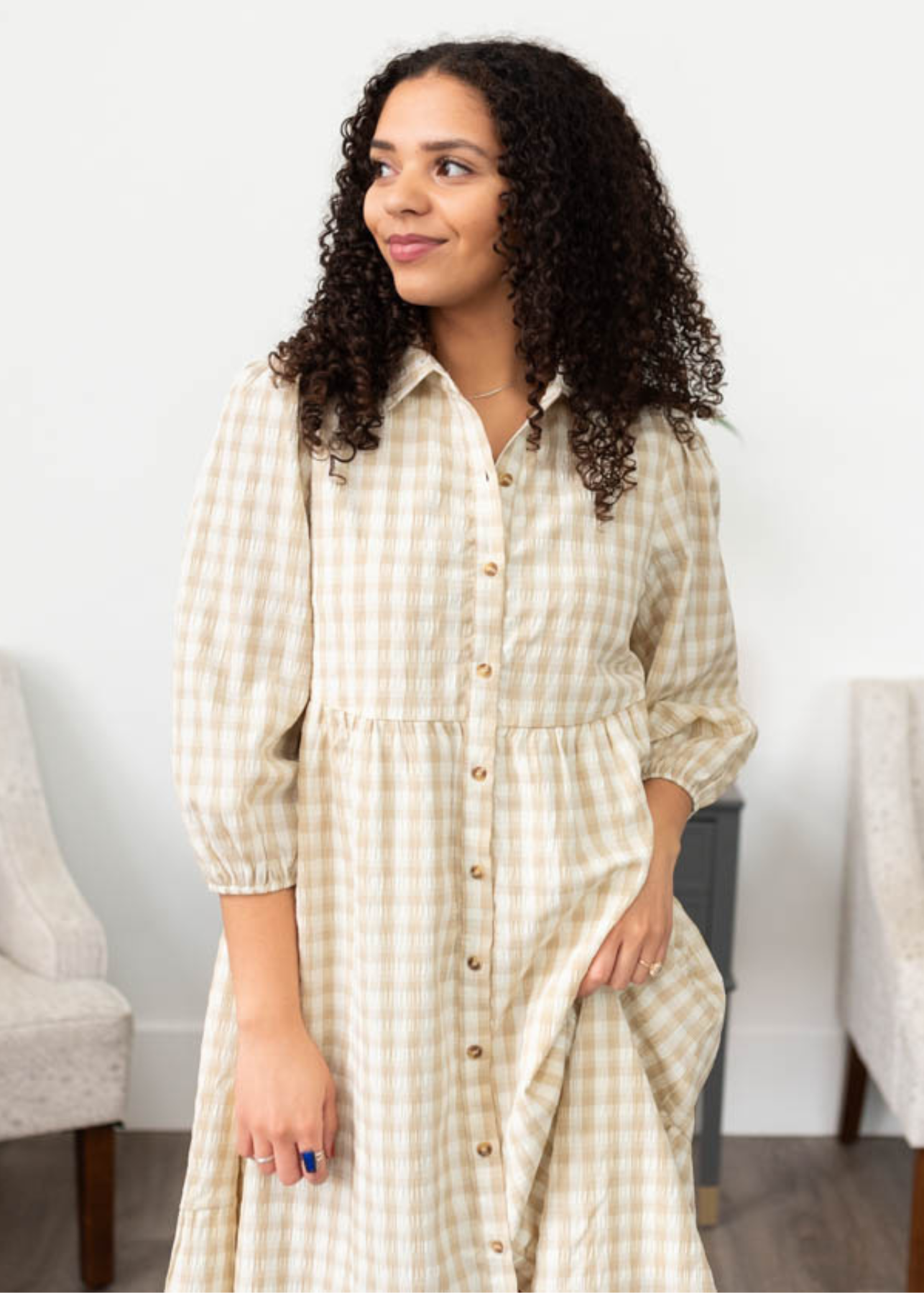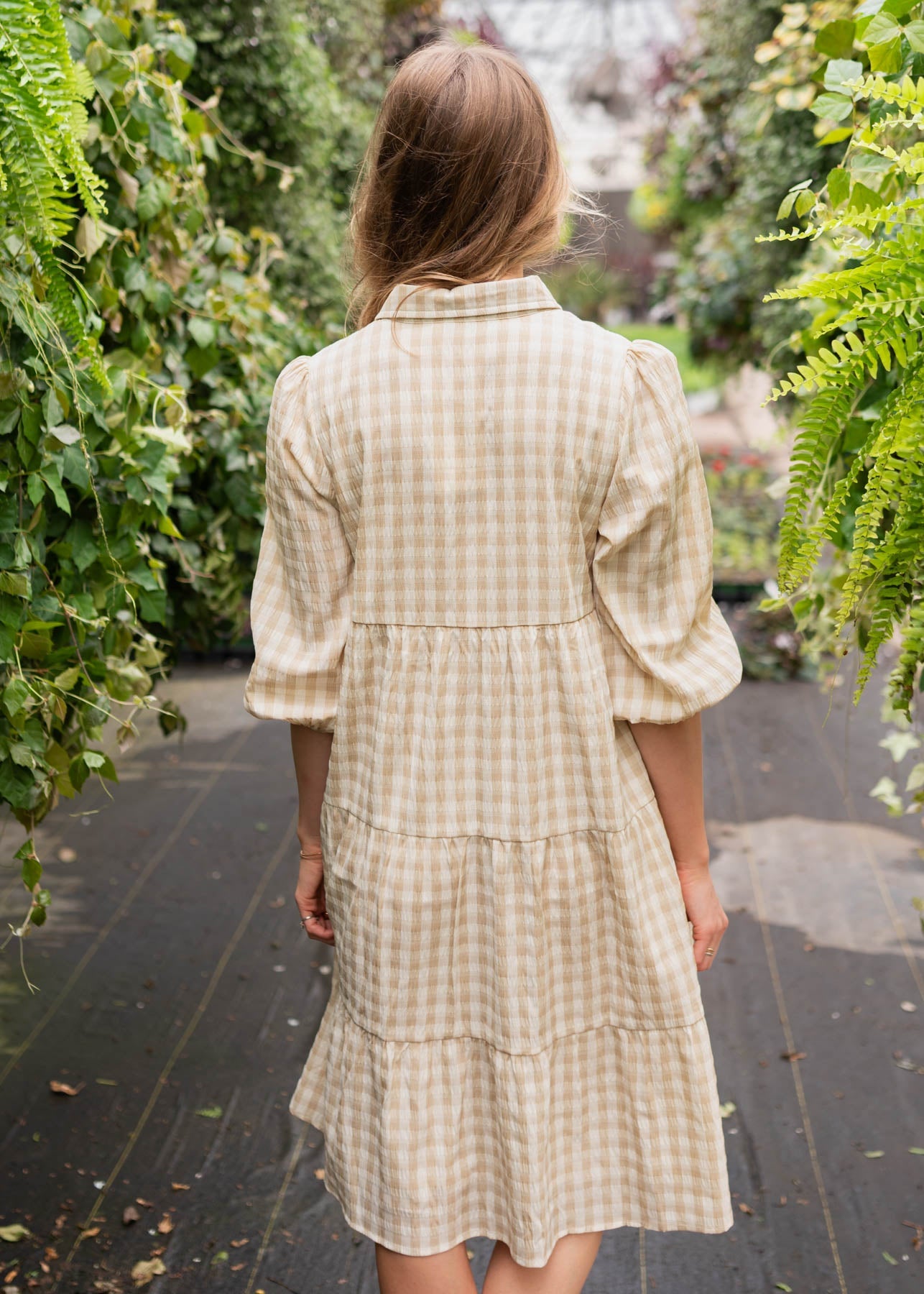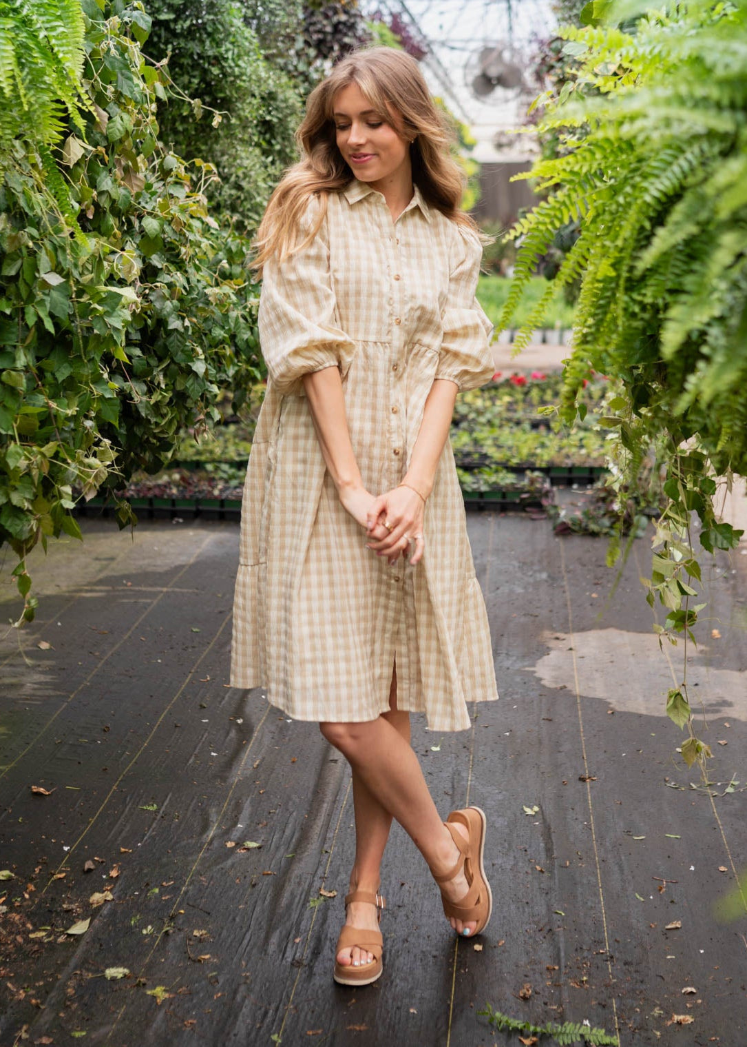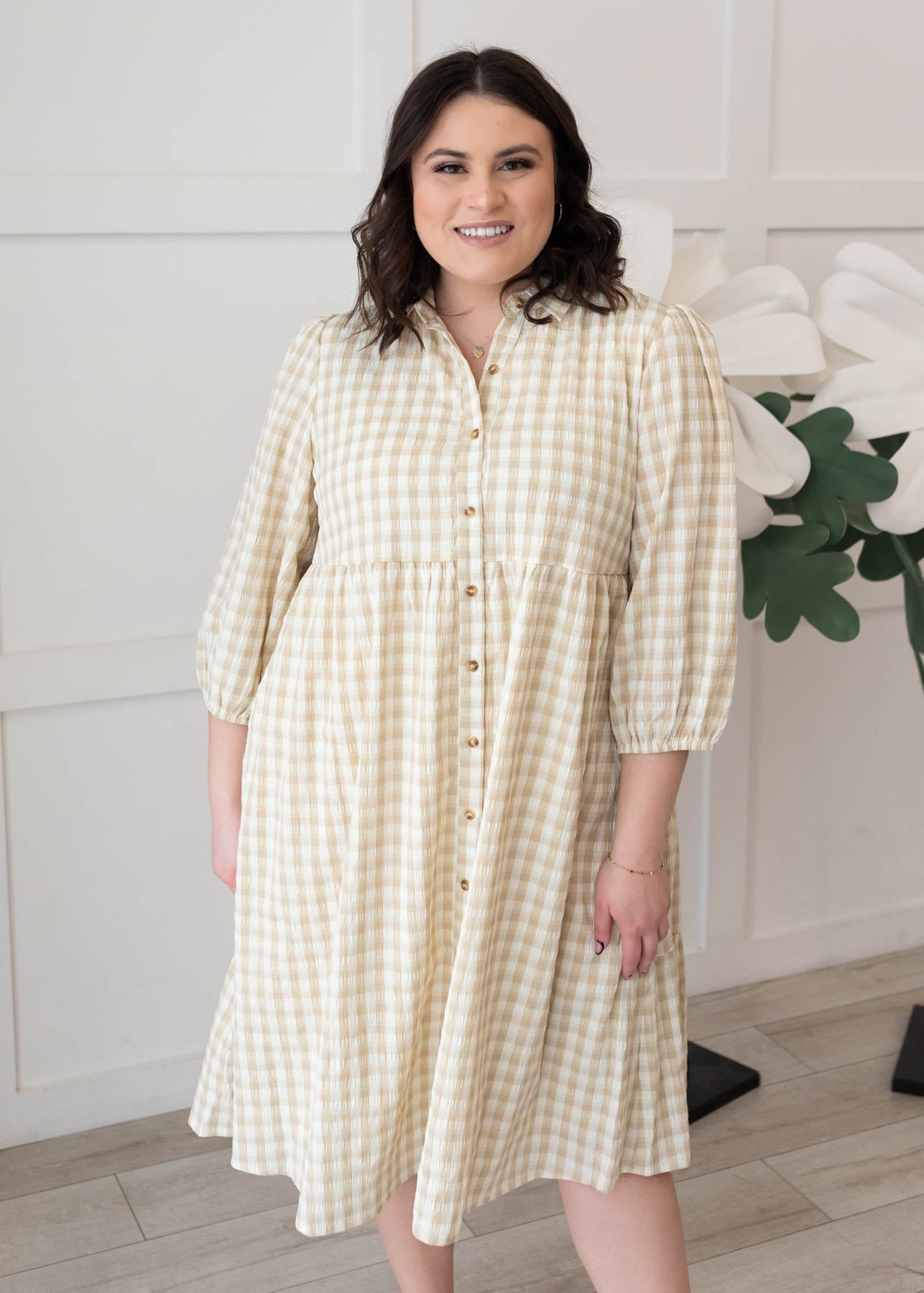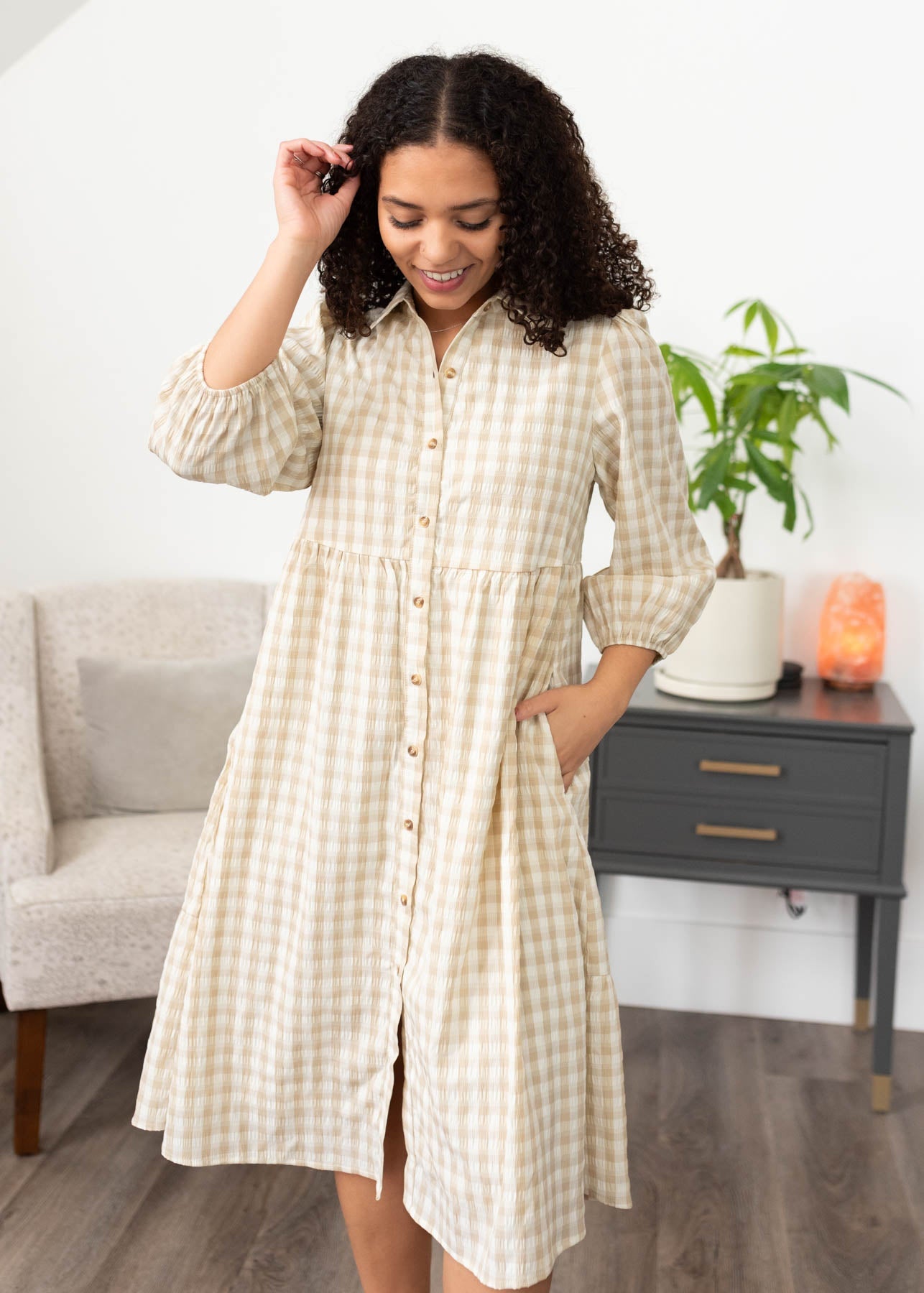 Cambree Taupe Gingham Button Down Dress