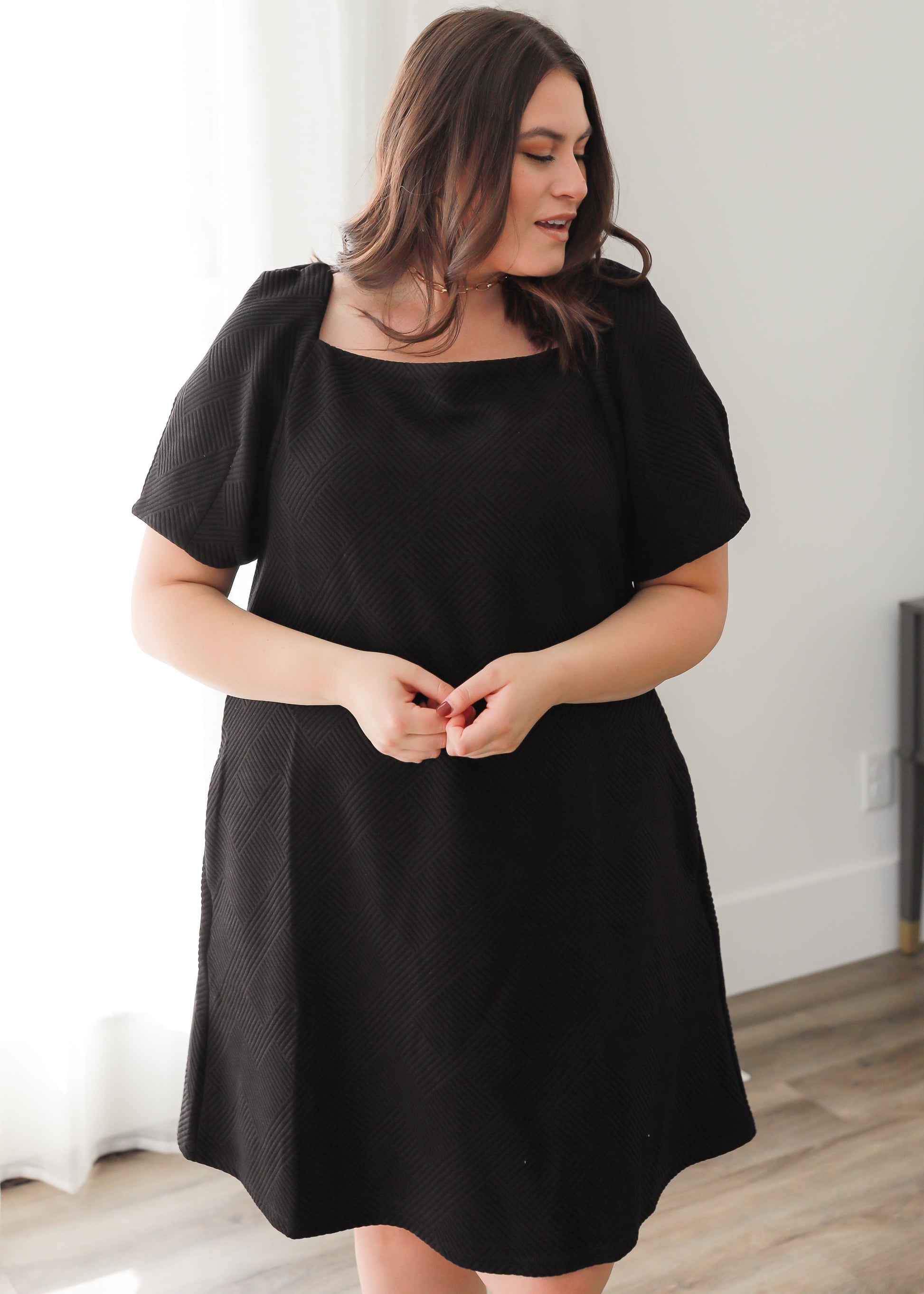 - Trendy square neckline & functioning pockets