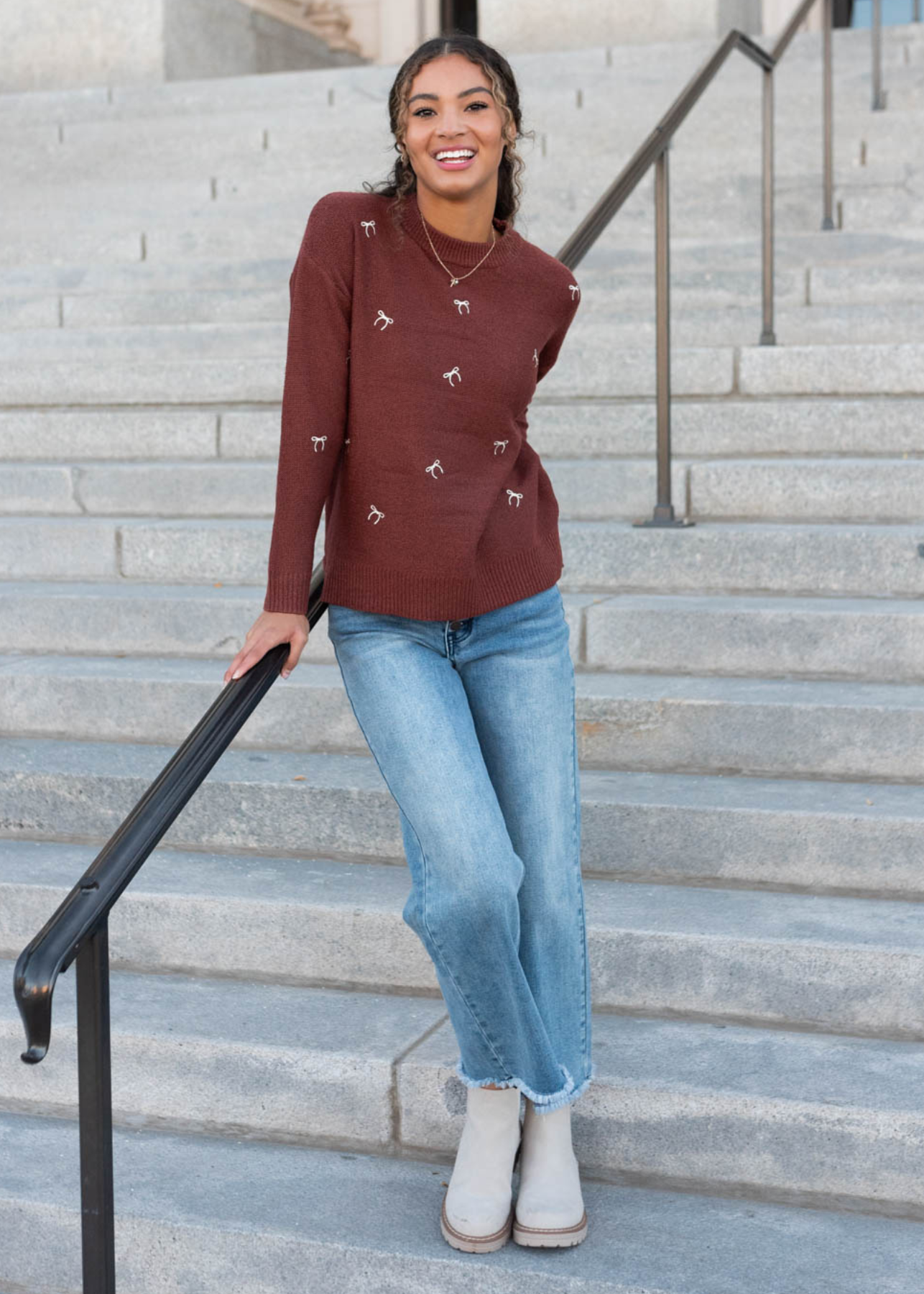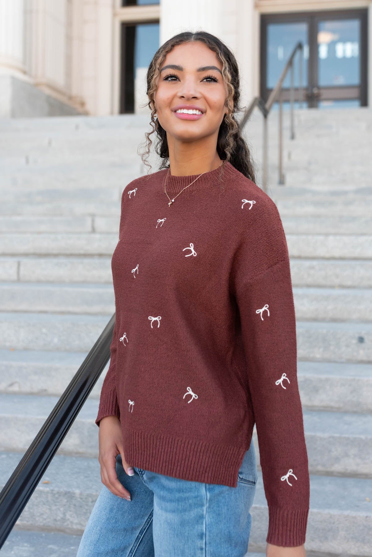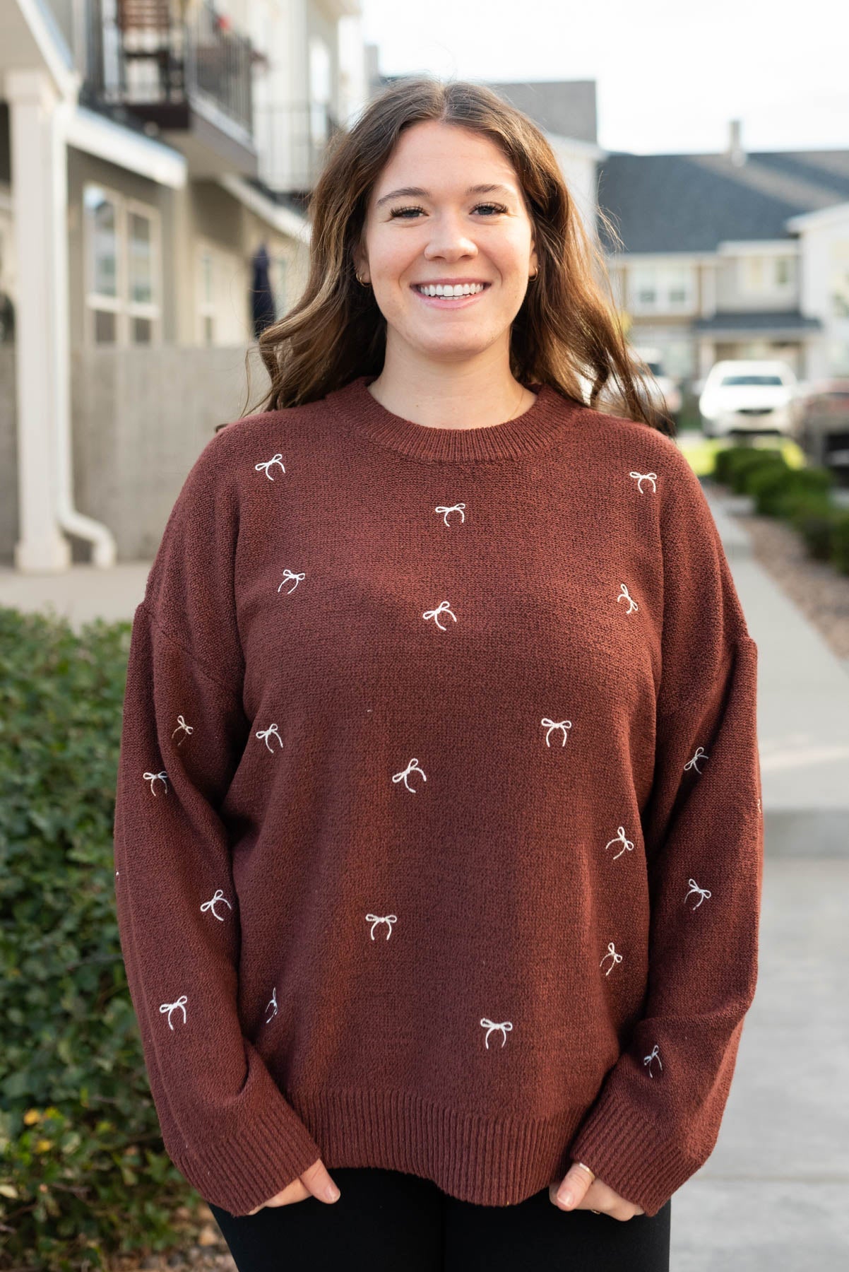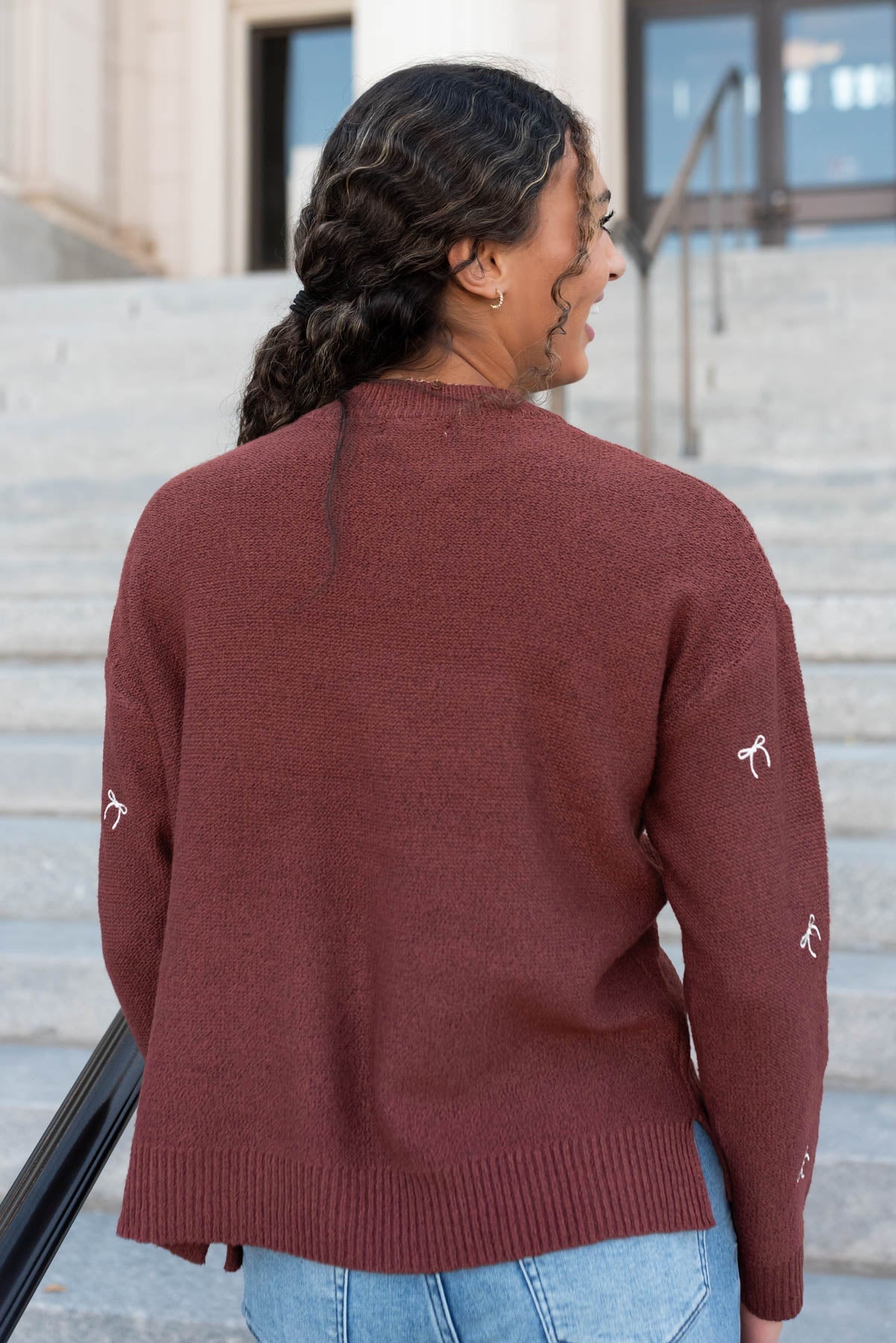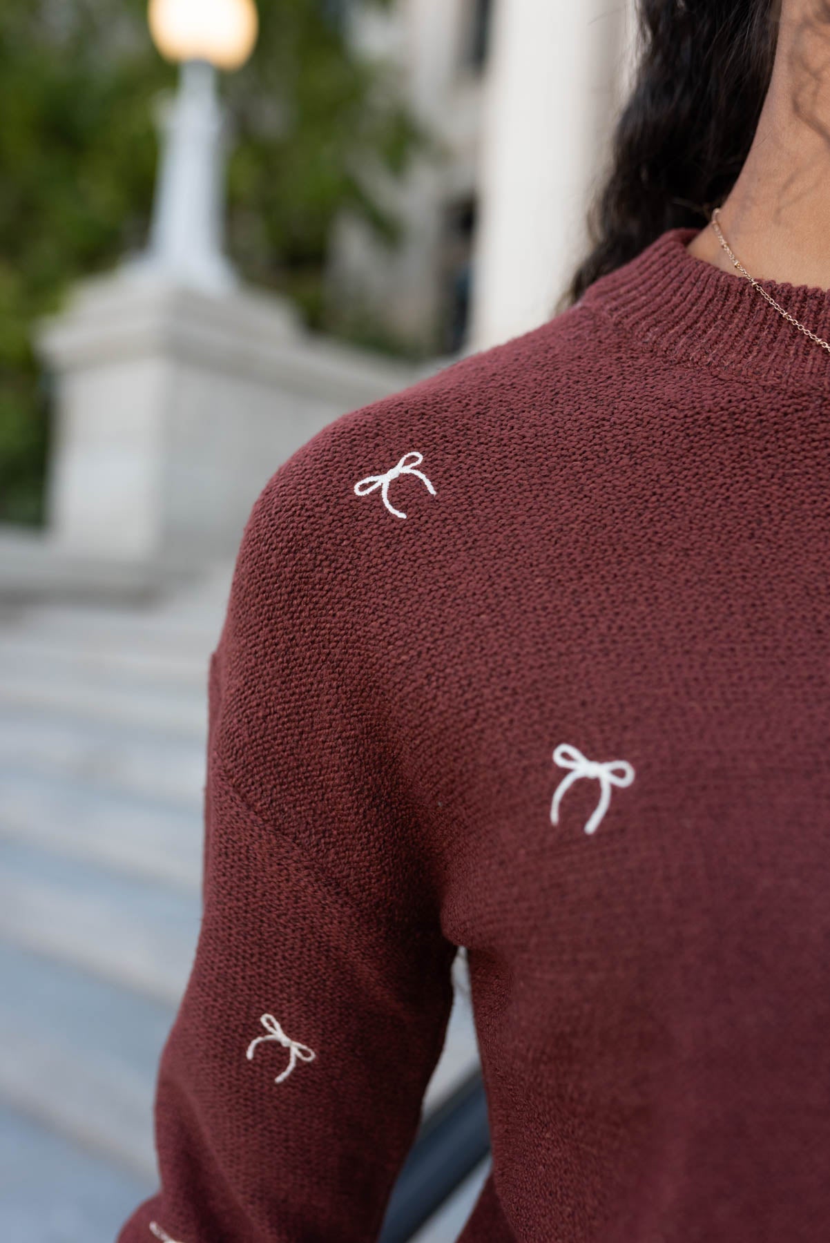 - Tiny embroidered white bows along the front of the sweater