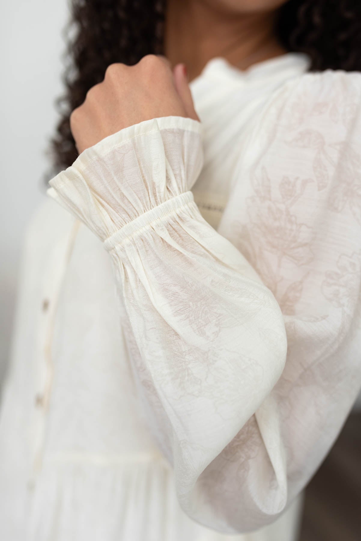 - Beautiful ivory material with subtle floral print