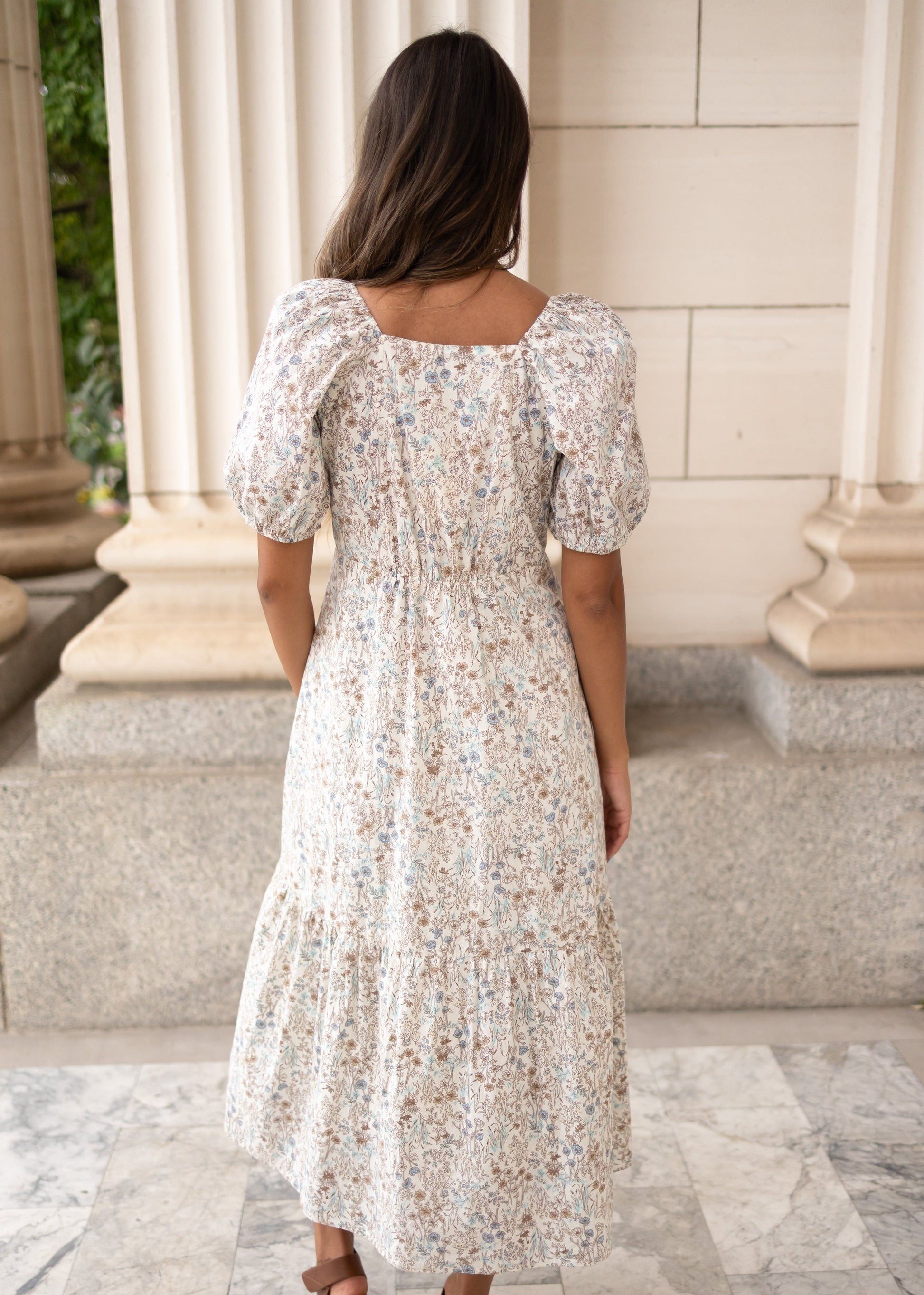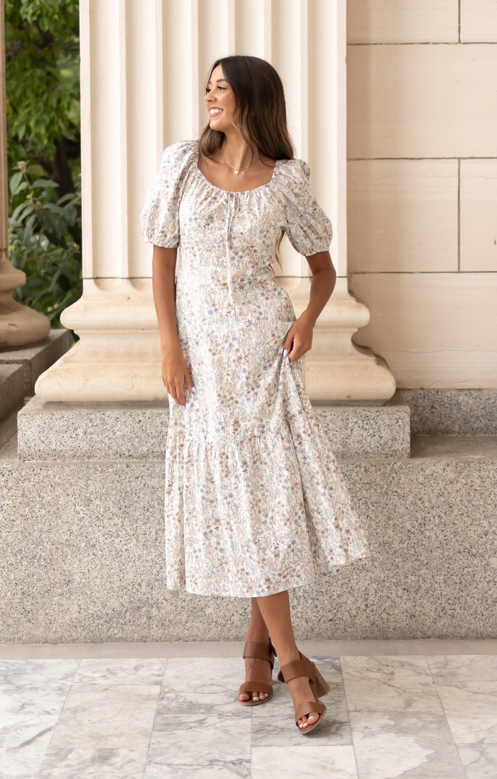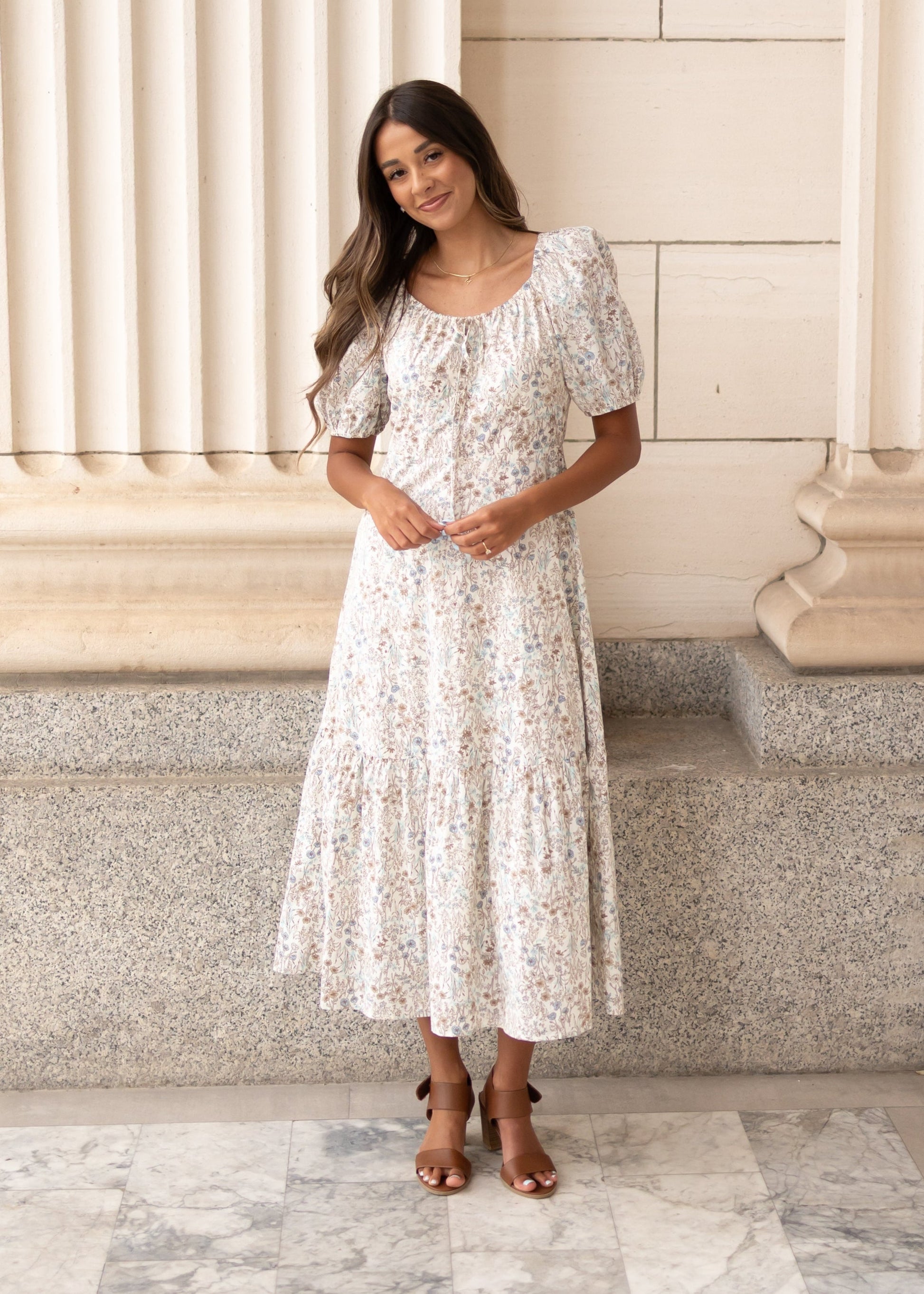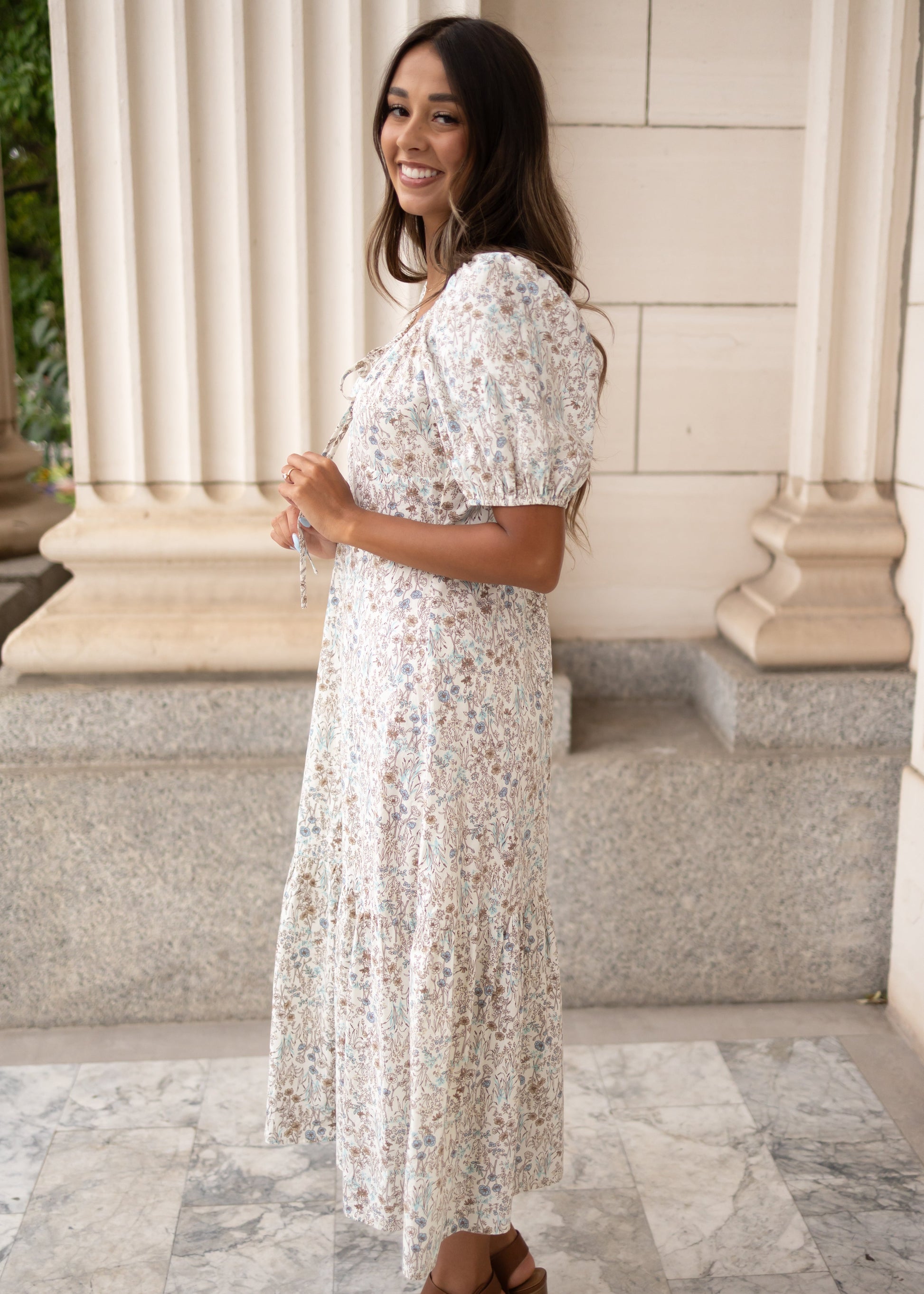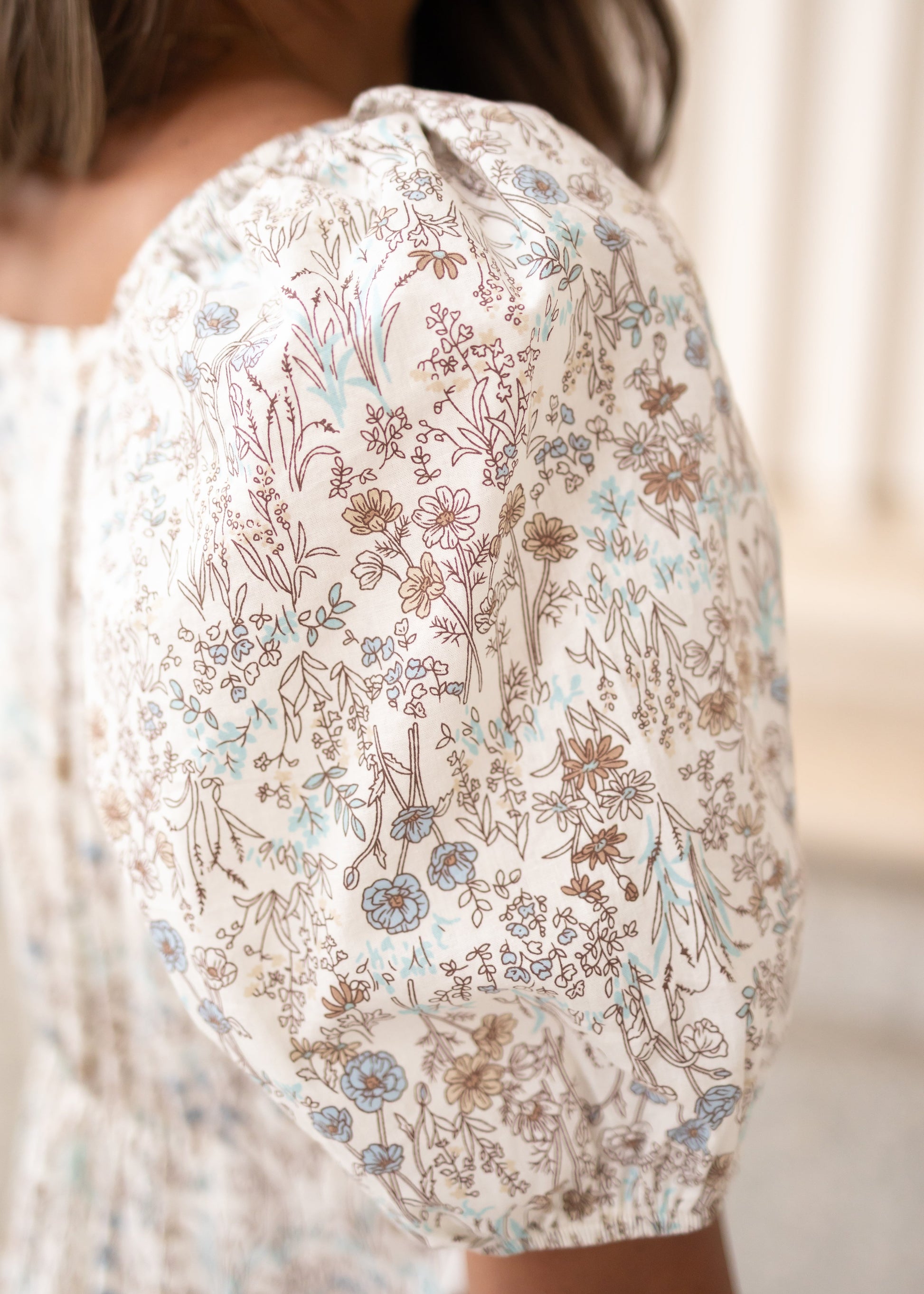 Soft, feminine, and full of charm—the Cleo Cream Floral Dress is all about pretty details and easy comfort. With a tie neckline you can adjust to your liking, puff sleeves, and a lovely brown and light blue floral print, Cleo is one of those dresses that just feels special. A Lena Layne exclusive you won’t find anywhere else!