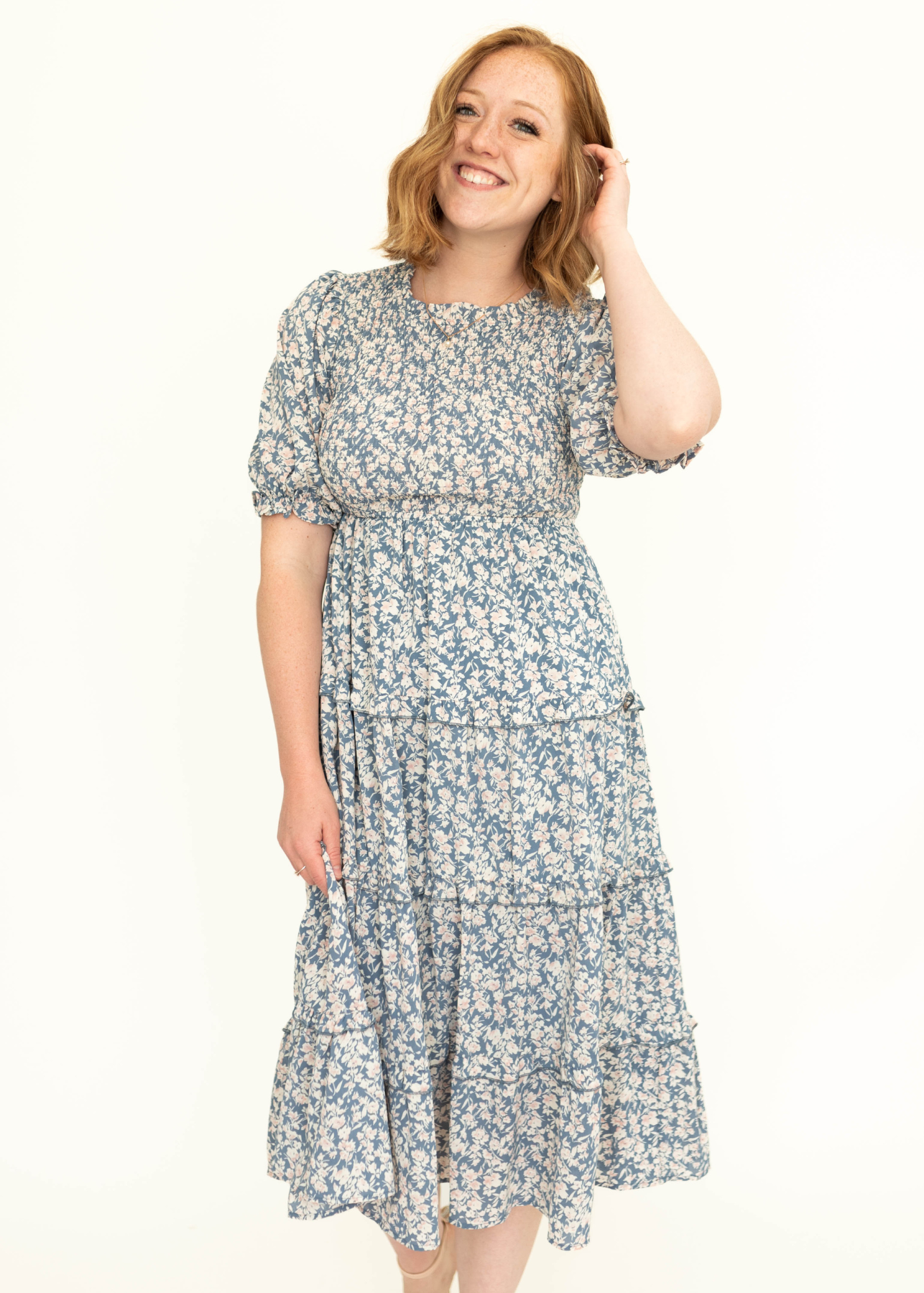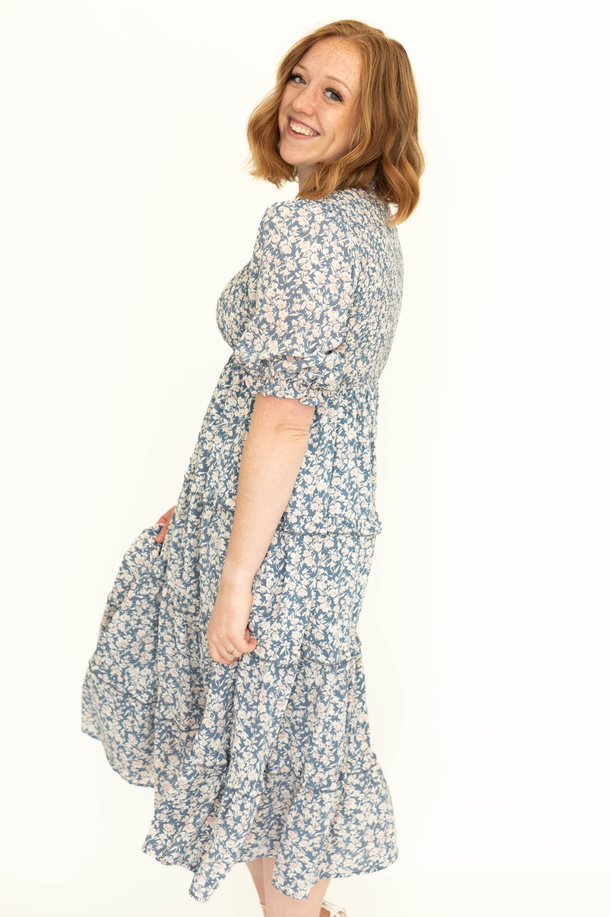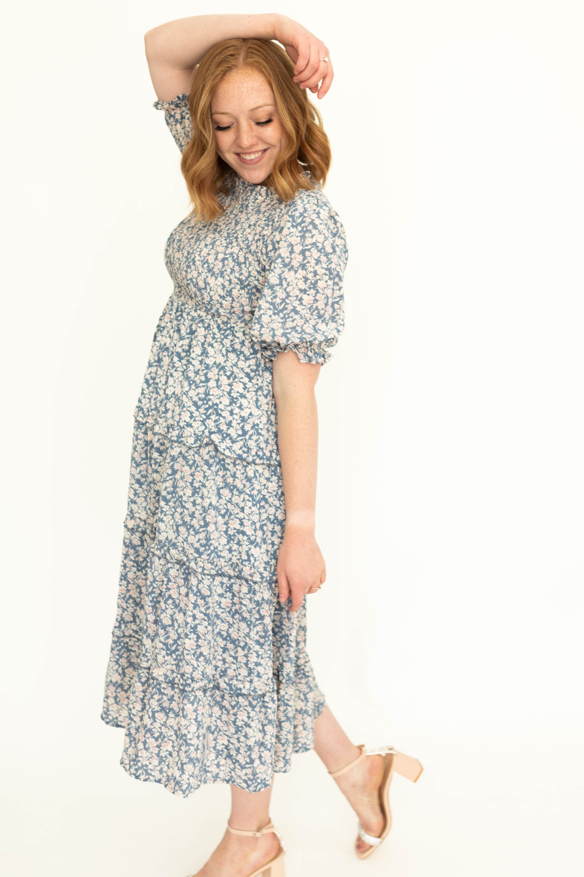 - Flattering puff sleeves + ruffled tiered skirt