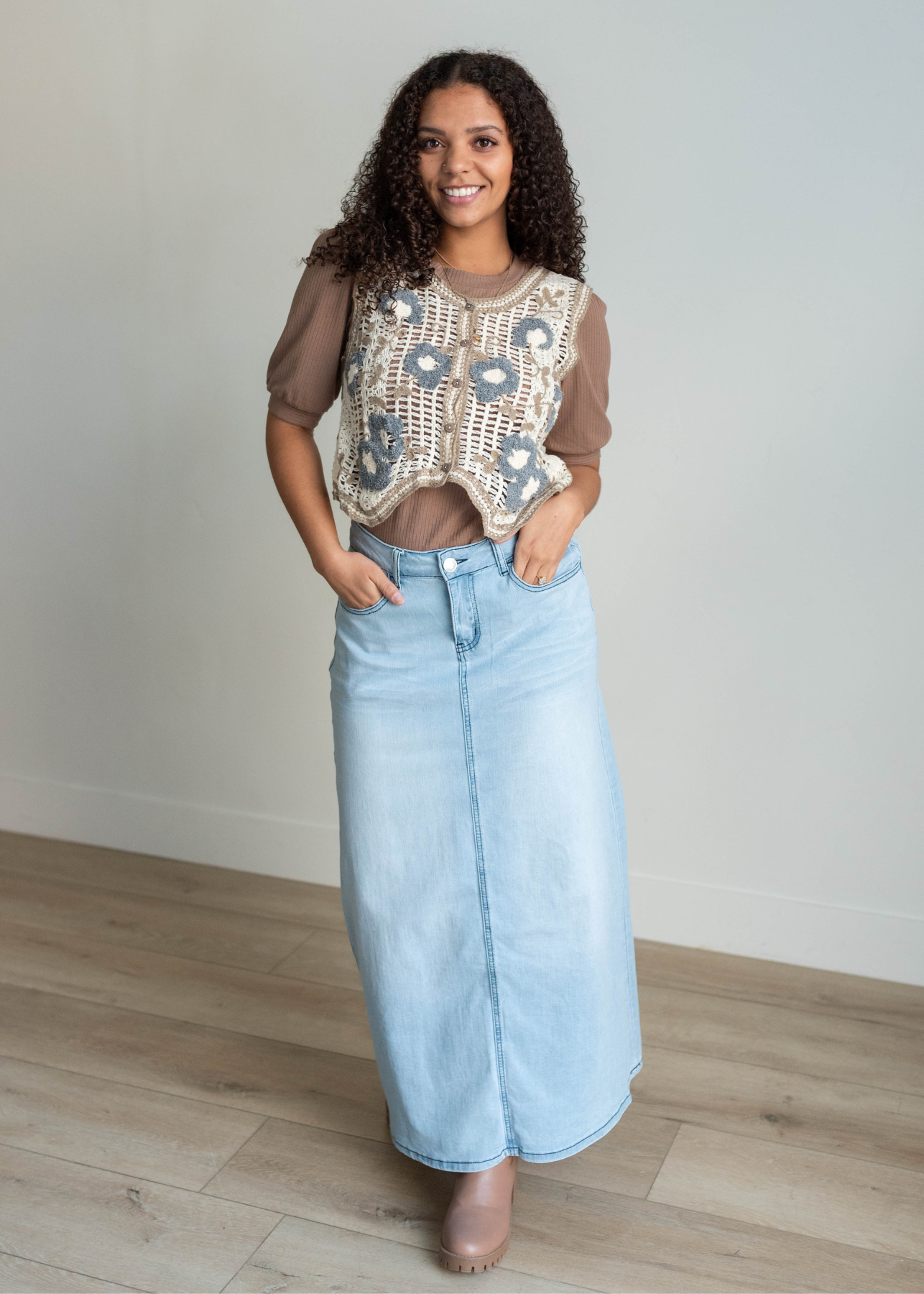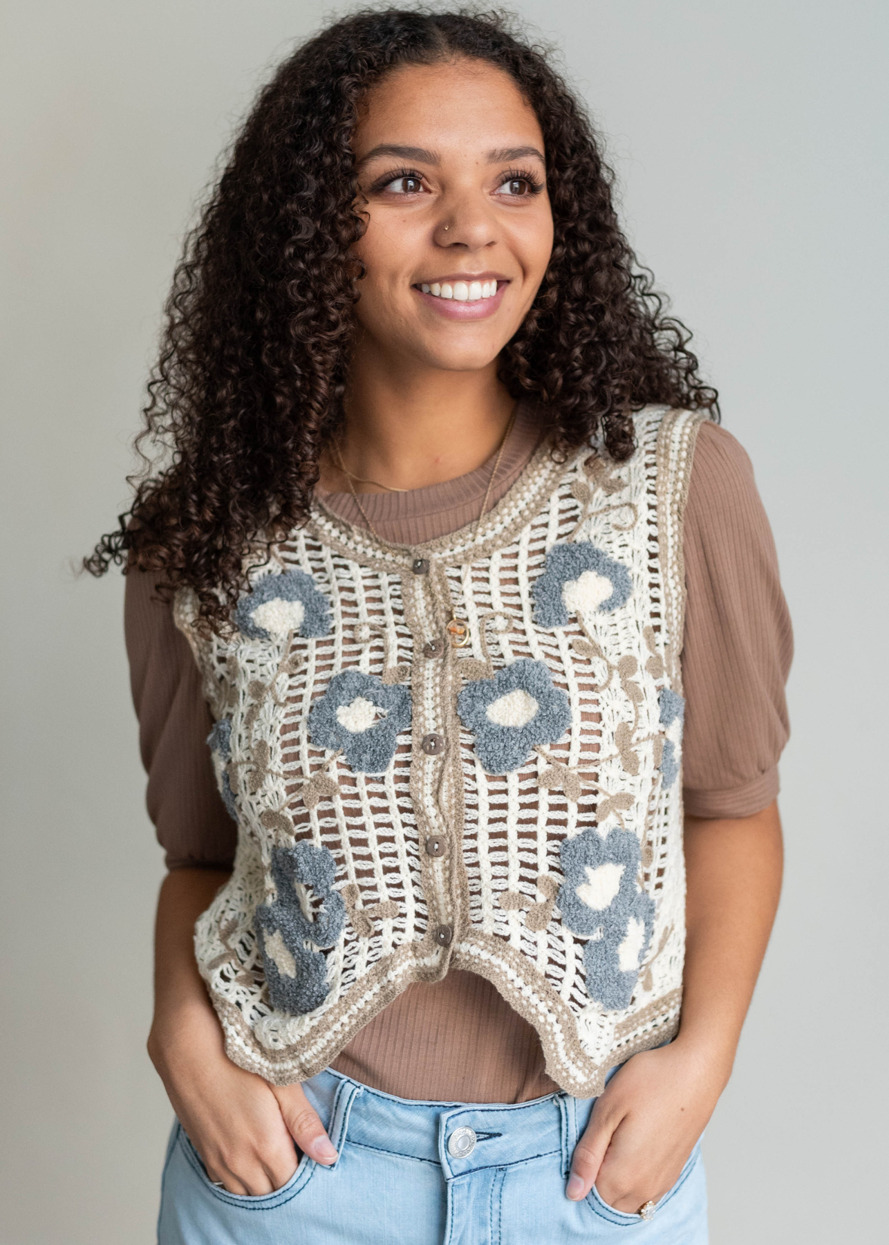 - Lightweight and delicate crocheted material with embroidered floral put on top