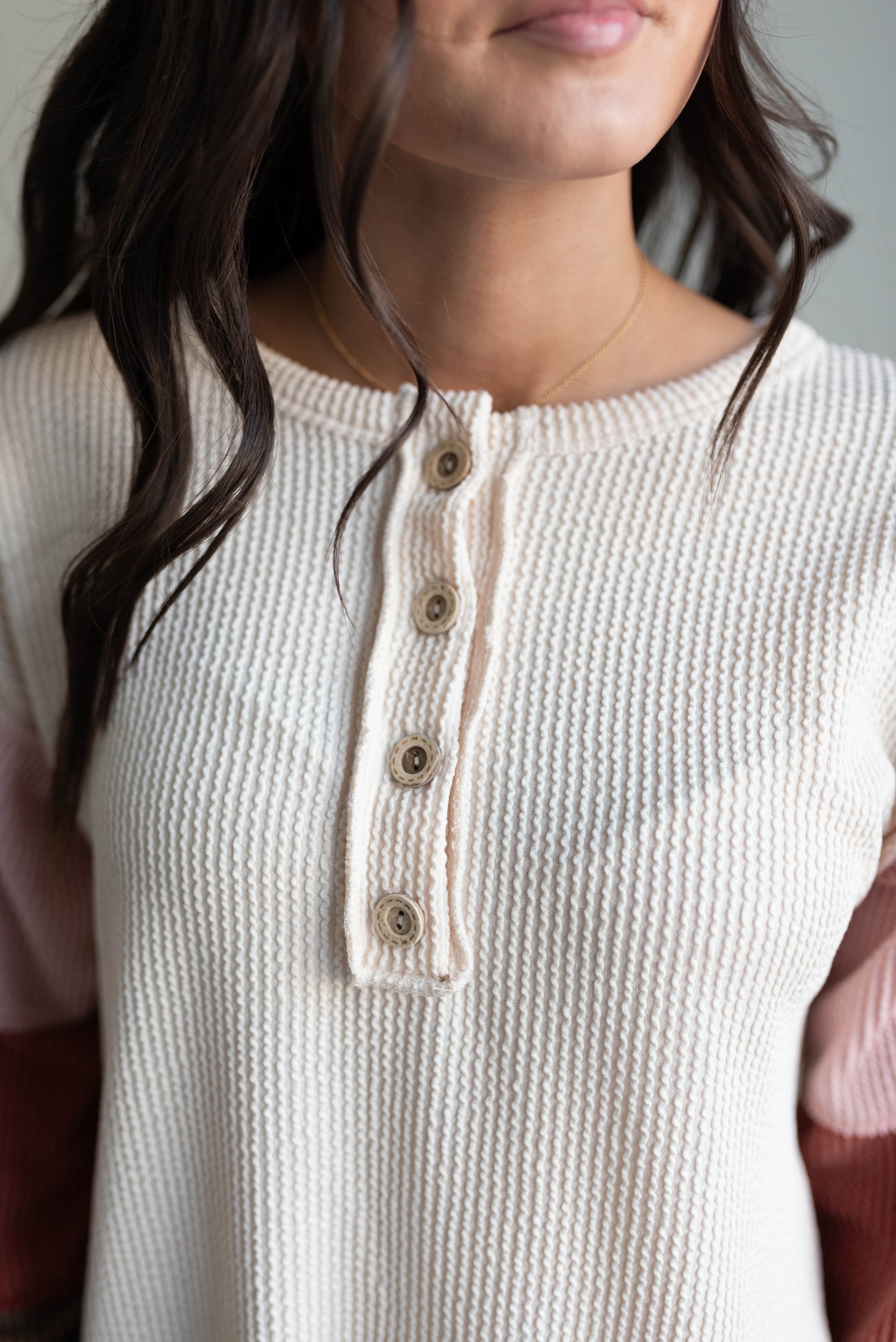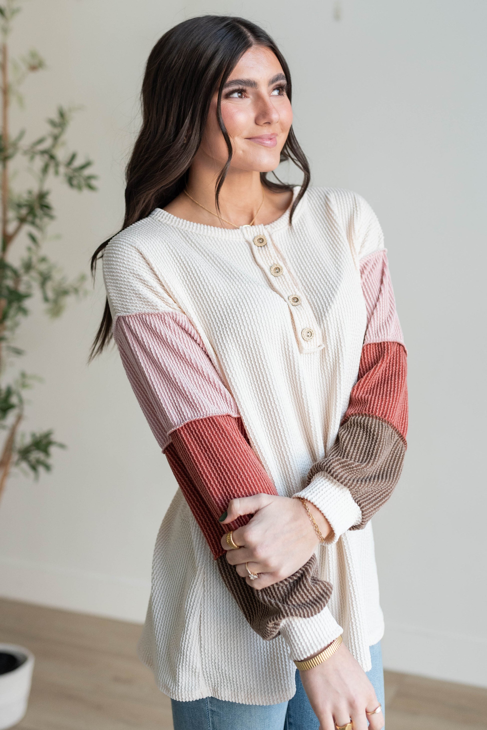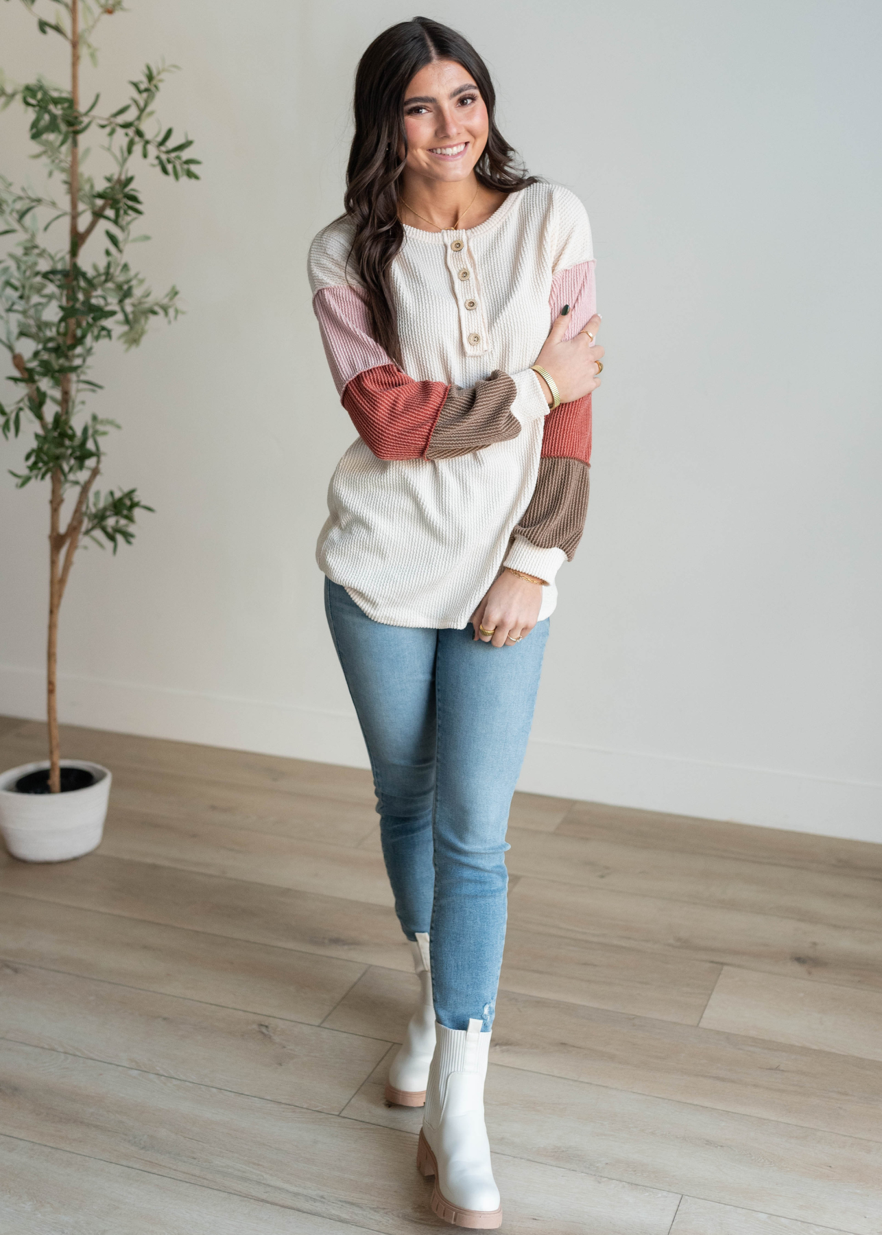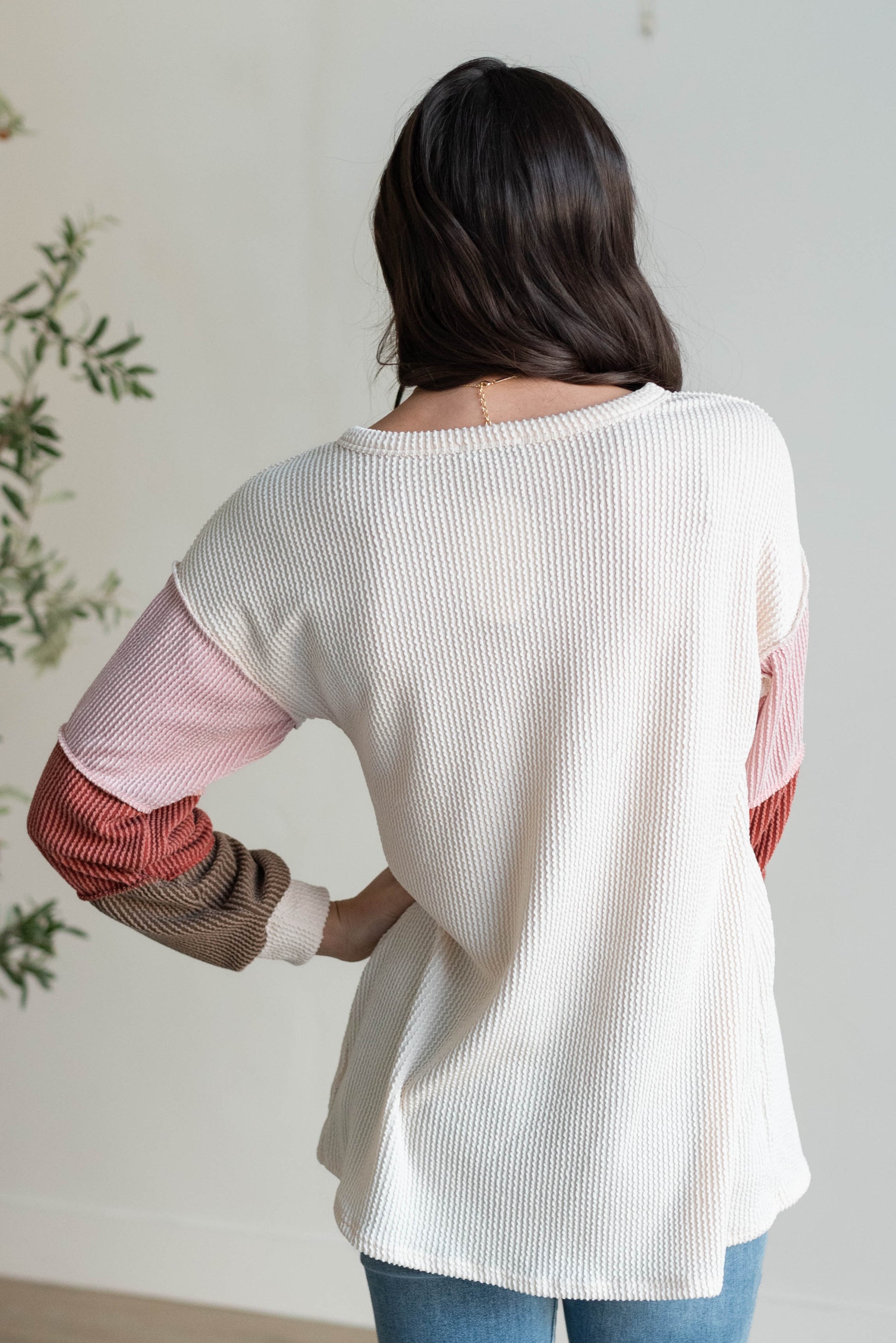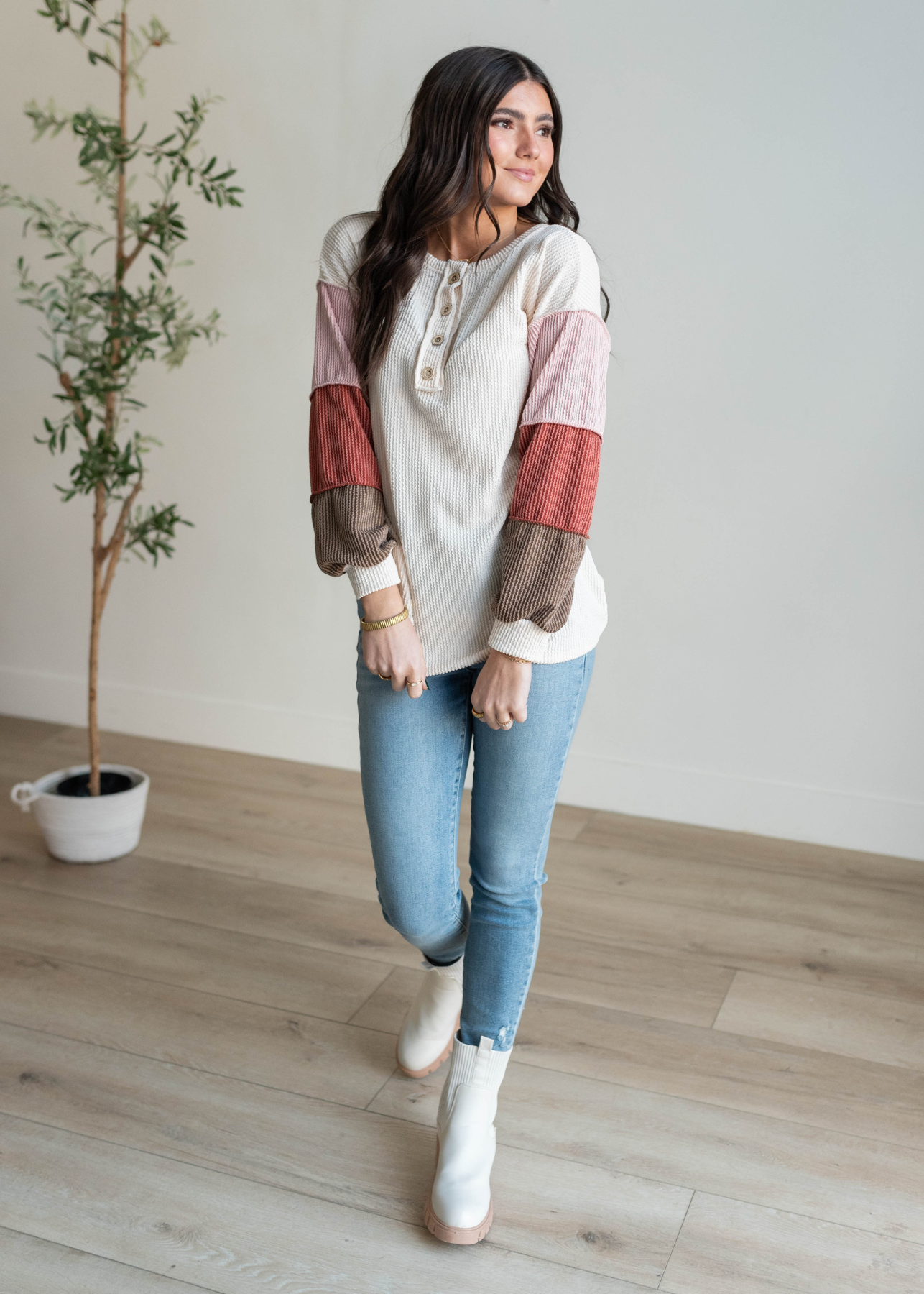 - Colorblocking down the sleeves in shades of pink, red, and brown