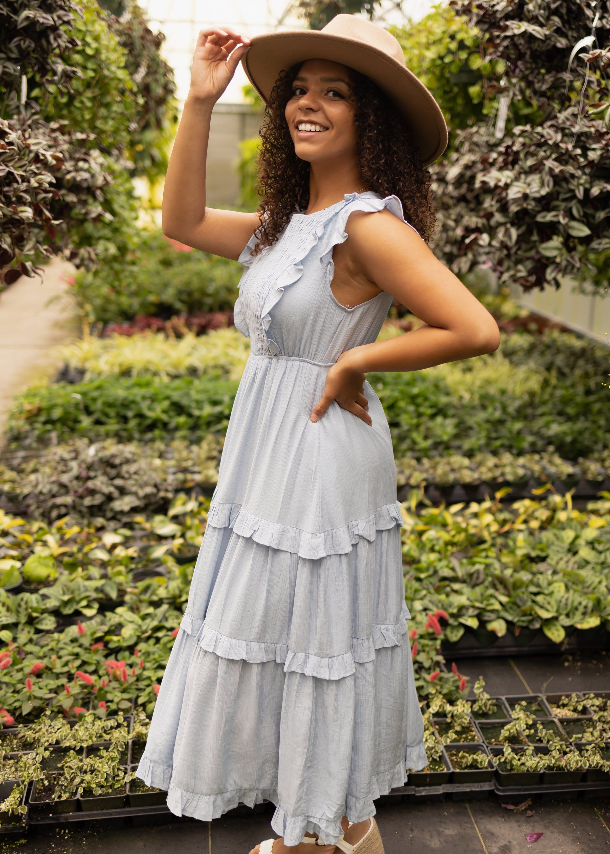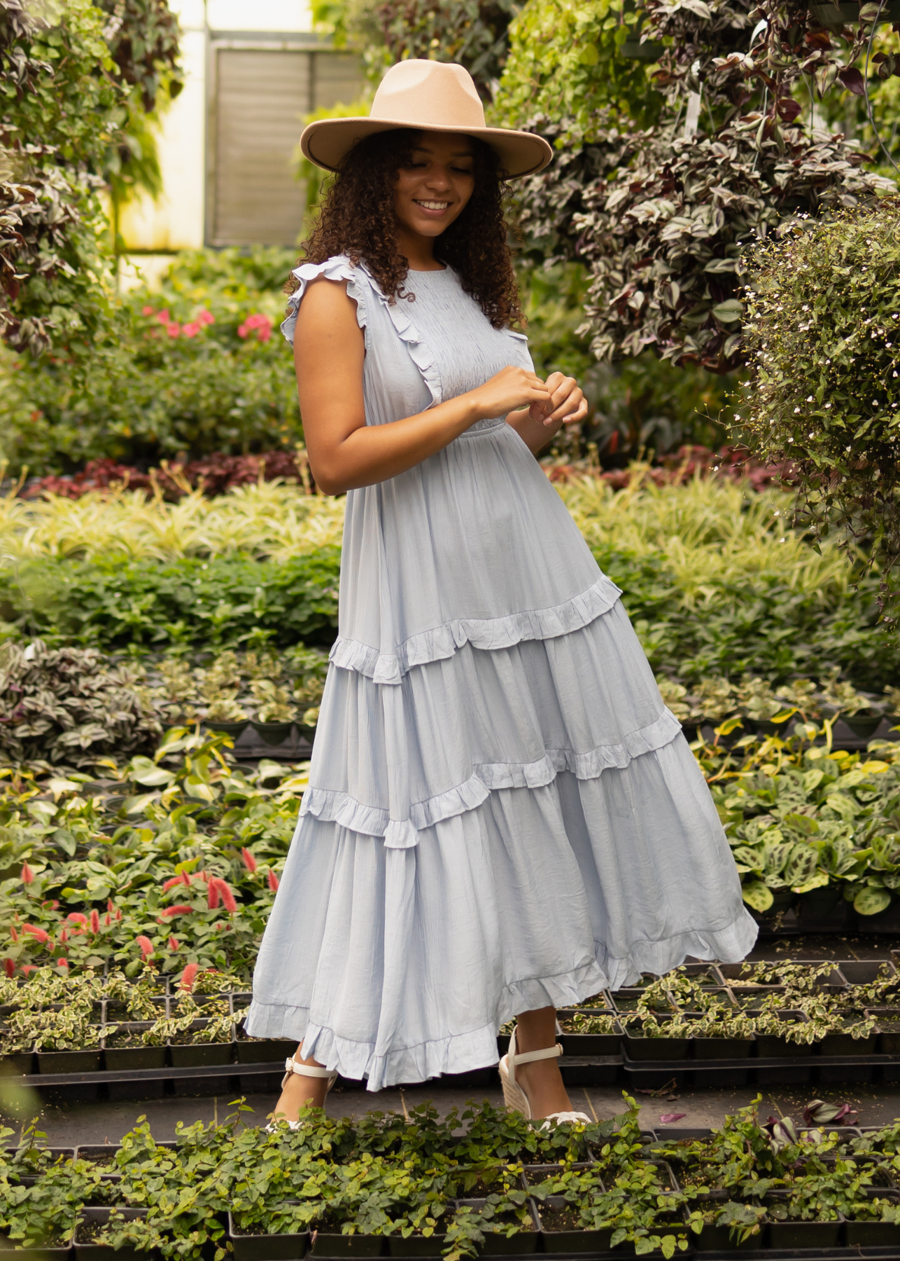 - Ruffle details on sleeves, bodice, and tiers