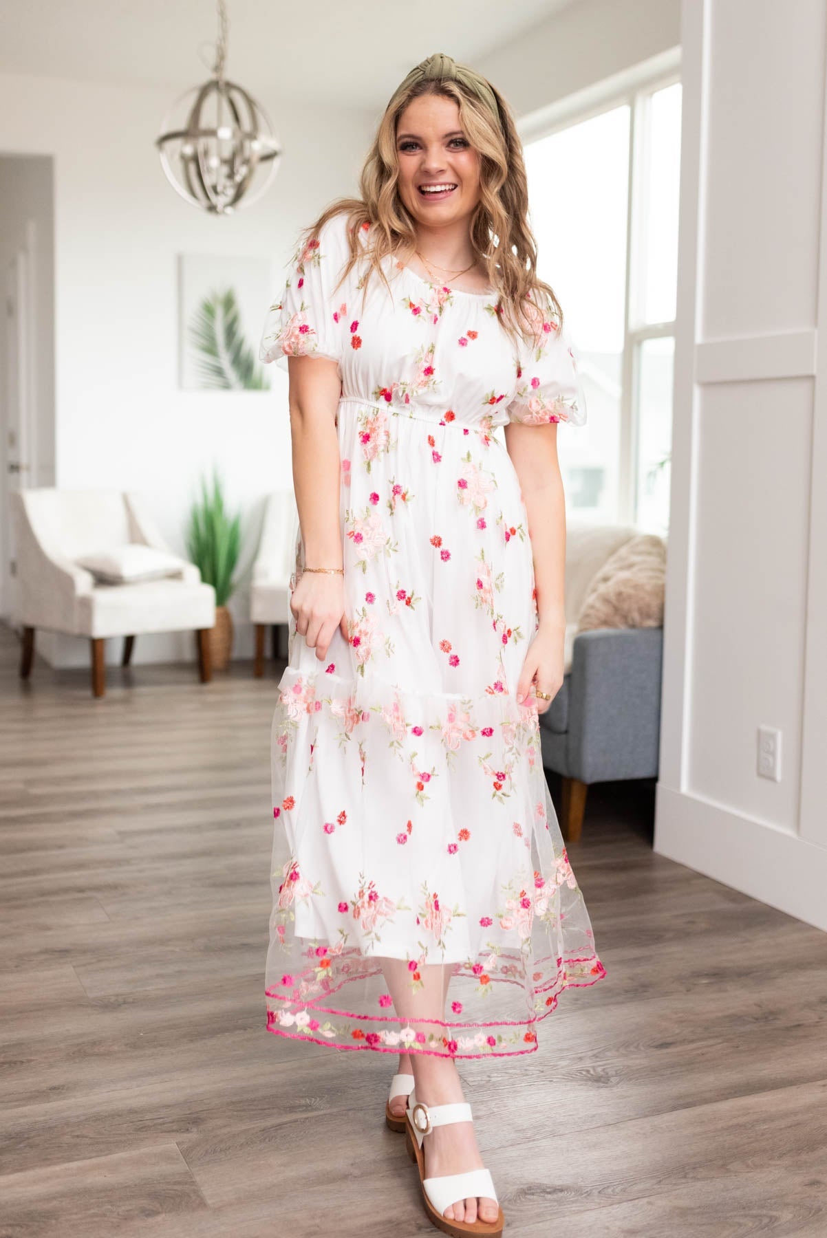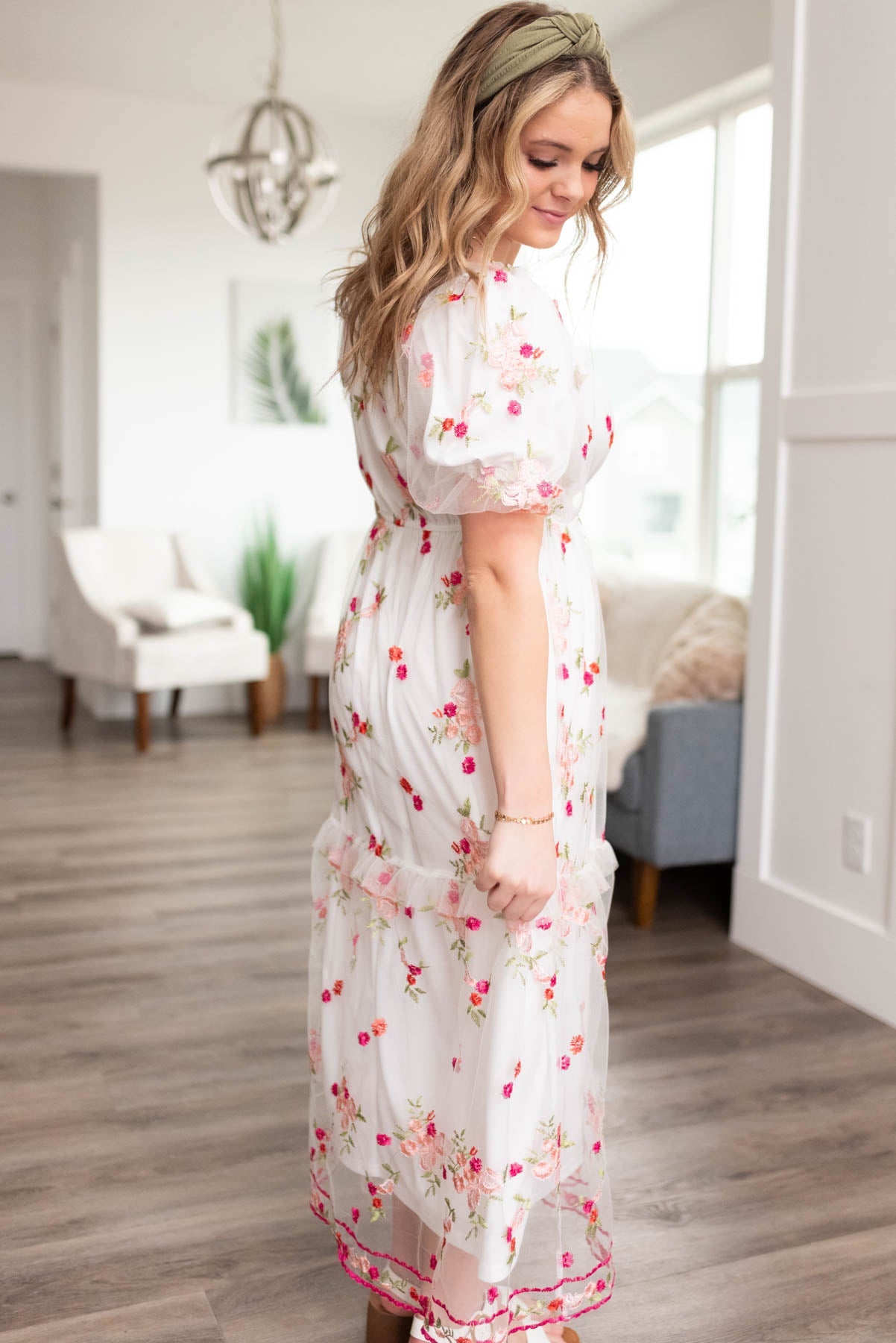 - BEAUTIFUL floral embroidered mesh overlay that makes this dress a true showstopper