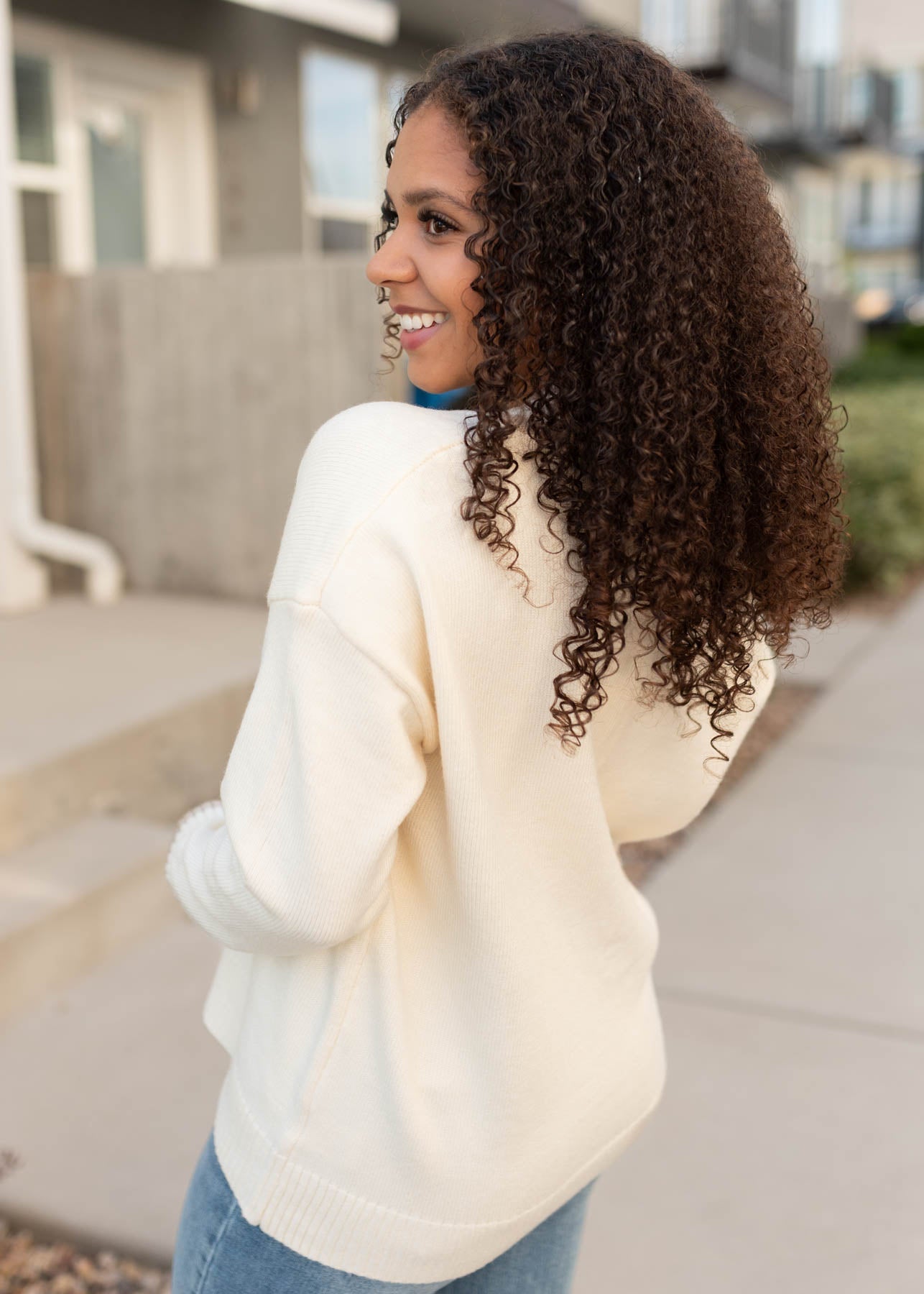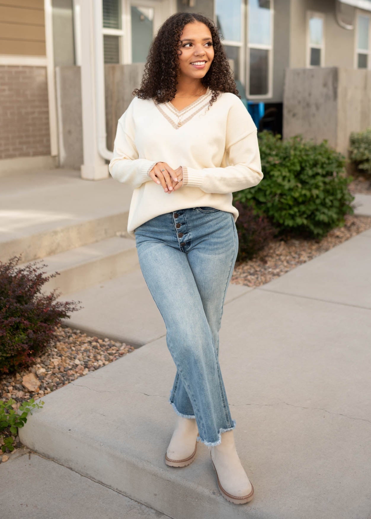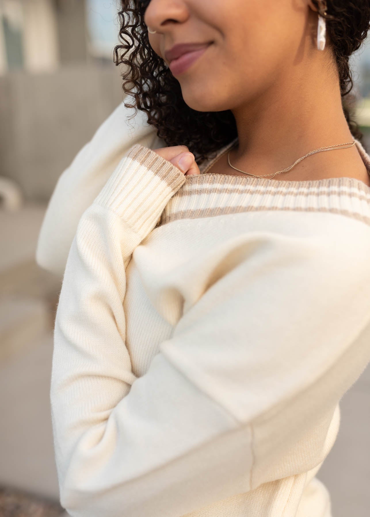 Soft, sweet, and oh-so-cozy—the Elle Ivory Sweater is the one you’ll reach for when you want effortless style and all-day comfort. With a taupe-trimmed neckline and sleeve detail, it’s a subtle statement piece you can dress up or down with ease.