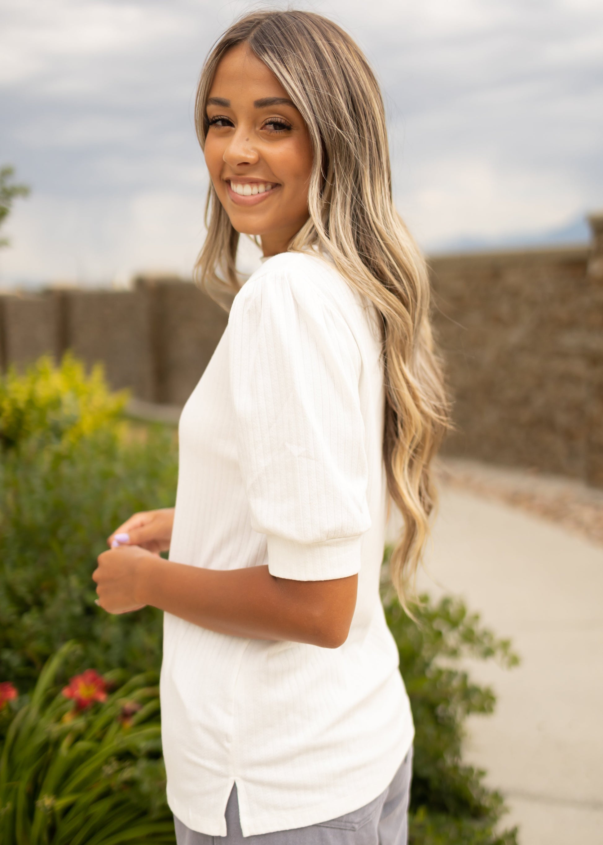 - Staple white + soft ribbed fabric