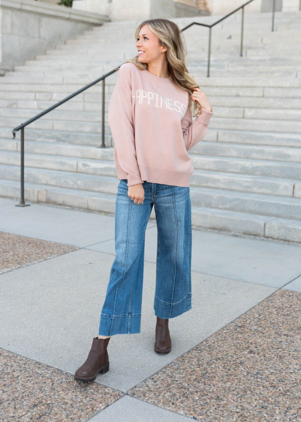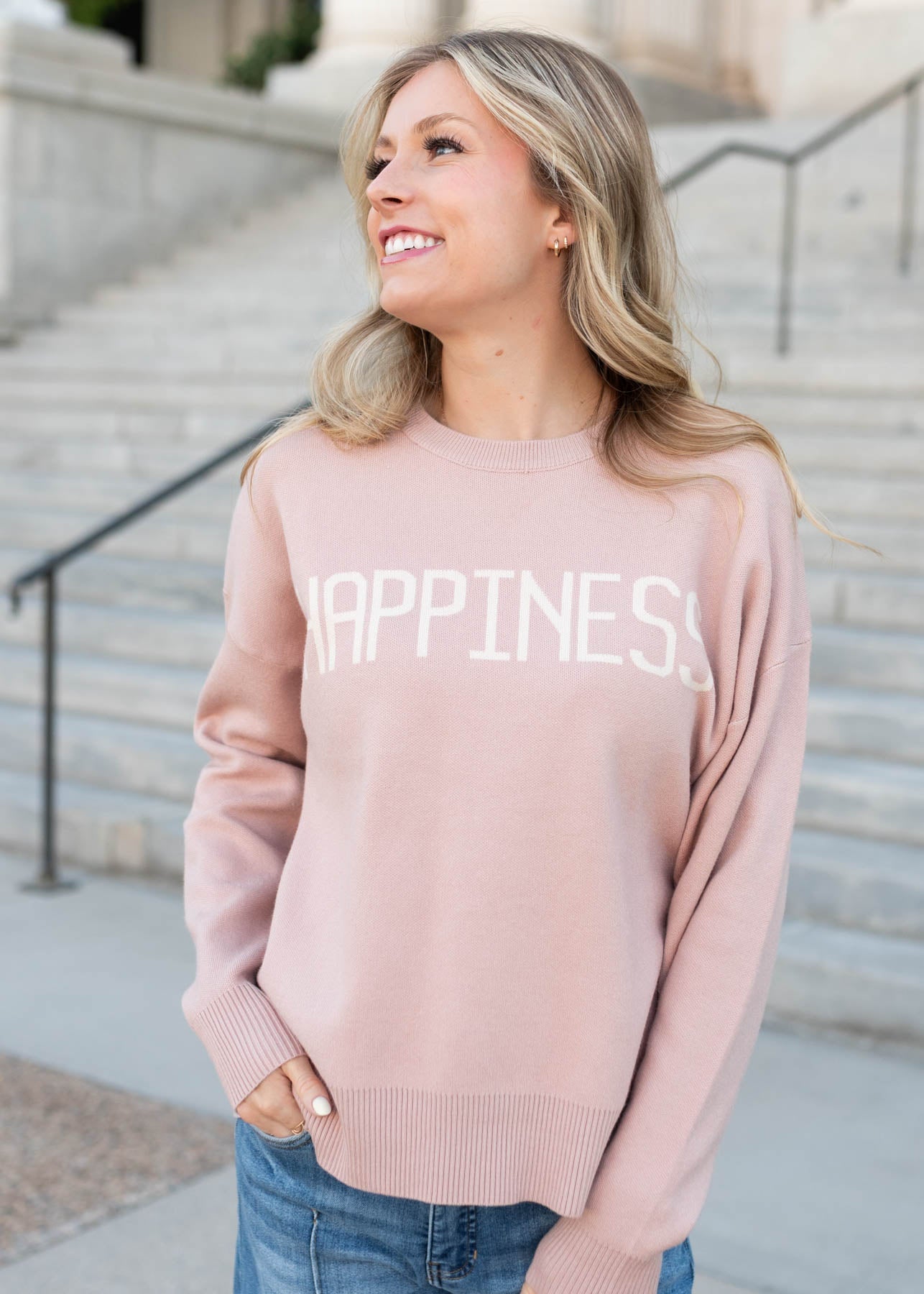 The name says it all—Happiness is a whole vibe in this blush pink sweater! With a playful graphic, soft ribbed details, and an ultra-stretchy, breathable knit, this feel-good favorite is perfect for slow mornings or just bringing cozy energy wherever you go. It’s comfy, cute, and yes... so very cozy.