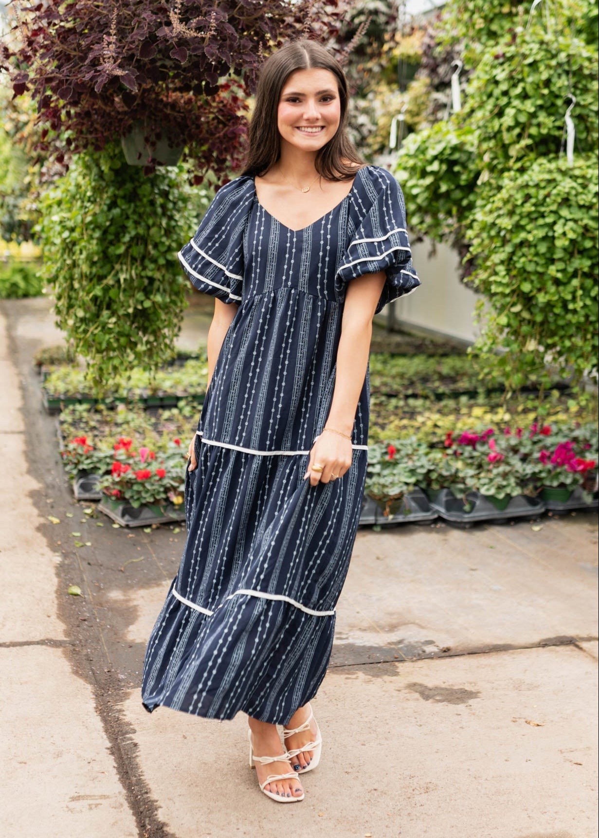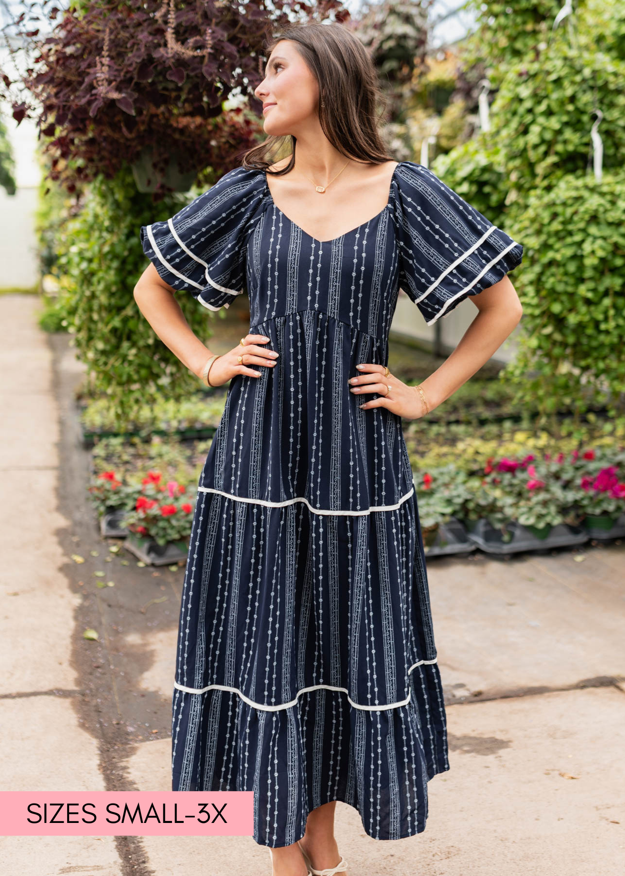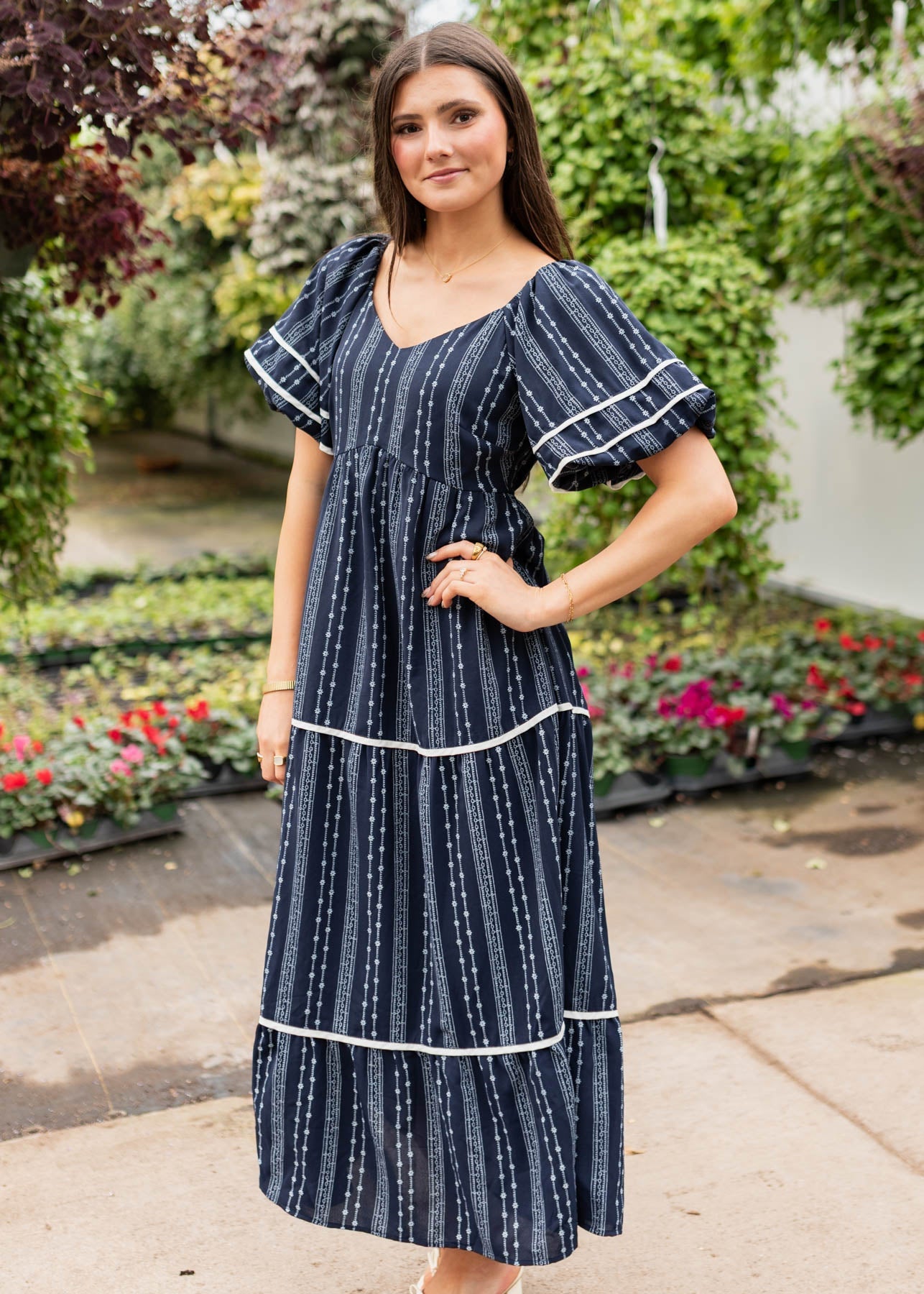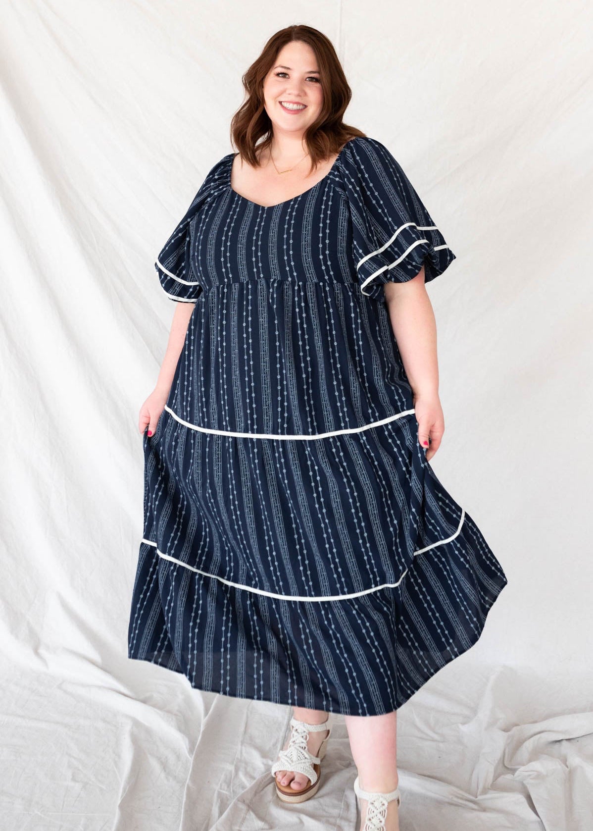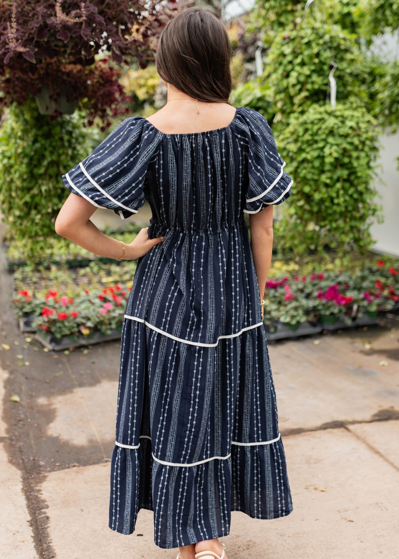 - Super cute pattern in navy and white. White trim along sleeves and skirt