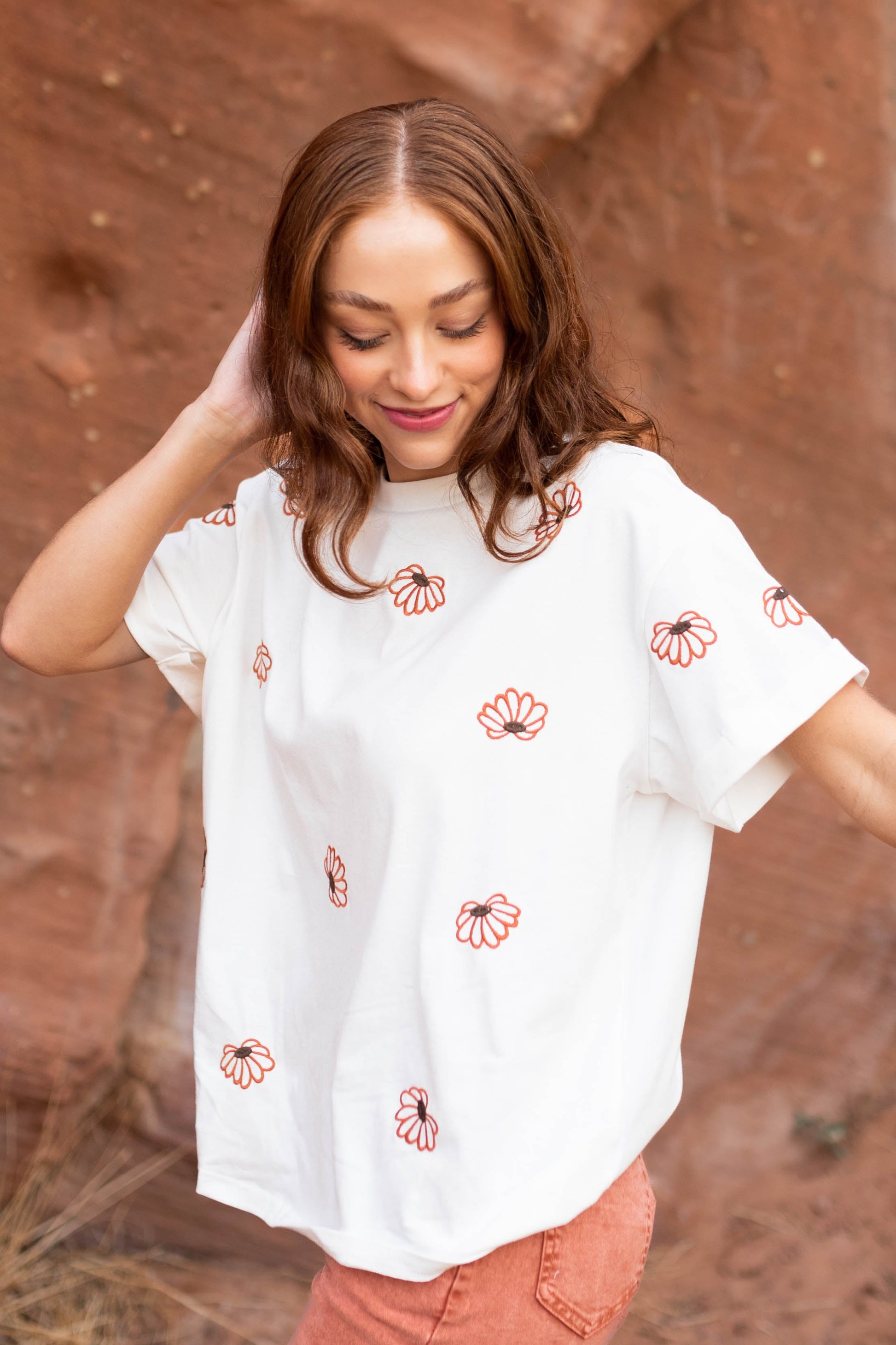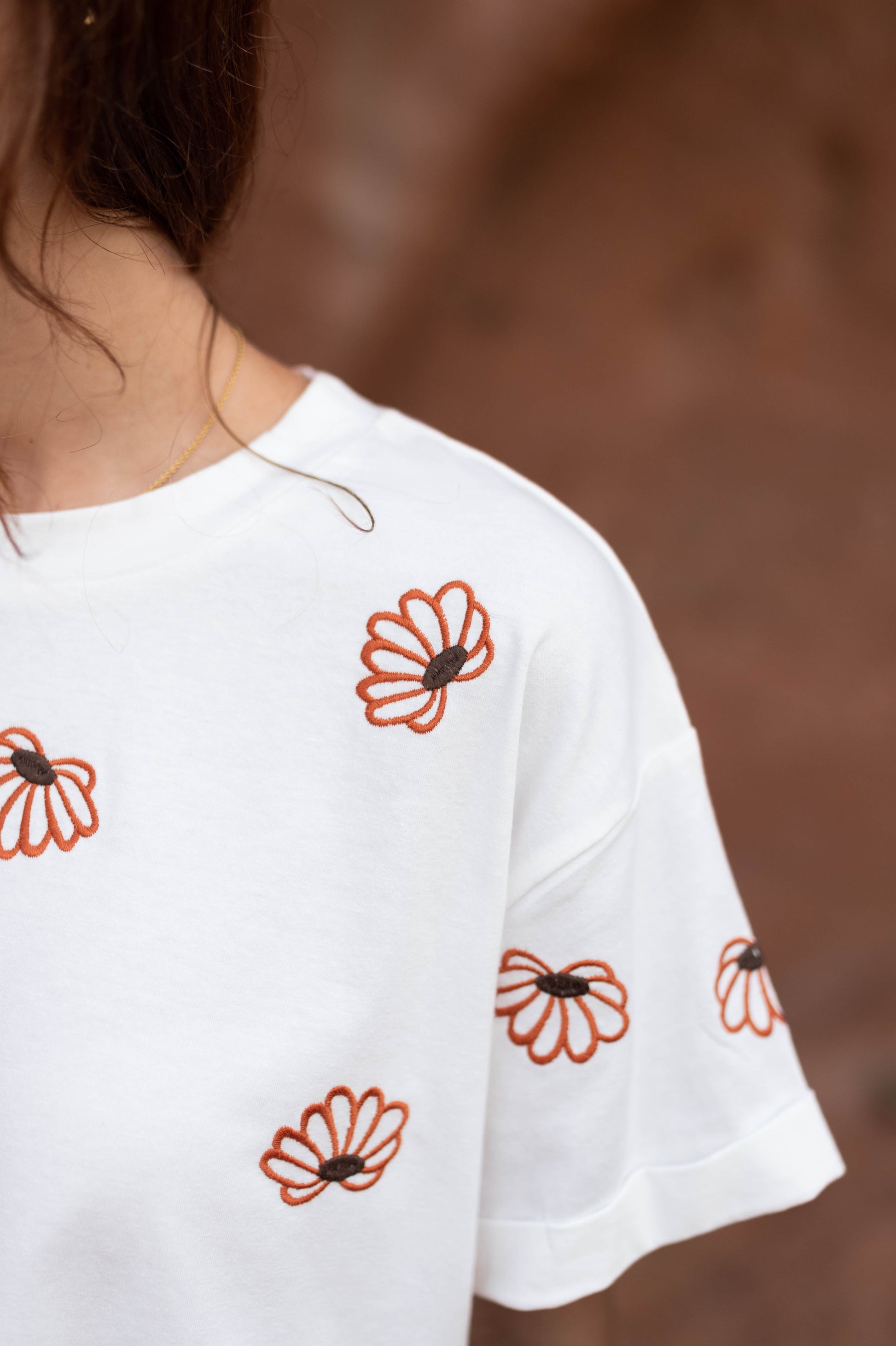 - Ivory with a rust embroidered floral print