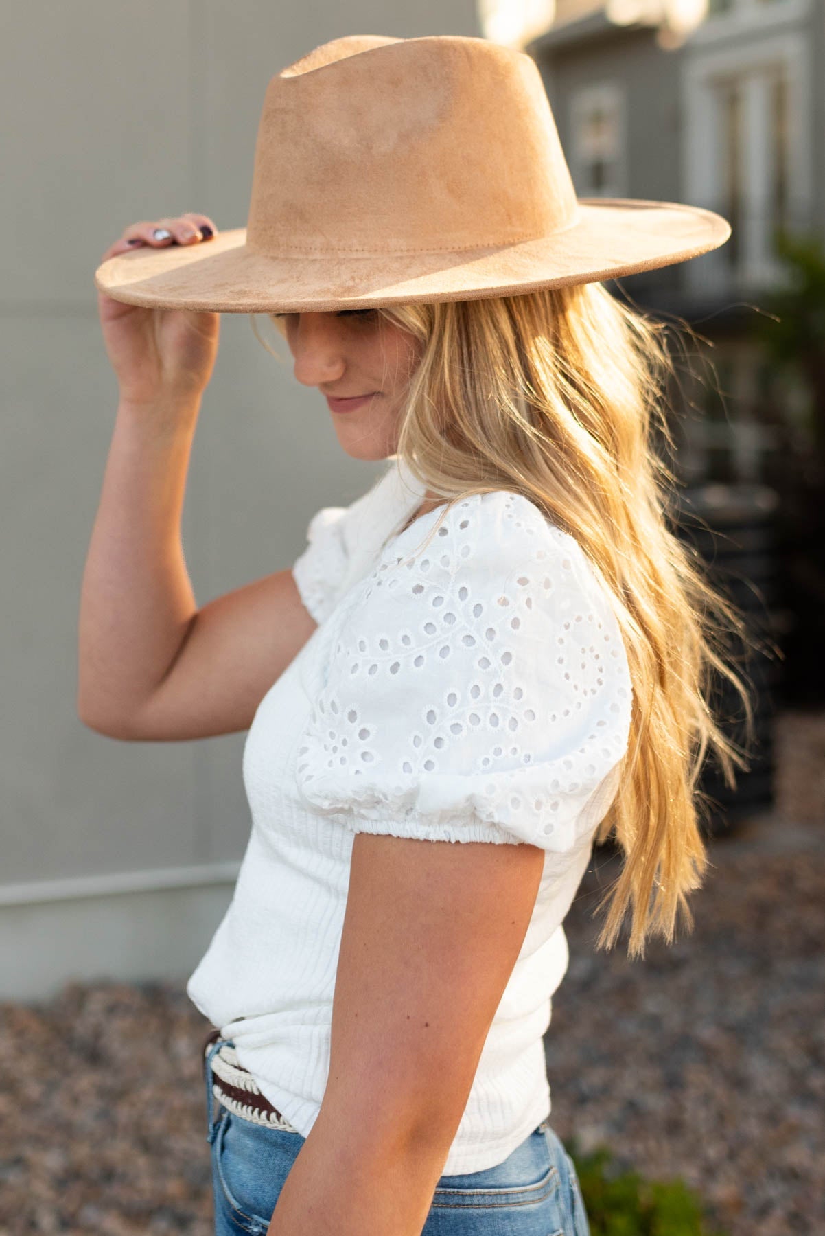 - Soft ribbed bodice + floral embroidered eyelet puff sleeves