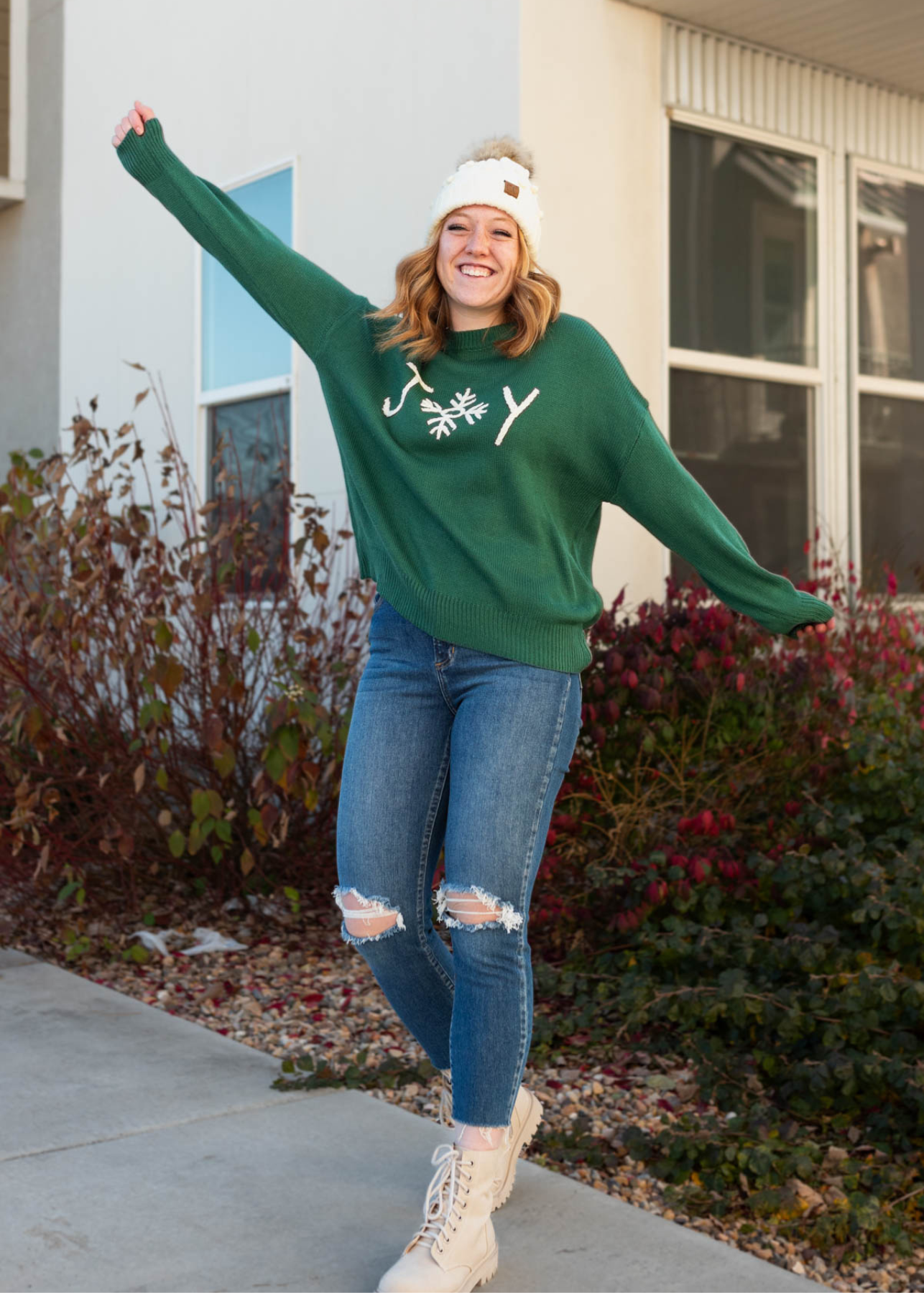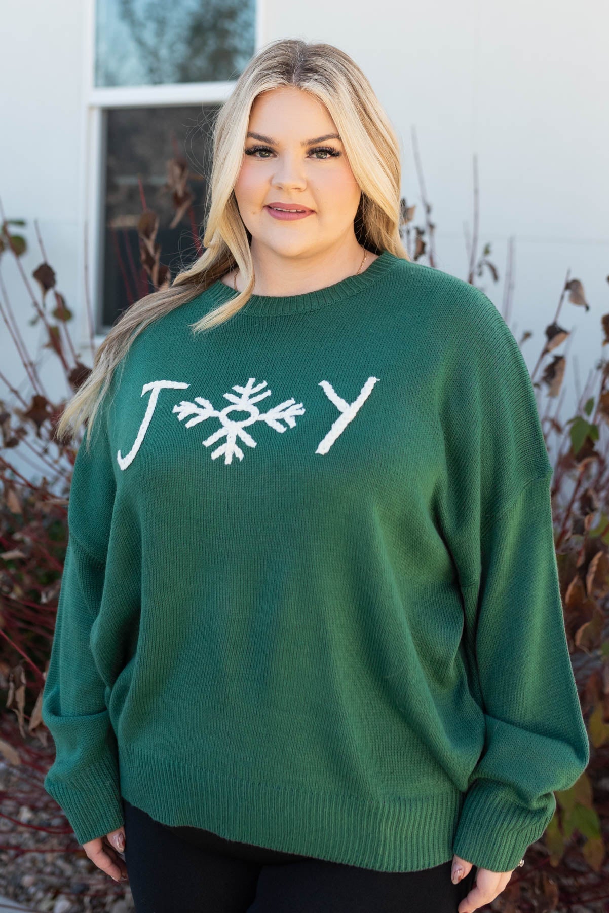- Soft hunter green knit fabric + white embroidered "JOY" with a cute snowflake