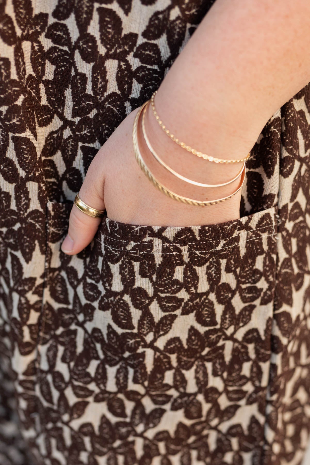 - Light taupe material with brown lace leaf pattern
