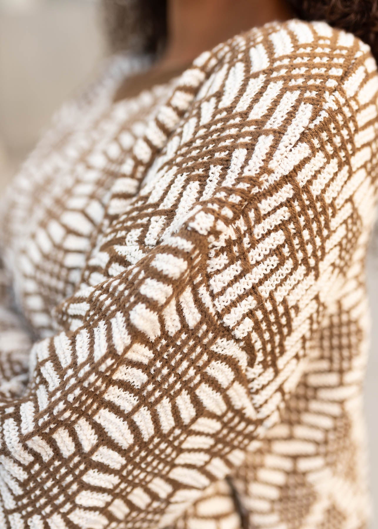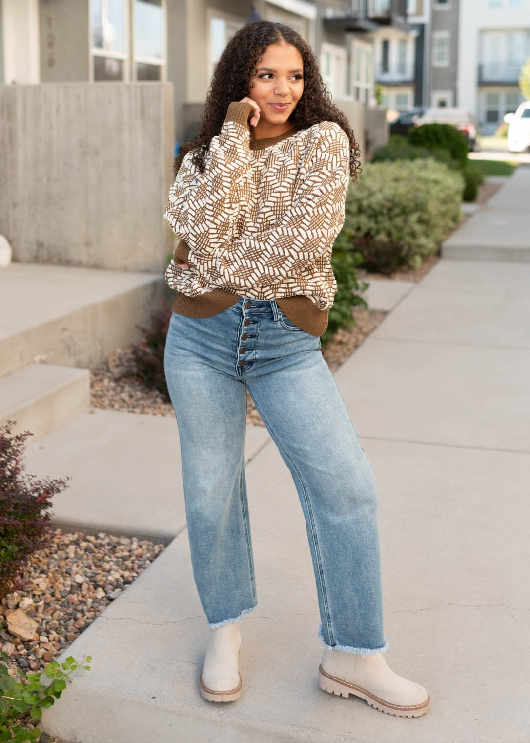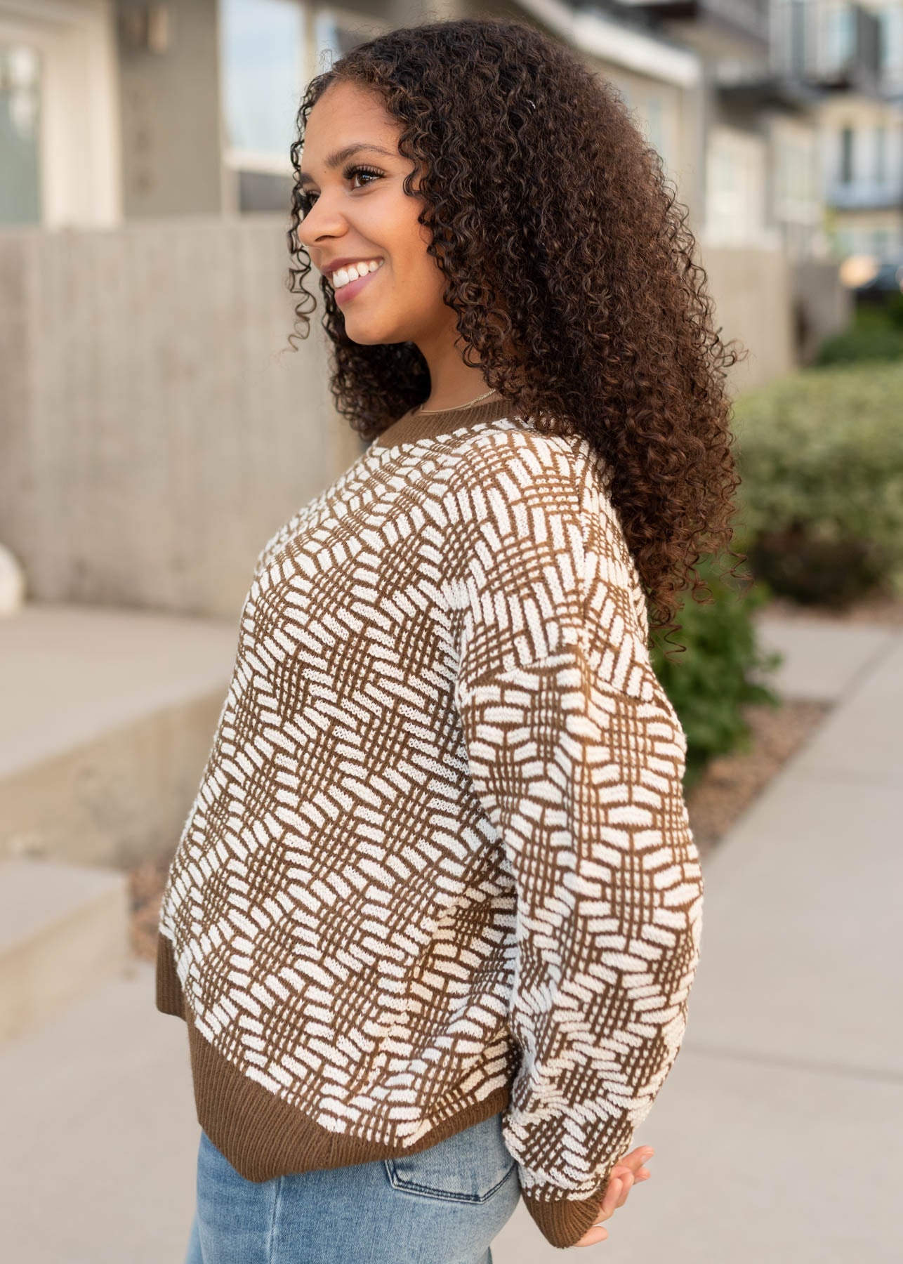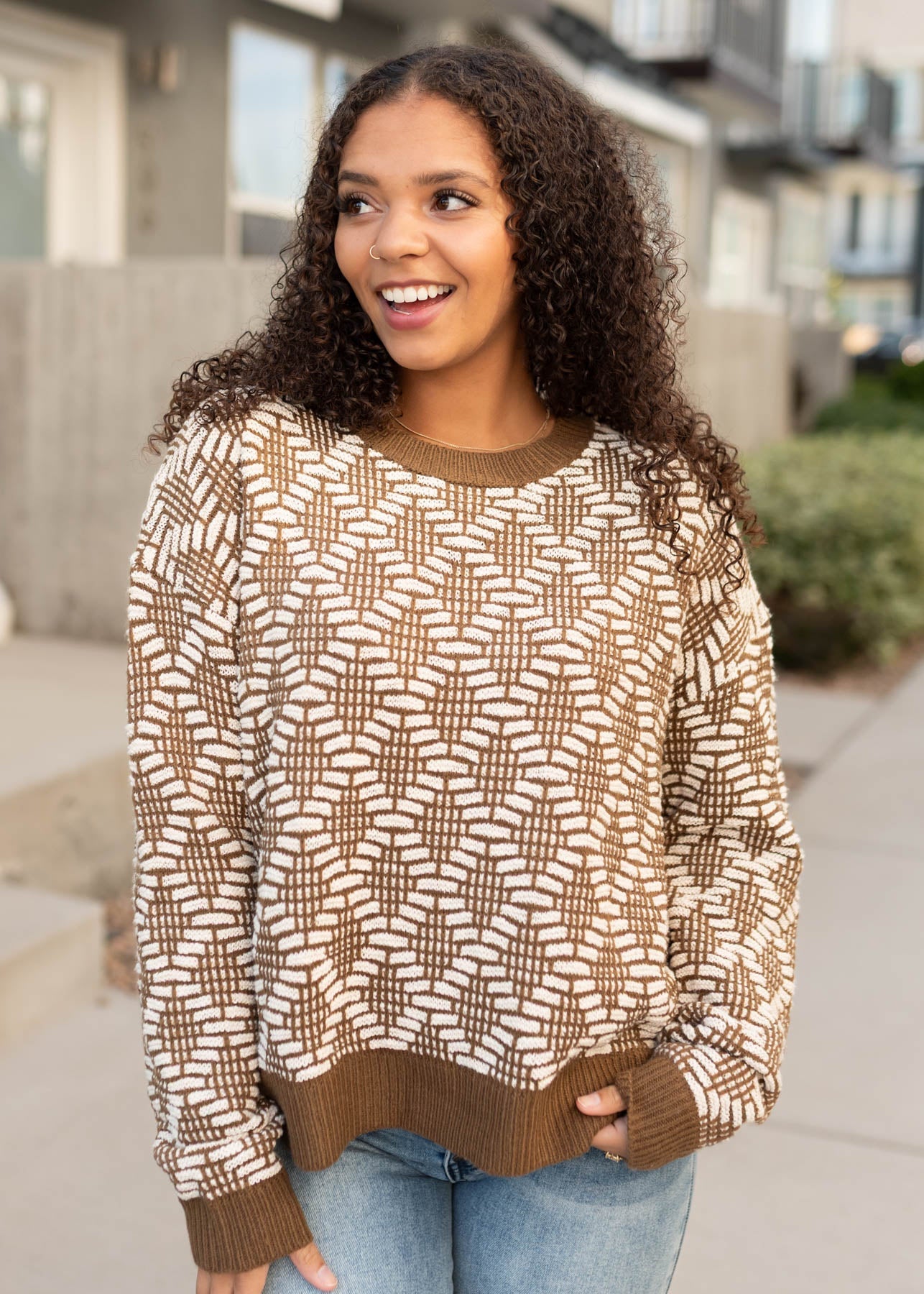 The Kaylee Sweater is cozy made cute. Its warm brown-and-white pattern brings instant charm, while the soft, breathable knit keeps you comfortable all day. Finished with ribbed edges and a classic scoop neckline, this sweater is ready for everything from coffee runs to couch time.