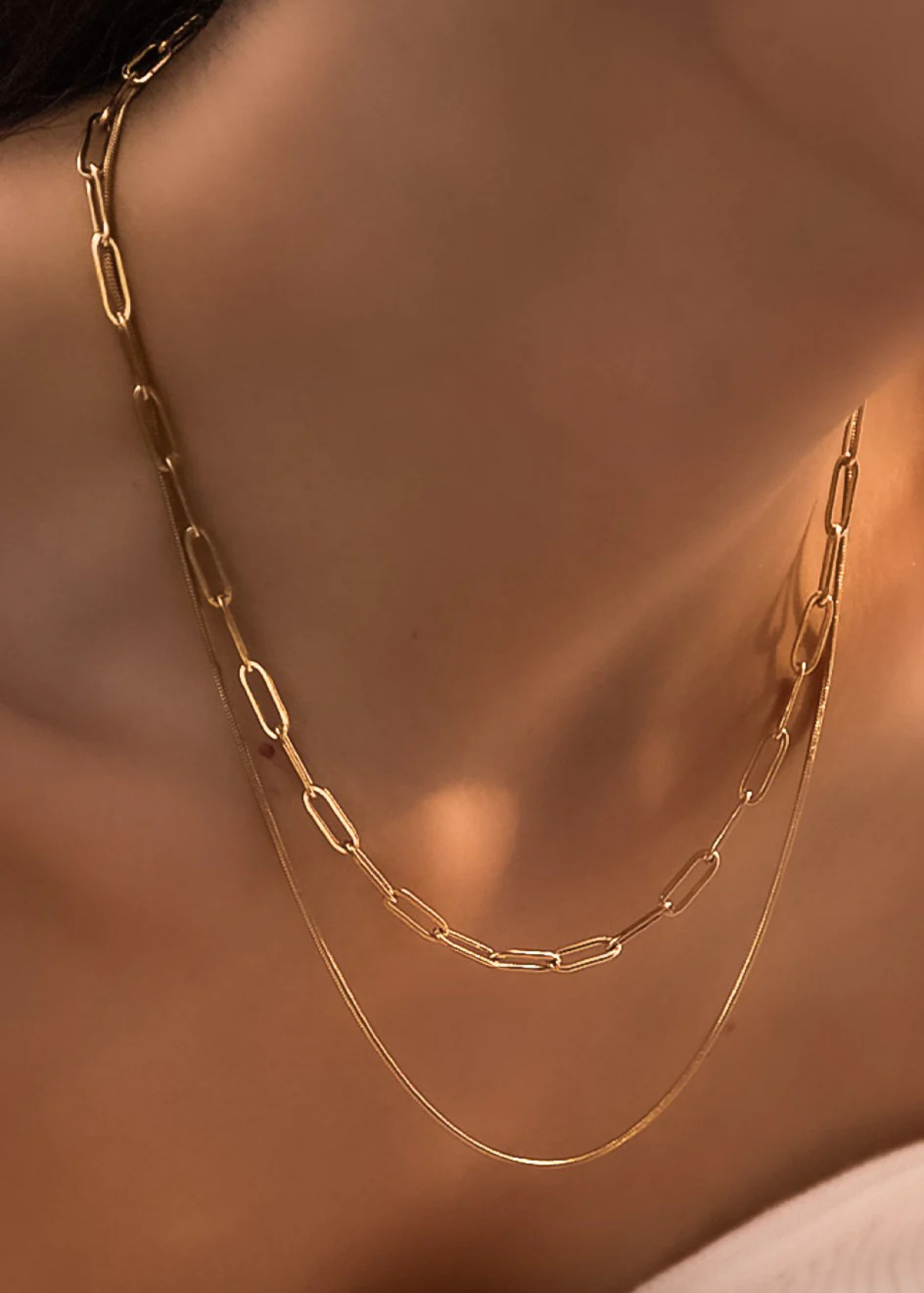 Dainty 18K Gold Plated Stainless Steel Paperclip Chain Multi Layer Necklace. The necklace is hypoallergenic, waterproof, fade-resistant, and tarnish-resistant, ensuring its beauty lasts for years.