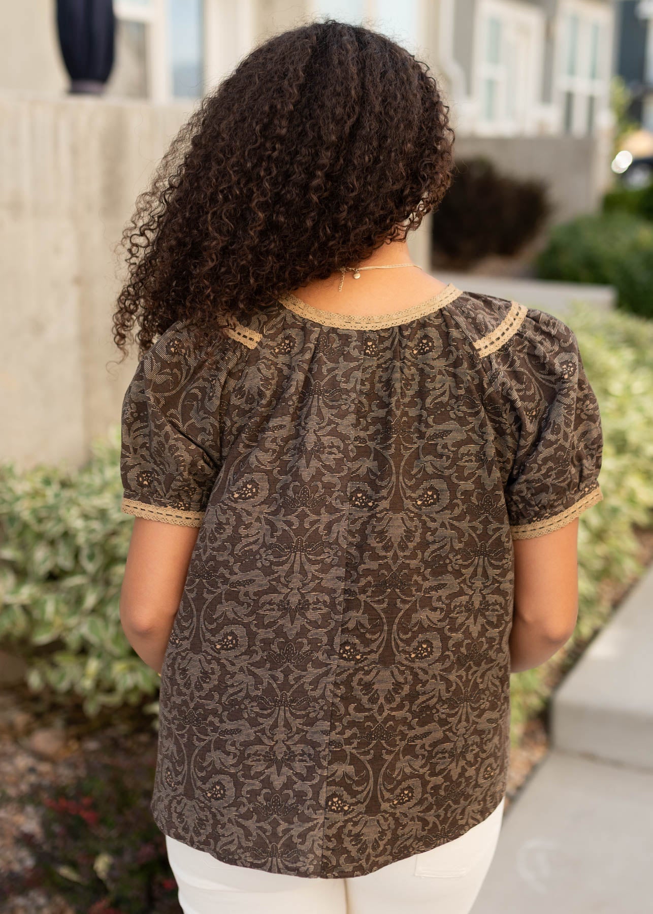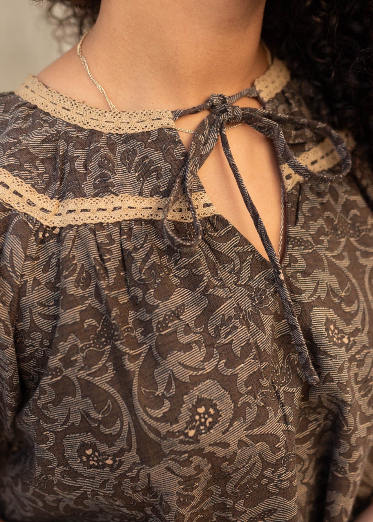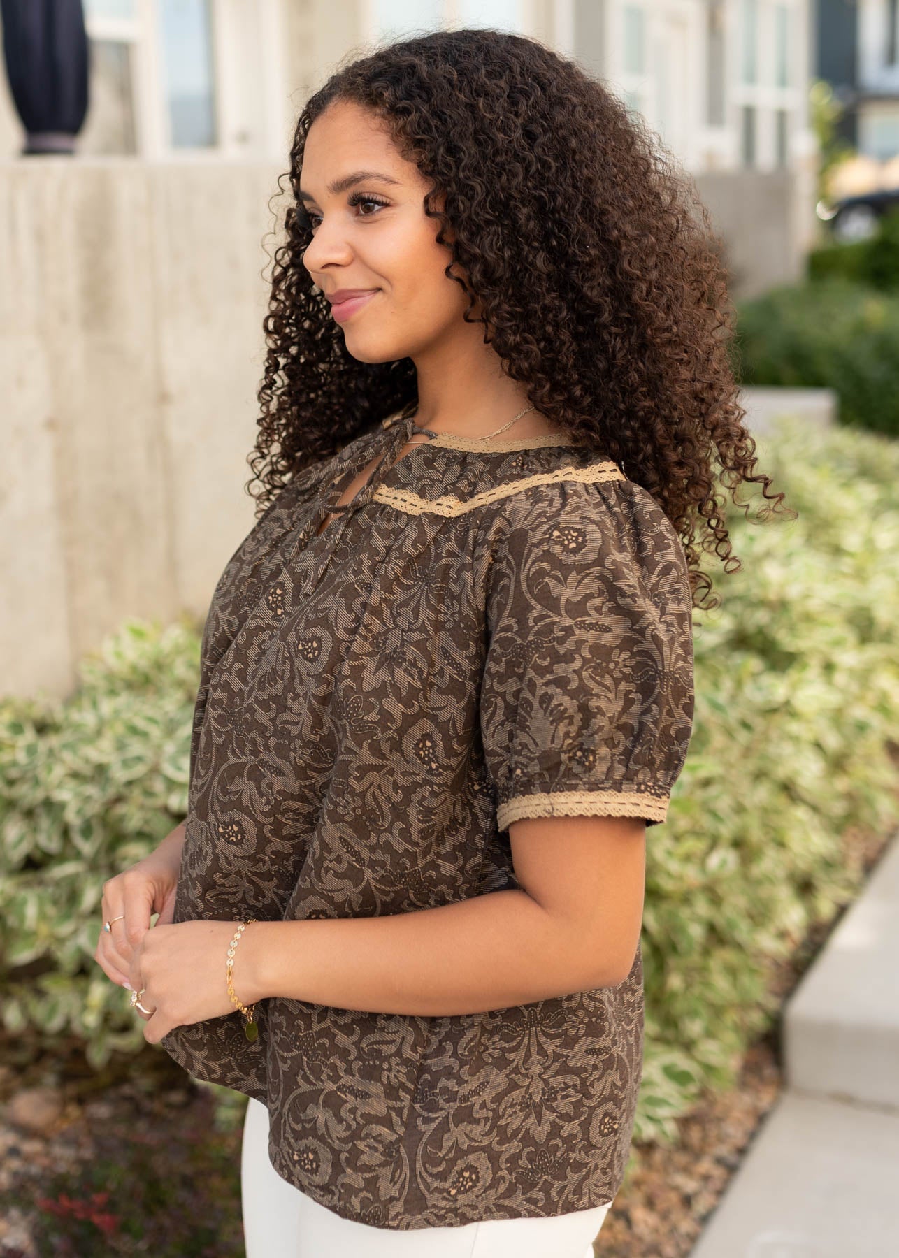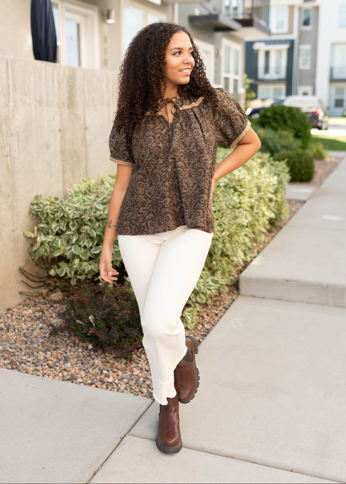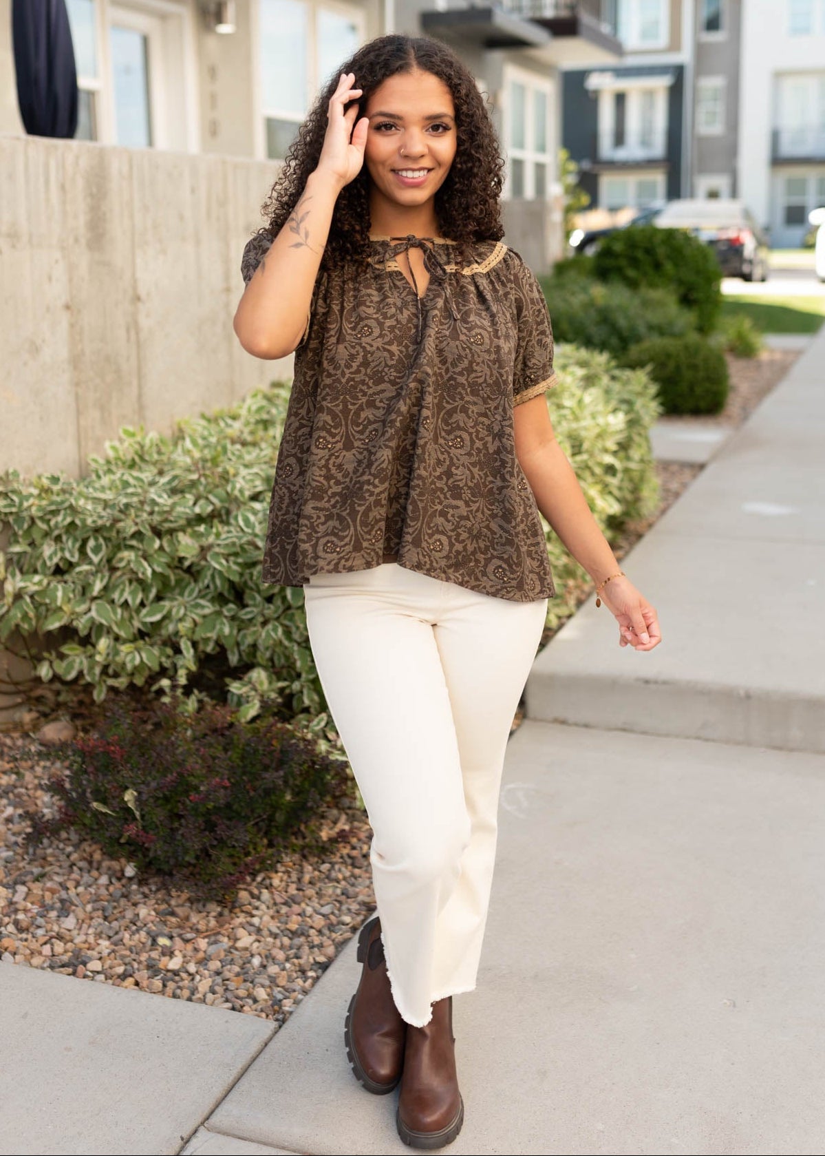 The Madison Brown Pattern Top is a sweet blend of comfort and charming details. With its delicate lace trim, functional neck tie, and flowy fit, it’s an easy way to add a touch of elegance to everyday outfits while staying totally wearable.