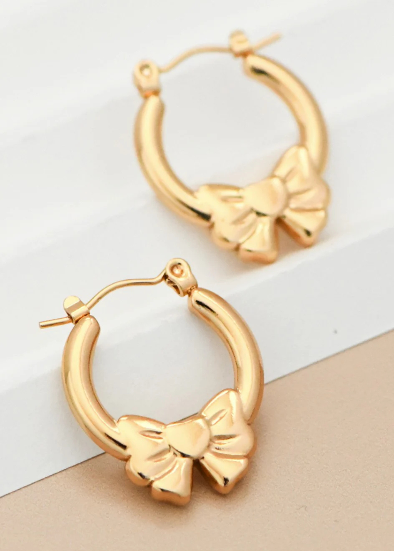 18K Gold Dipped Non-Tarnish Stainless Steel Bow Tie Hoop Earrings.