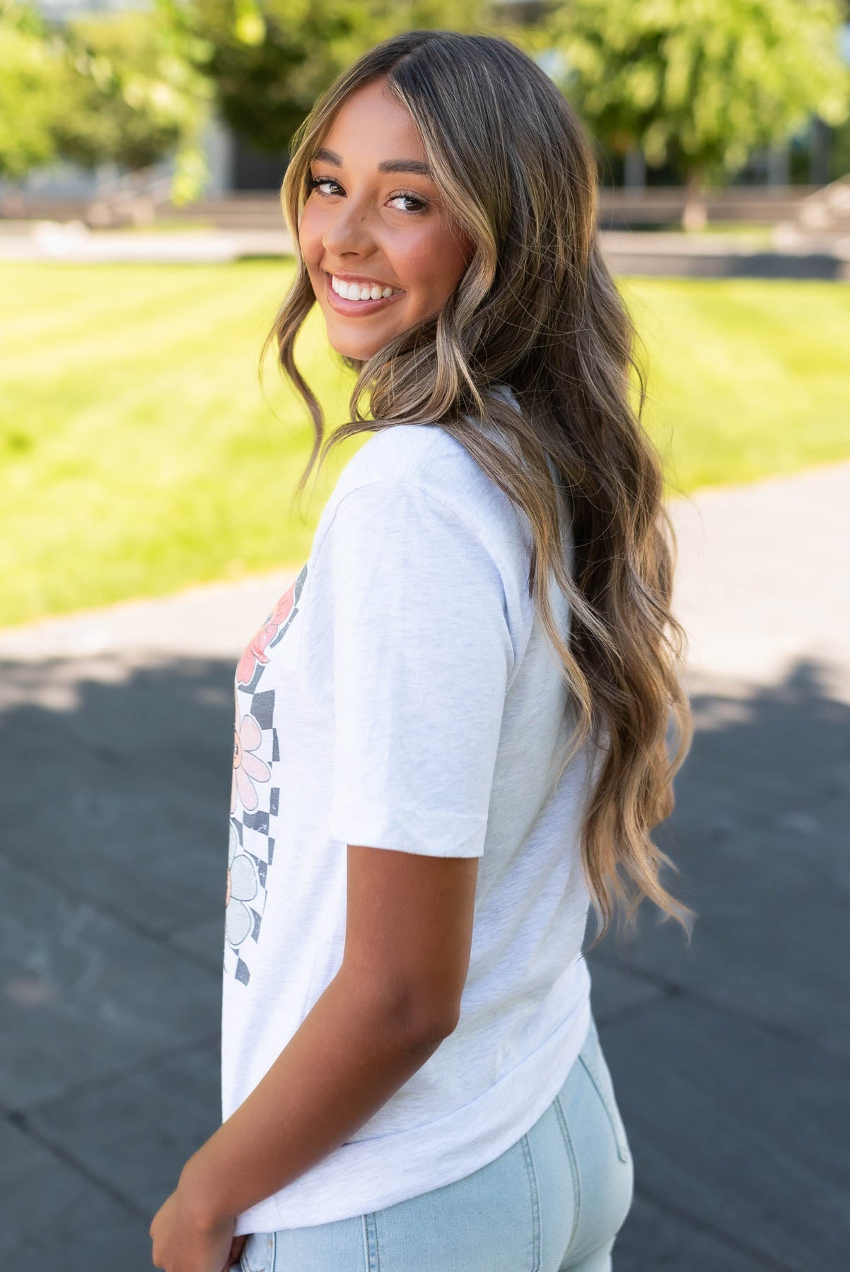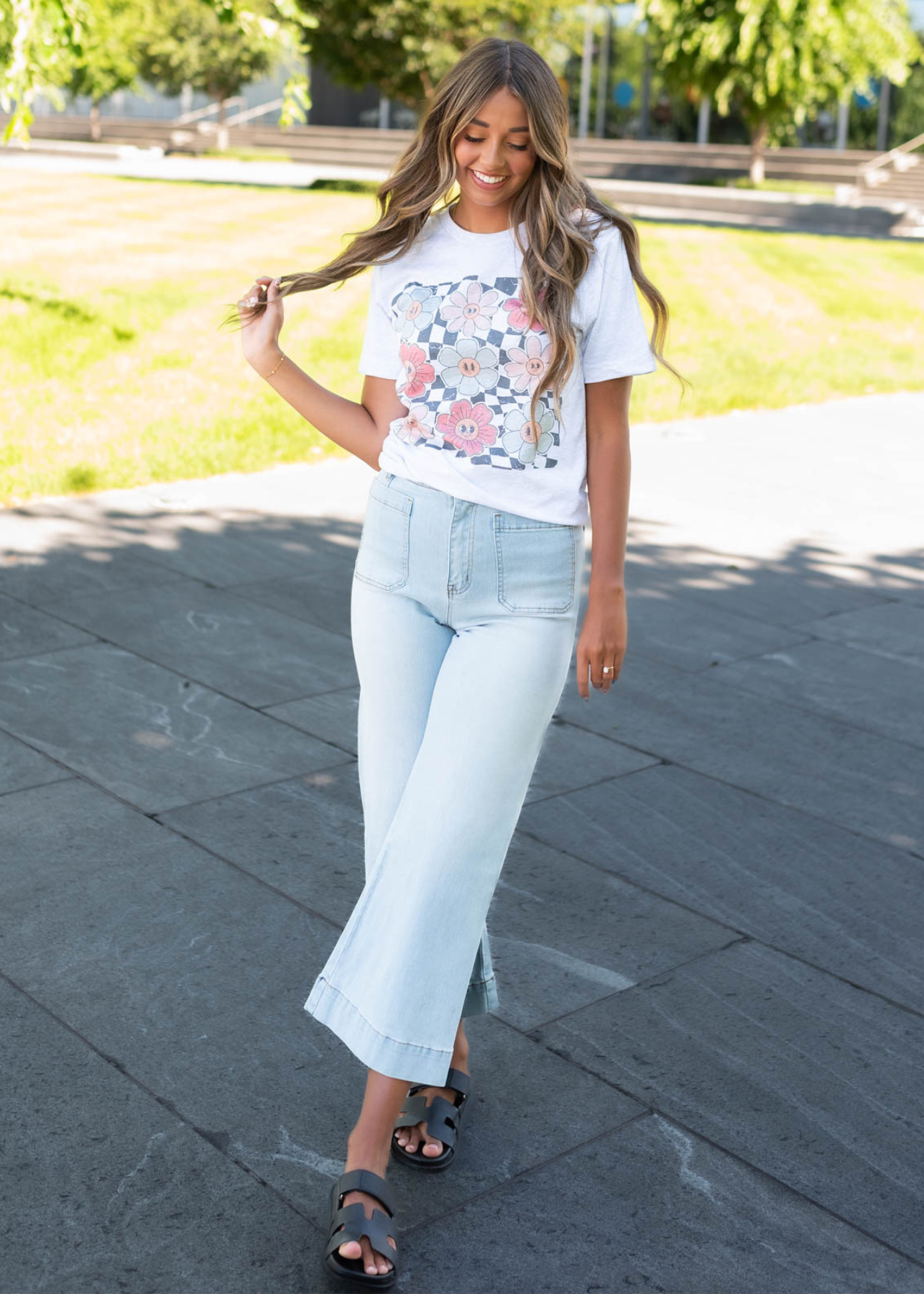 - Fun graphic with checkered background and happy floral faces