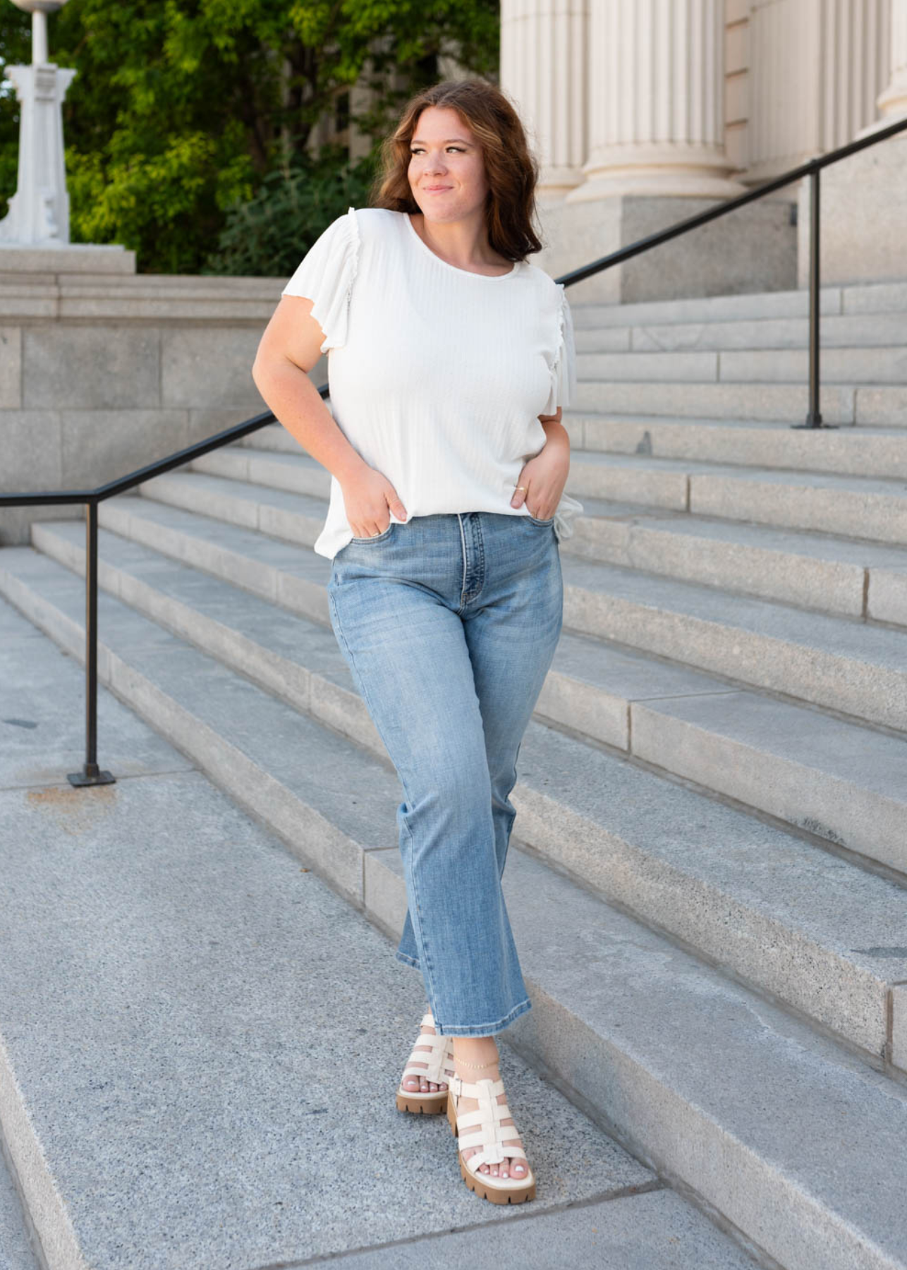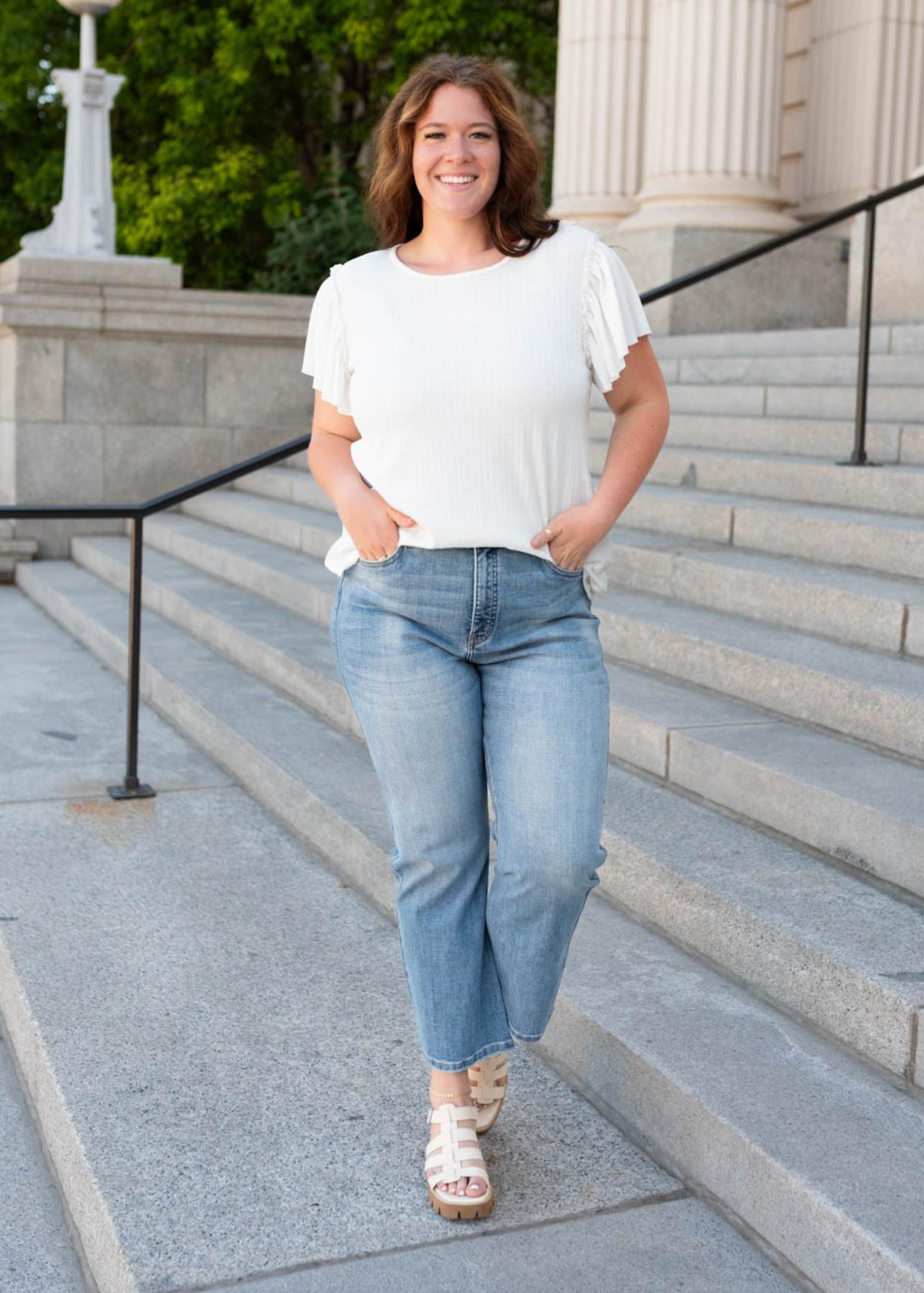 Description: pockets, functioning zipper and button. Lena is in a 16