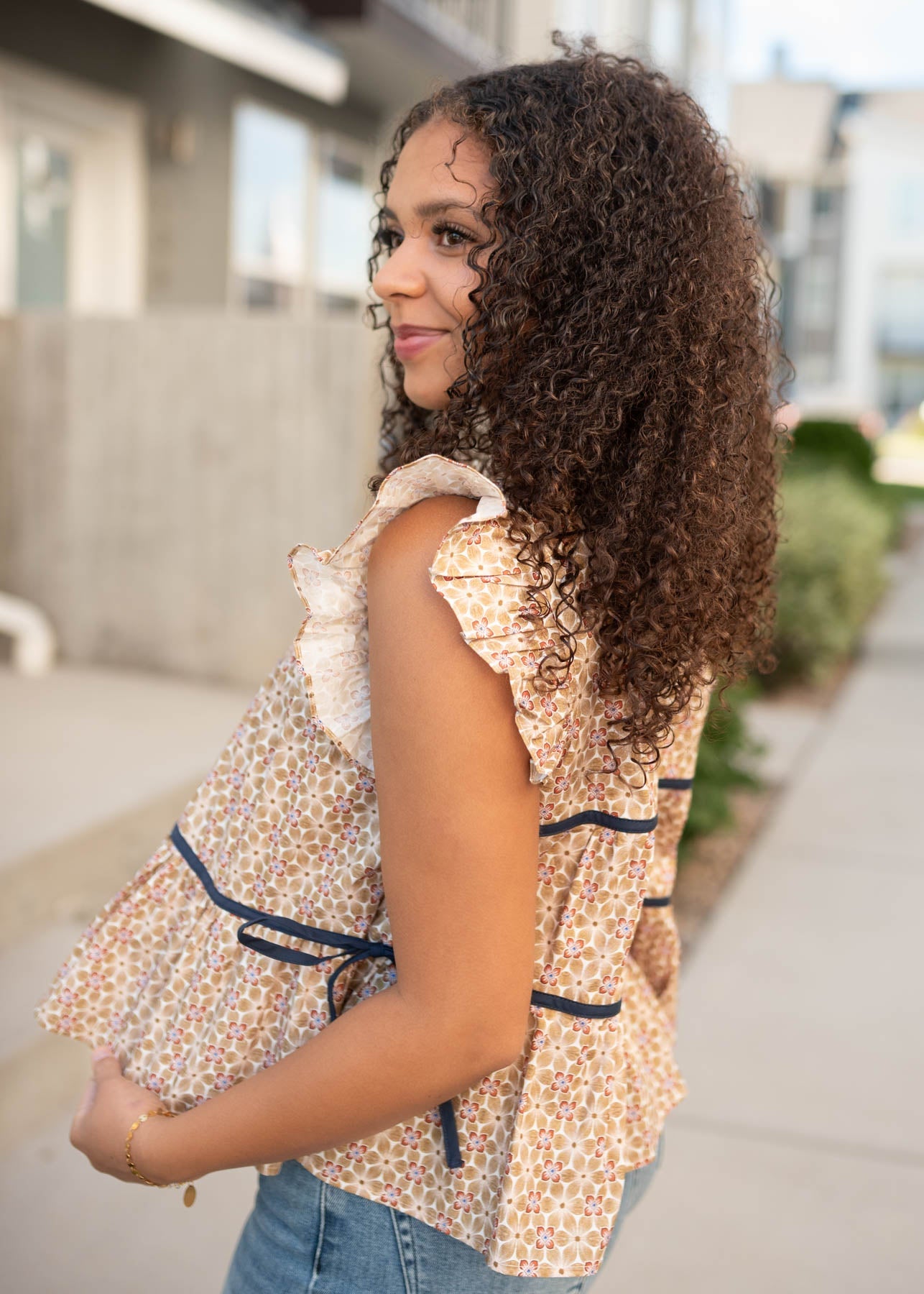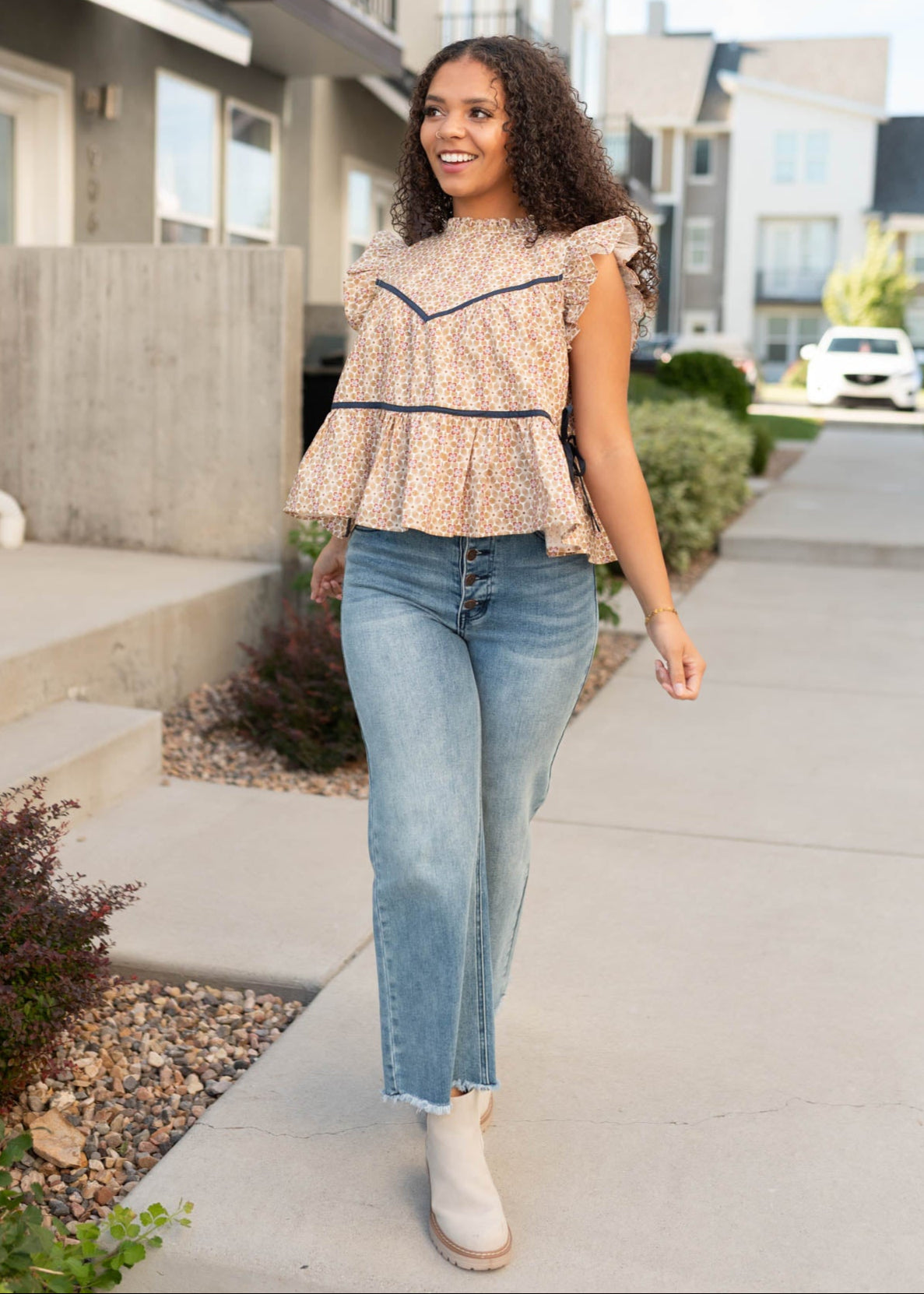 Delicate and full of charm, the Olivia Top is a sweet blend of timeless style and feminine detail. From the ruffled neckline and sleeves to the dainty tier and decorative bow, this beauty is finished with a classic taupe floral print that pairs effortlessly with your favorite bottoms.