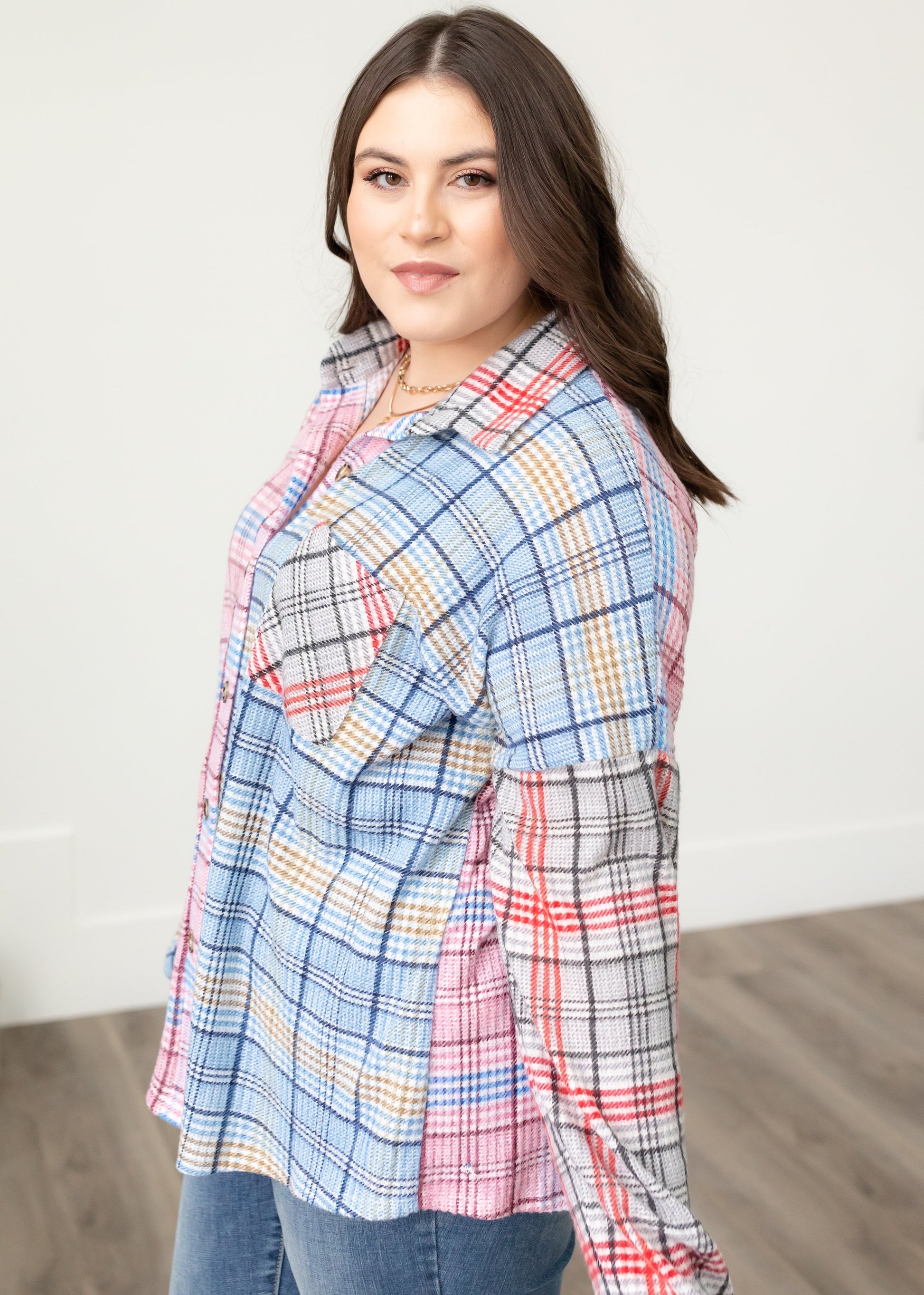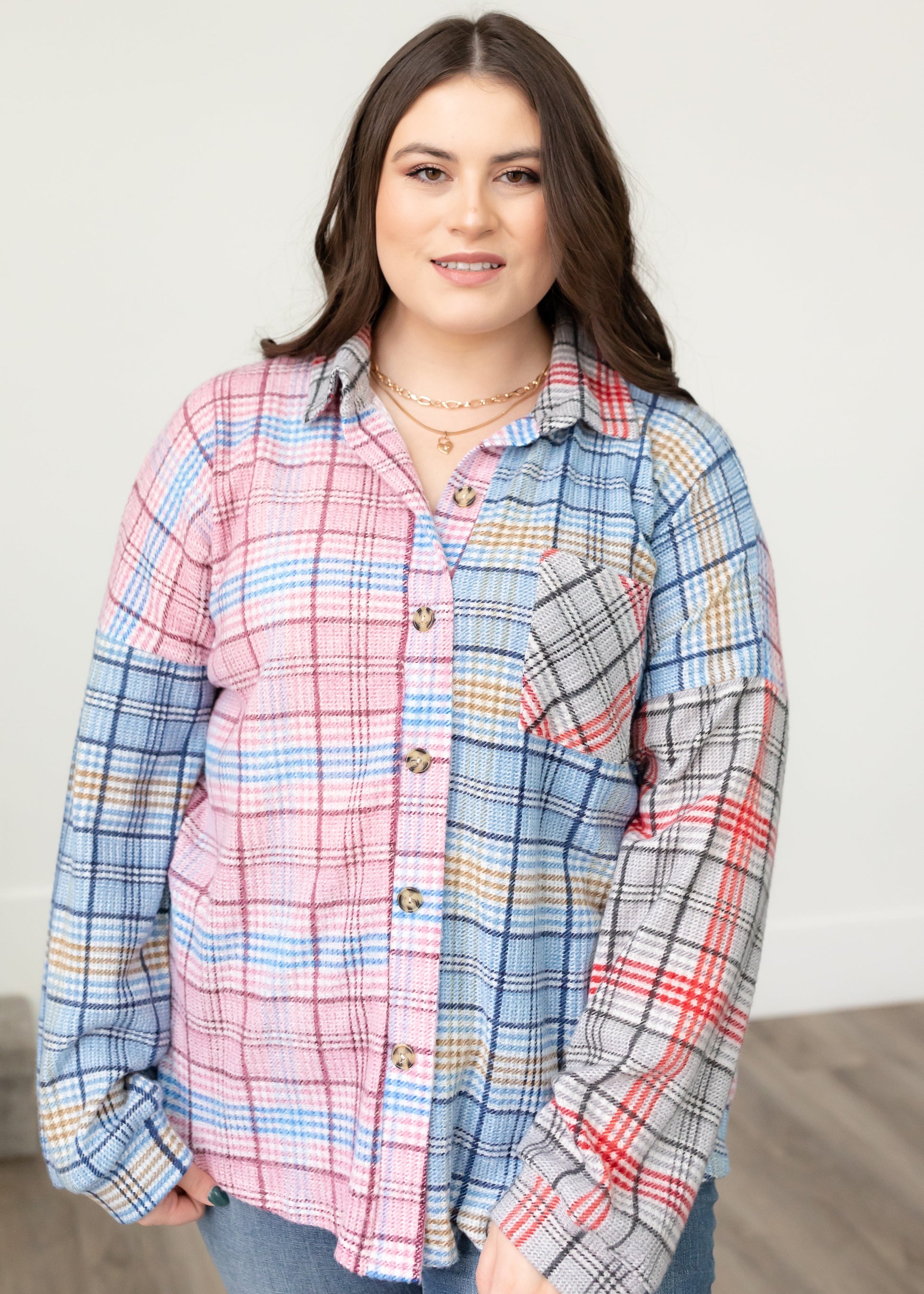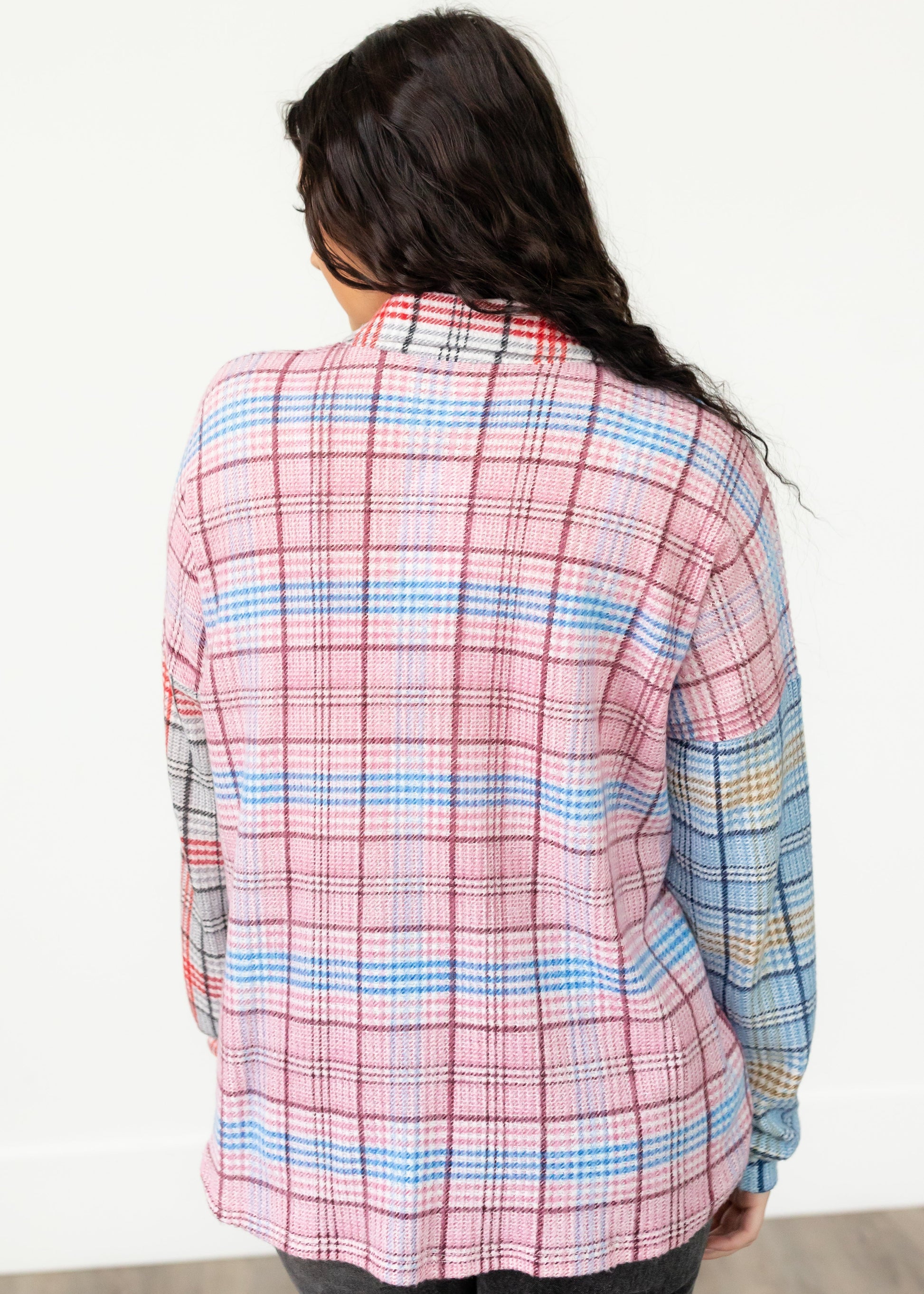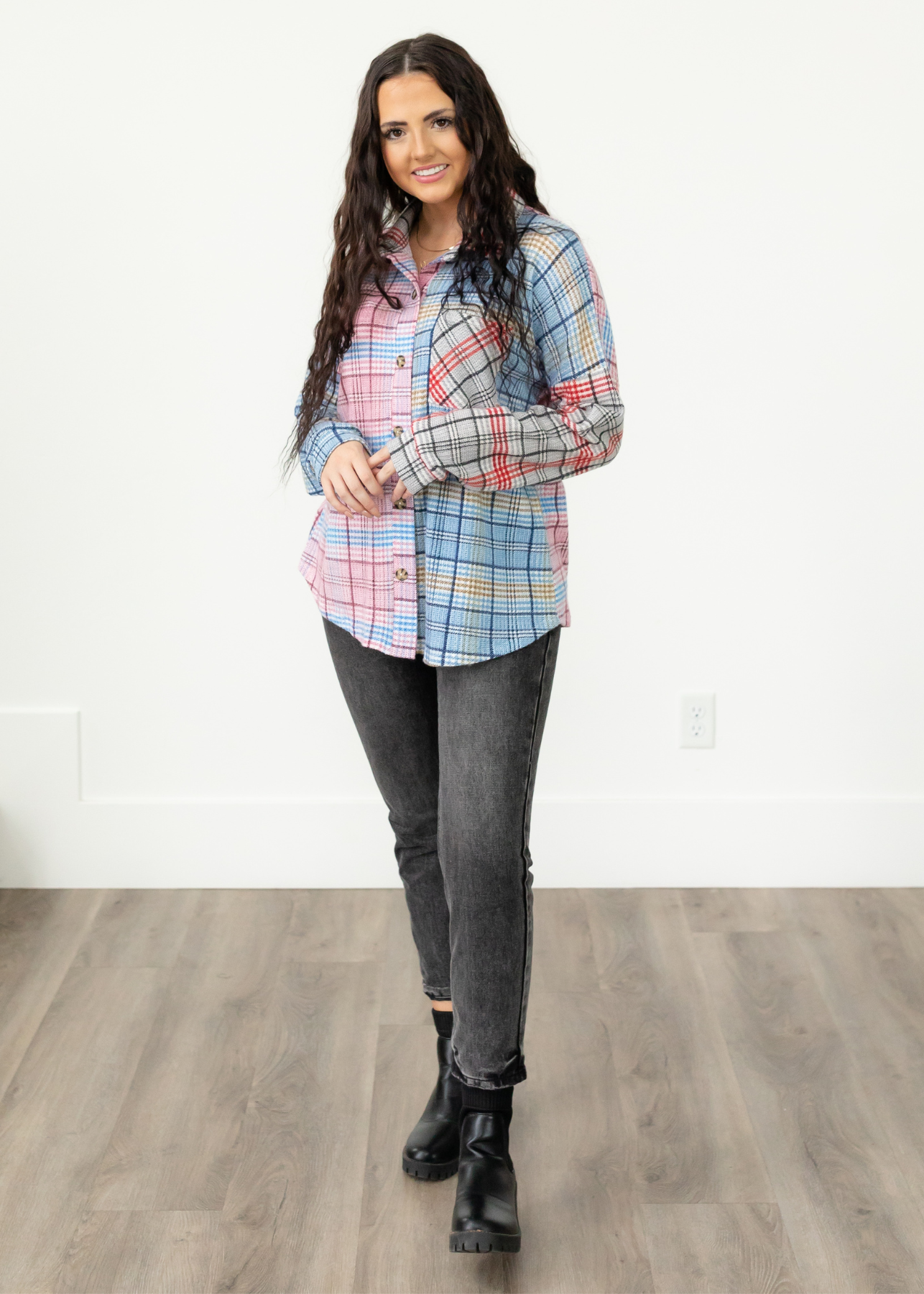 - The cutest pink & blue plaid print with pops of red, yellow, and grey