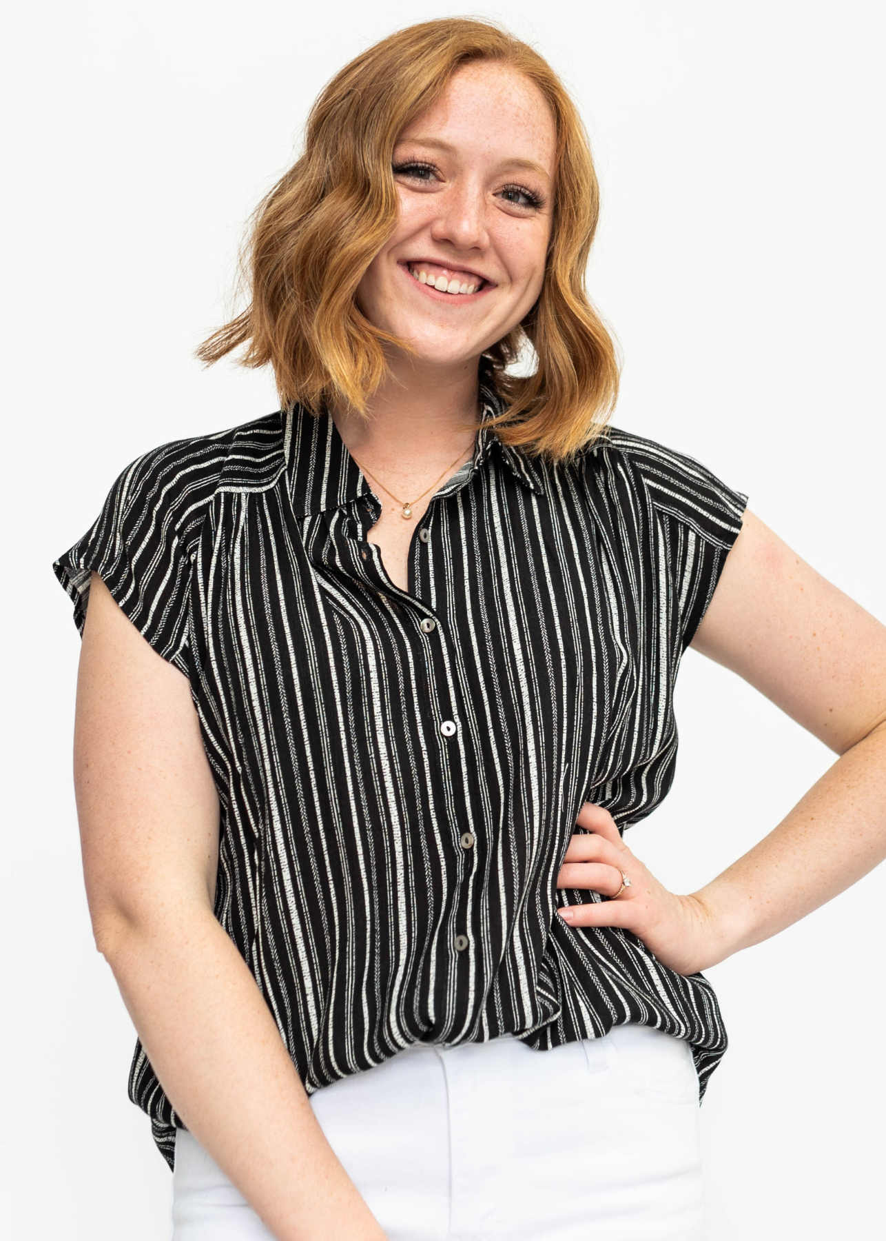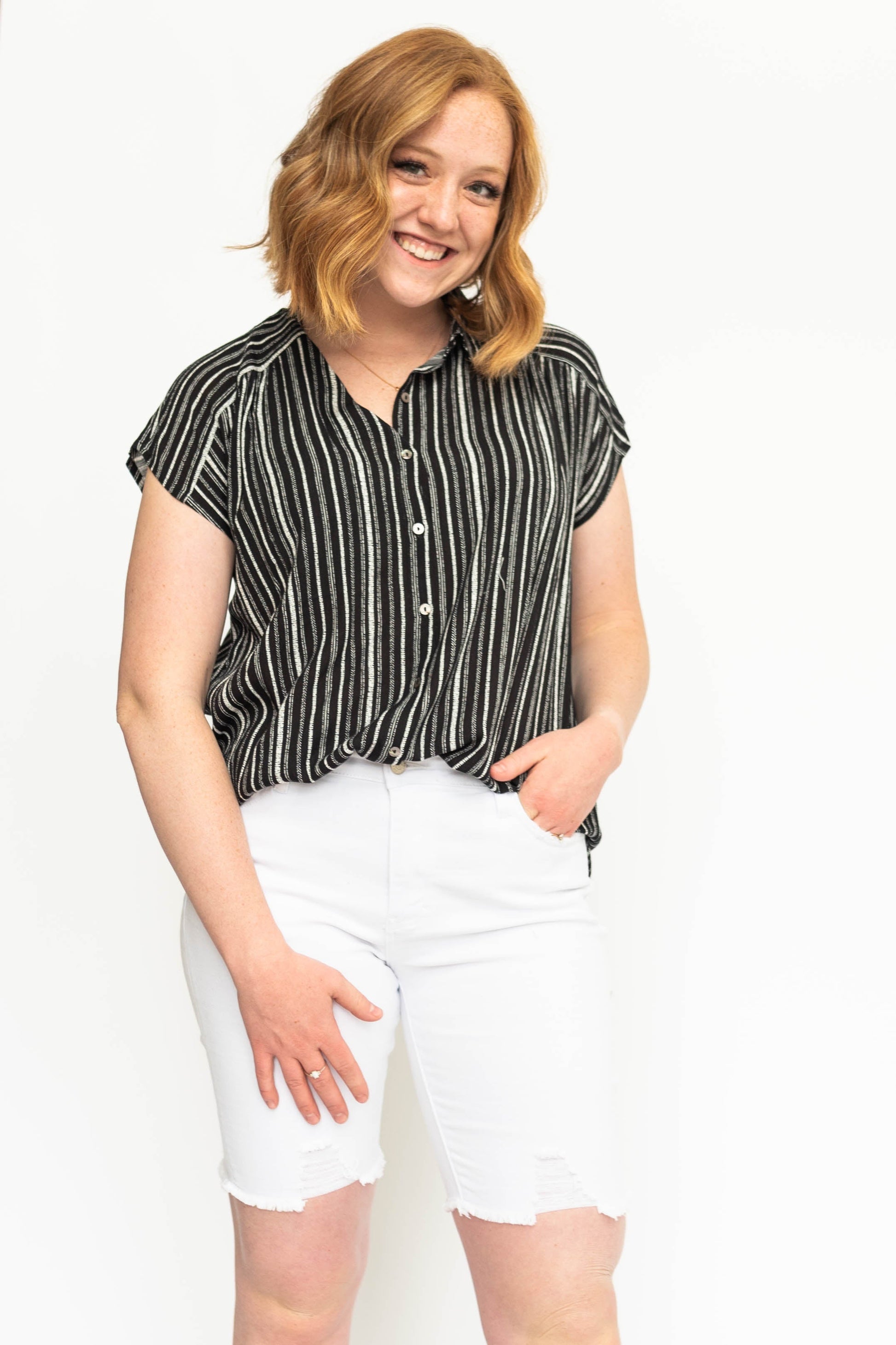 Description. Striped, button up, dropped shoulder/cap sleeve