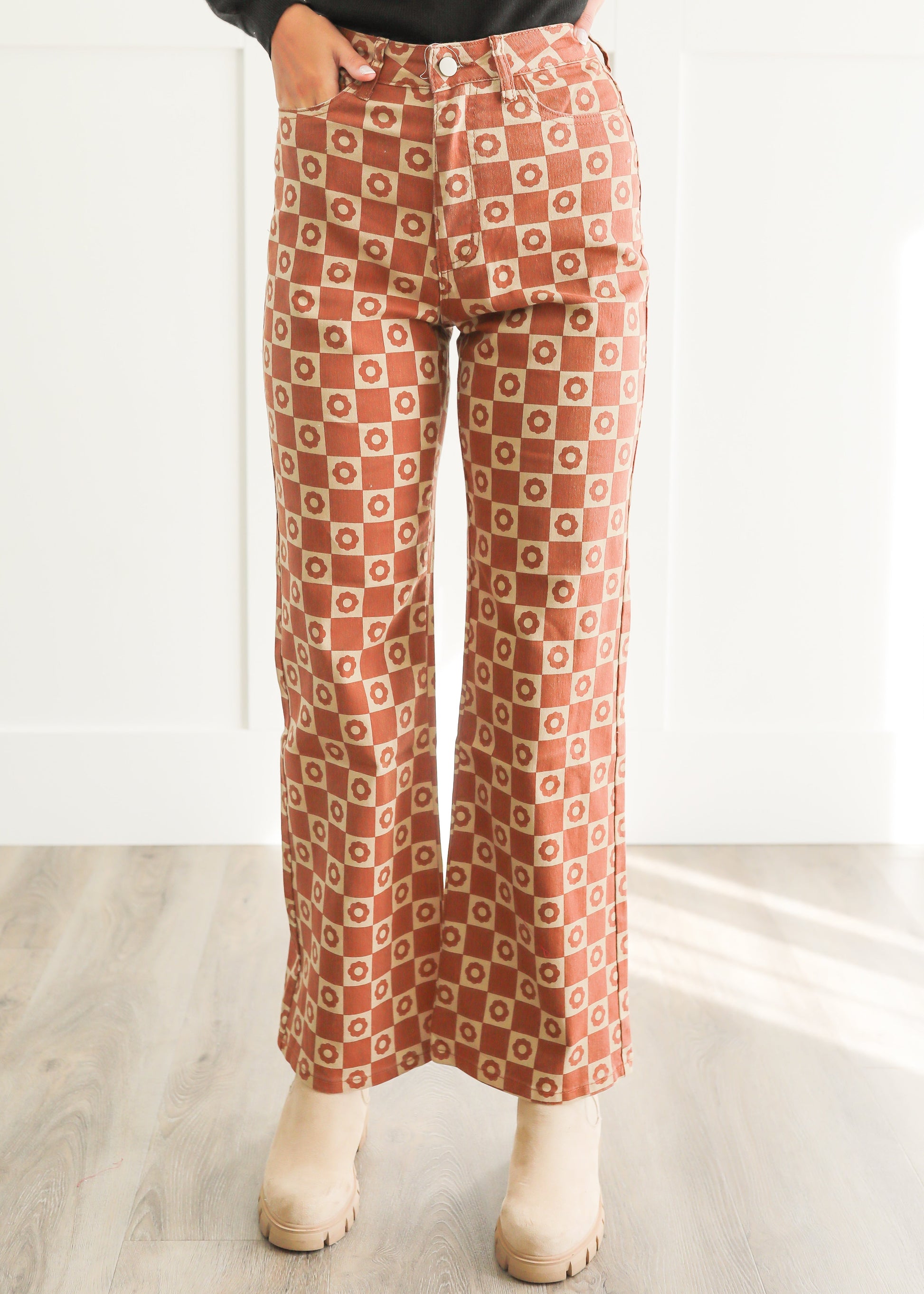 - Such a groovy brown & tan floral checkered print. We are here for it!