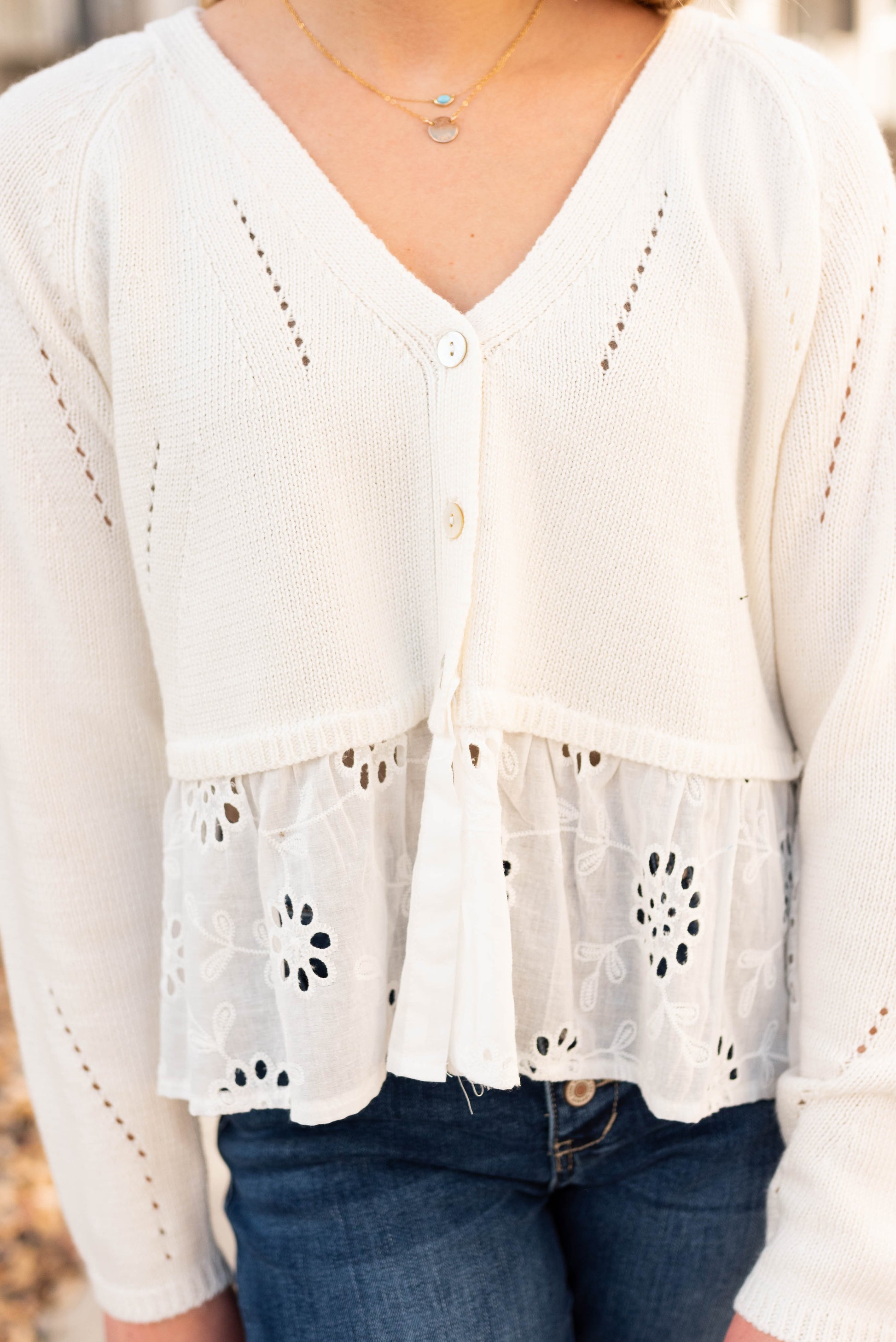 - Unique cardigan with incredible eyelet material layered at the bottom