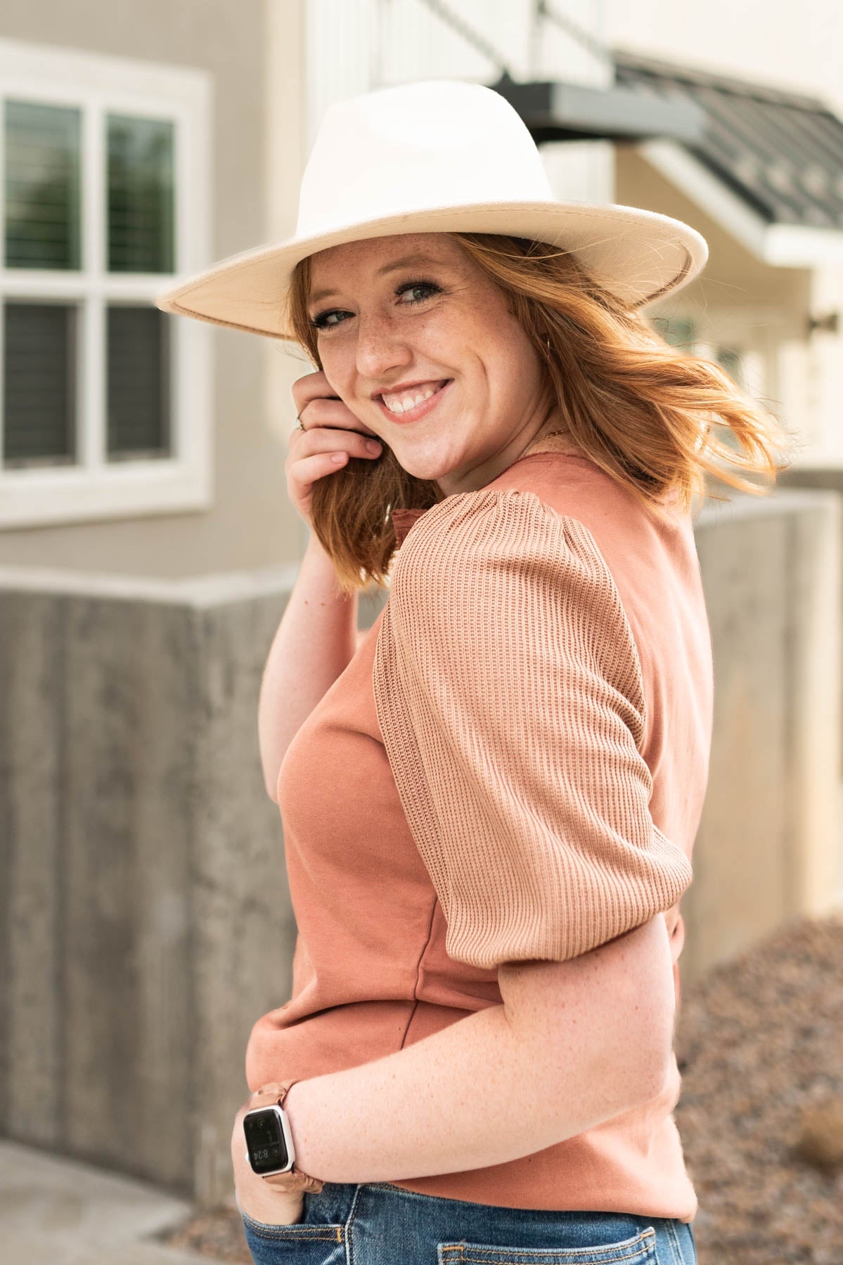- Adorable cinnamon shade + knit puff sleeves
