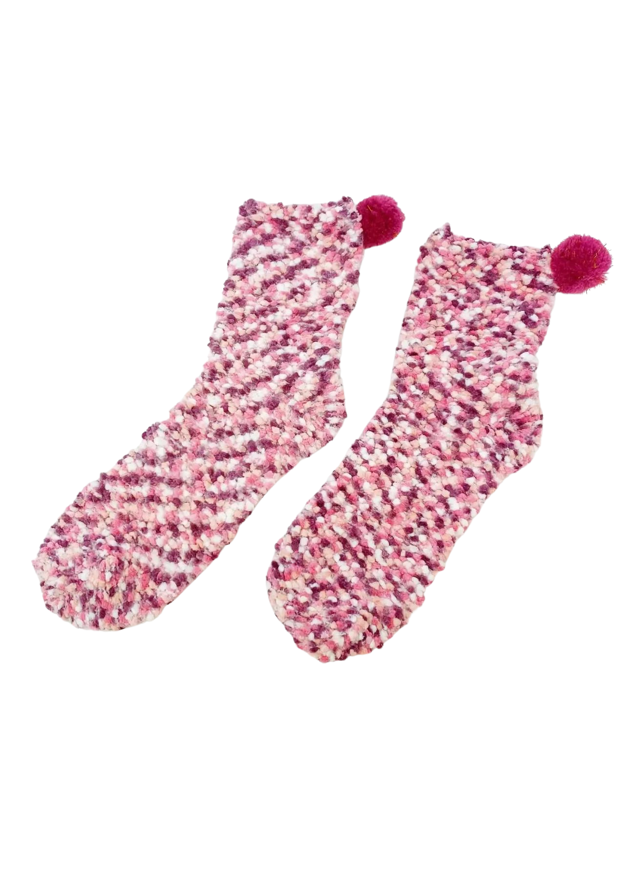 Soft and fuzzy socks with cute pom on the back. Each pair comes in a cute cupcake packaging. Super cozy, not too puffy, just perfect for lounging or wearing in shoes!