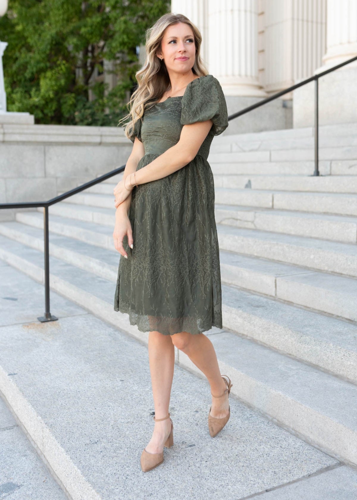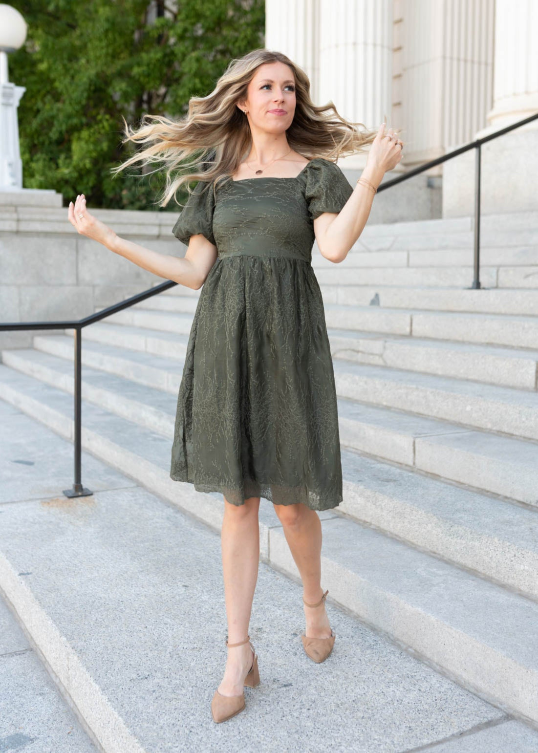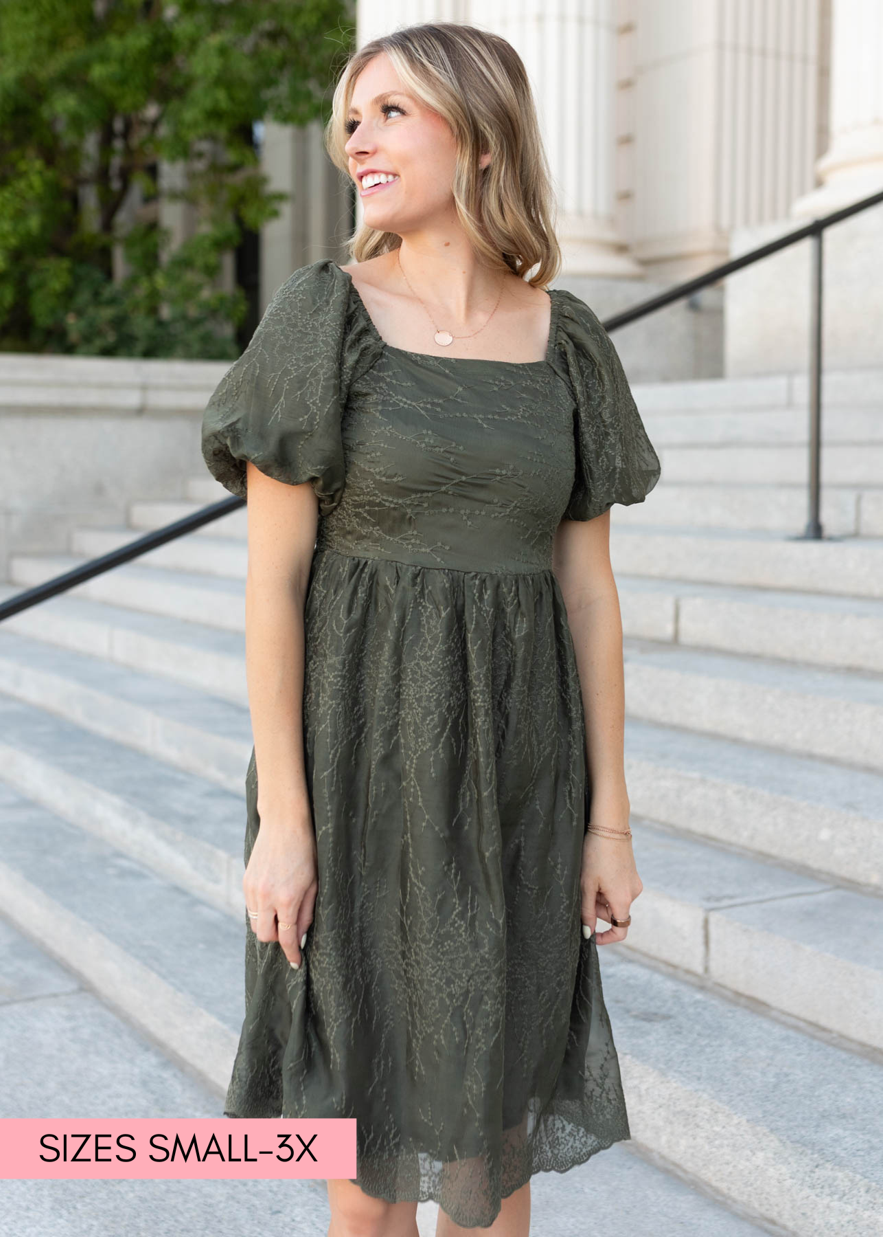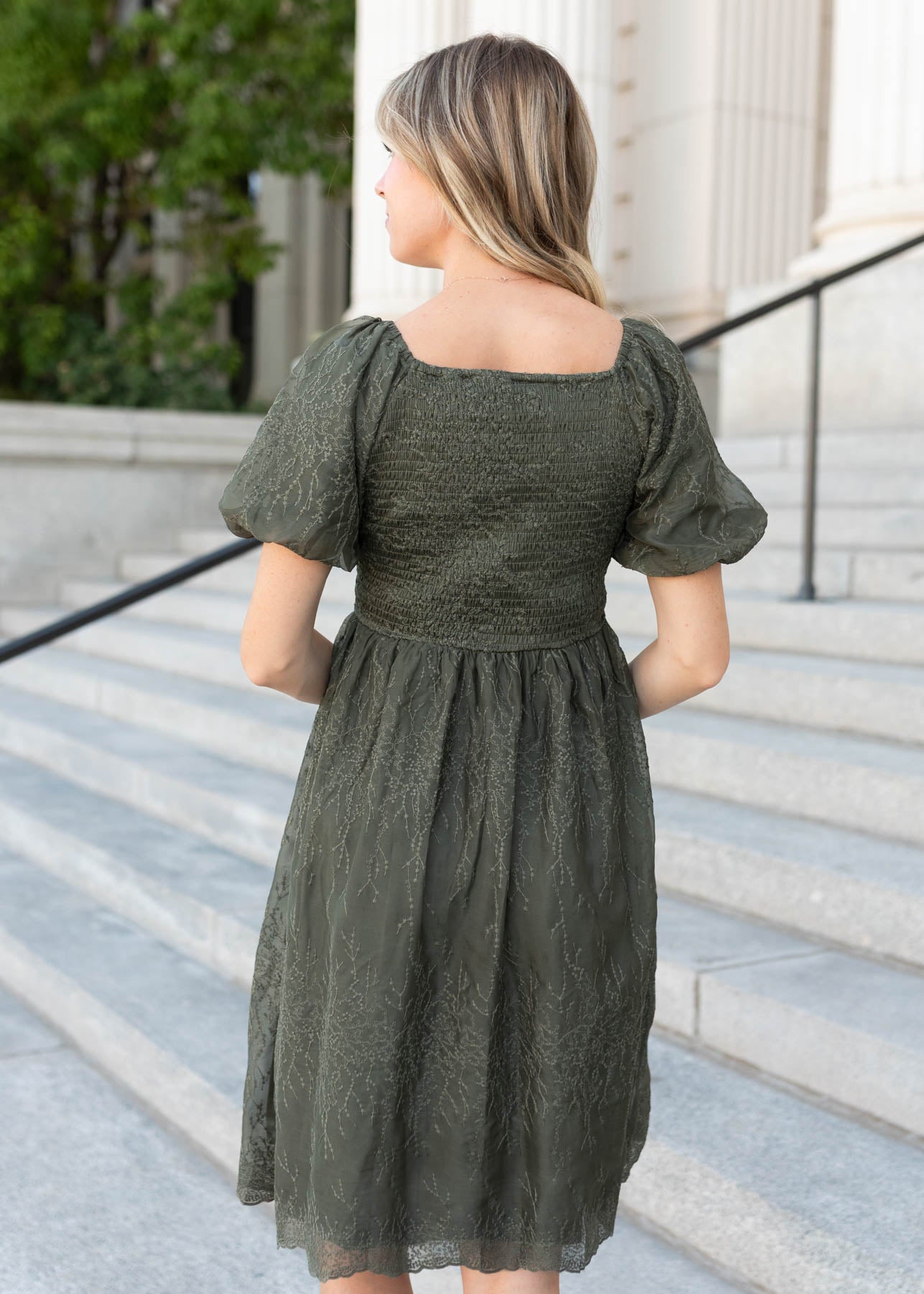 Dainty, dreamy, and made to flatter—the Sally Olive Embroidered Dress is a standout in all the best ways. With its elegant square neckline, soft lace overlay, and smocked back for added comfort, this dress brings together timeless style and an easy fit. The rich olive green is fully lined for confident coverage and perfect for everything from special events to Sunday mornings.