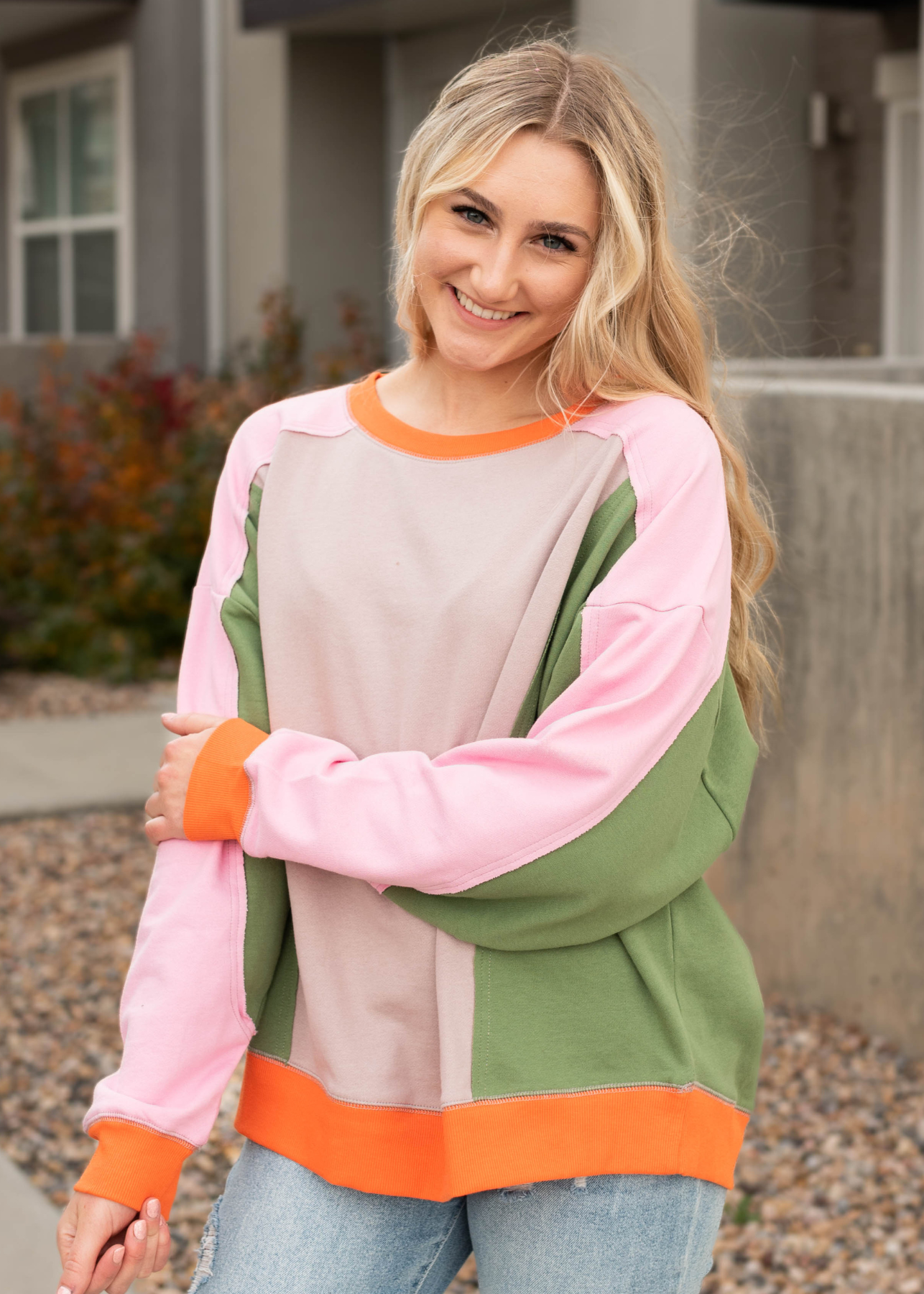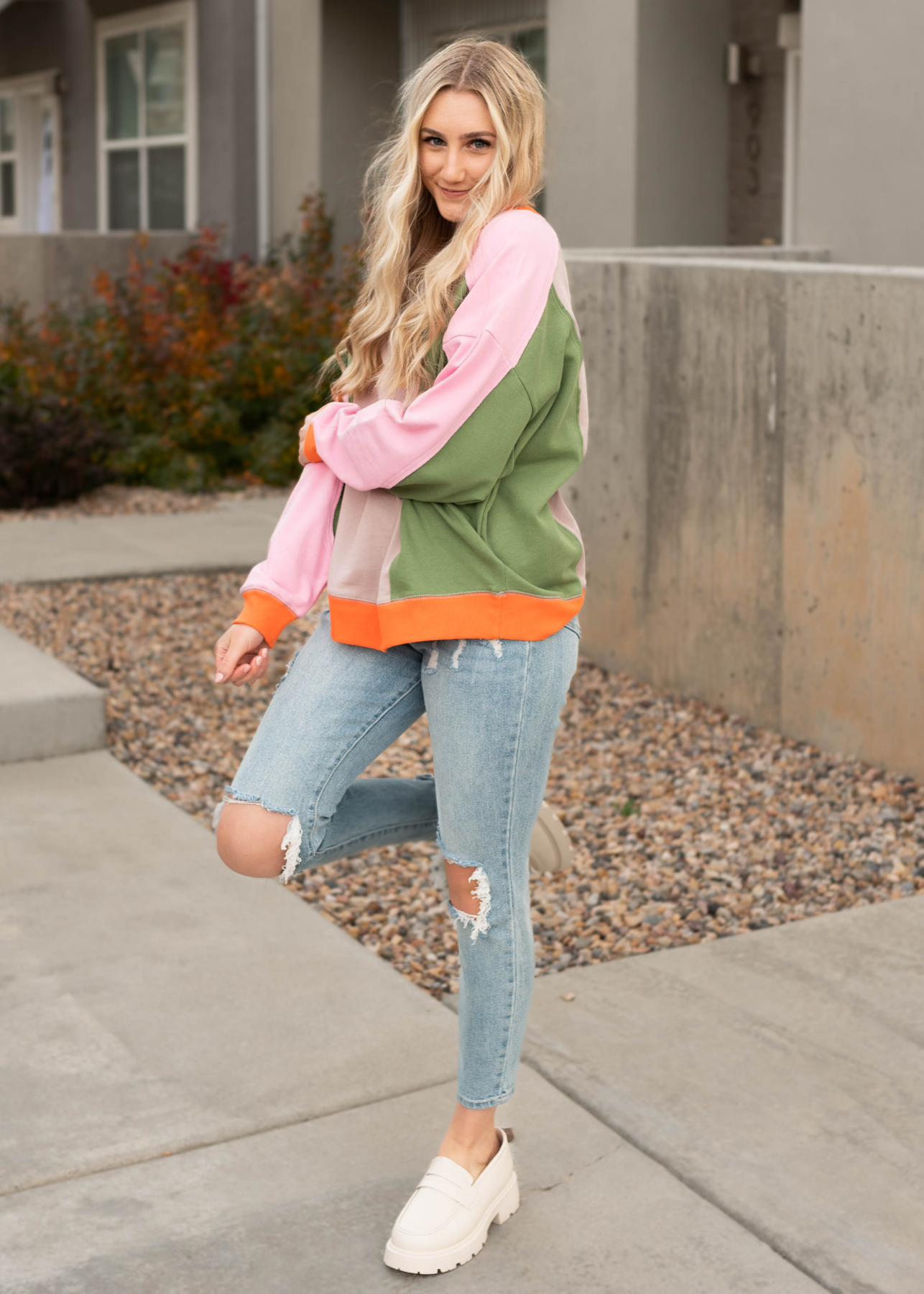 - Stone, pink, green, and orange color blocking