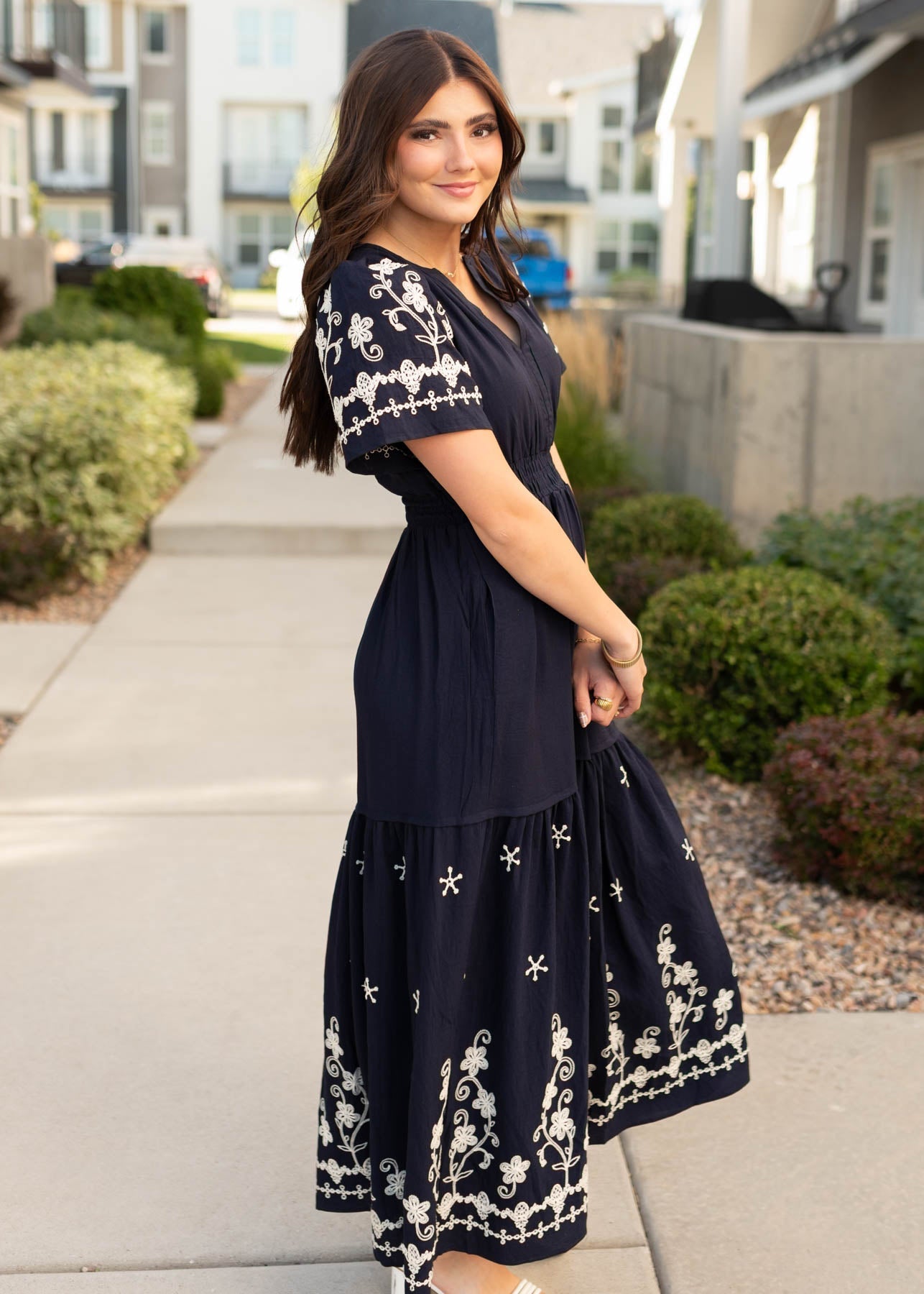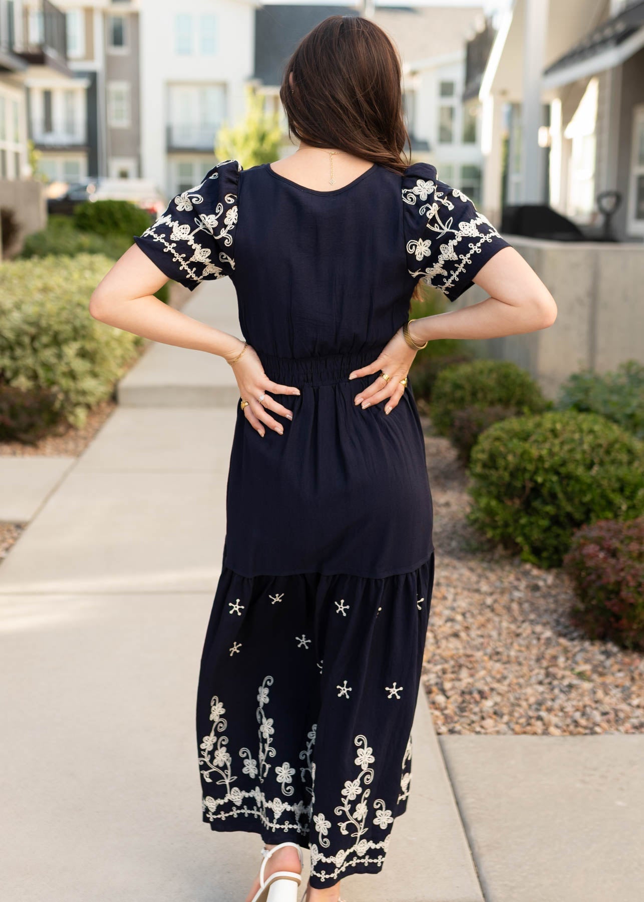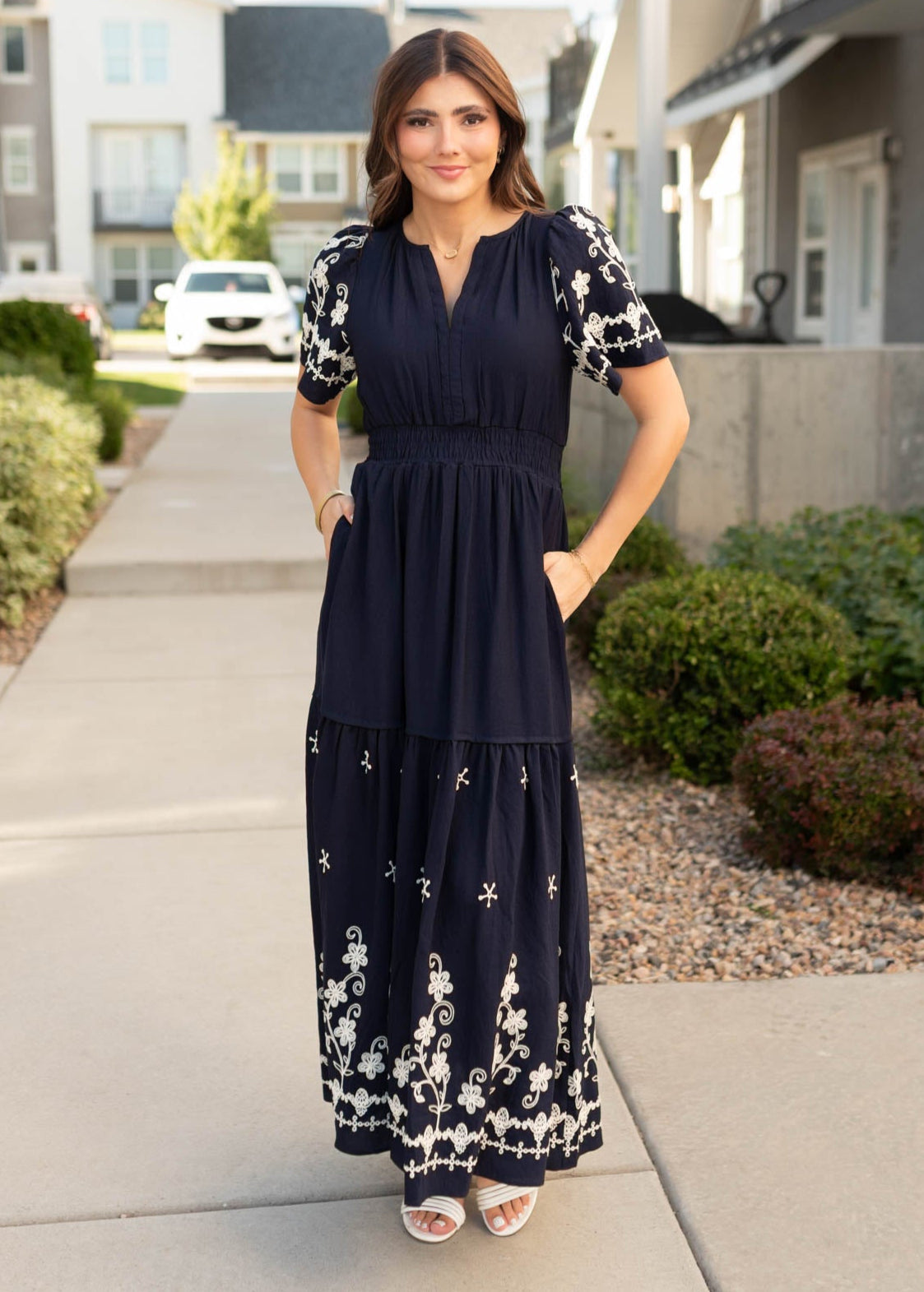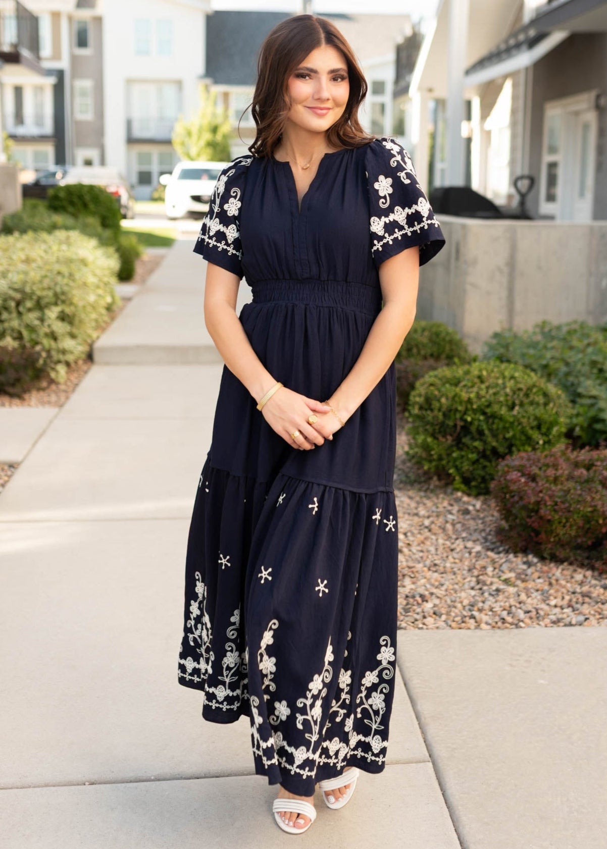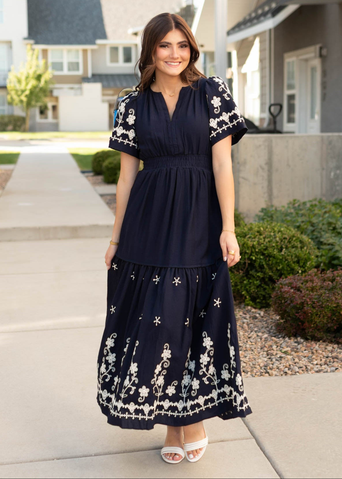 Meet the dress that’s effortlessly elegant yet totally wearable—the Sofia Navy Embroidered Dress. With delicate embroidery and a breezy tiered skirt, it’s the perfect mix of detail and comfort you’ll want in your lineup.
