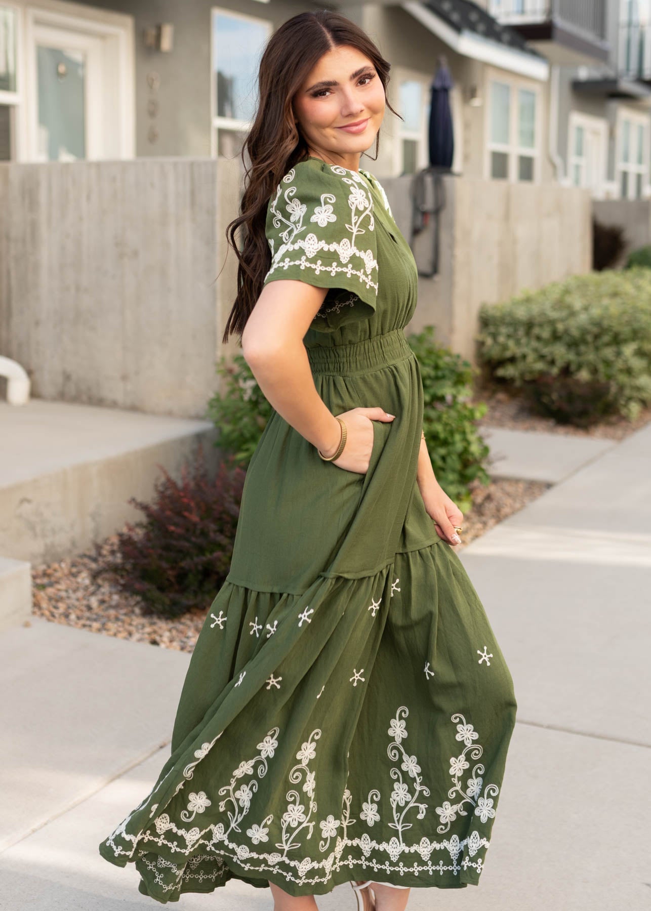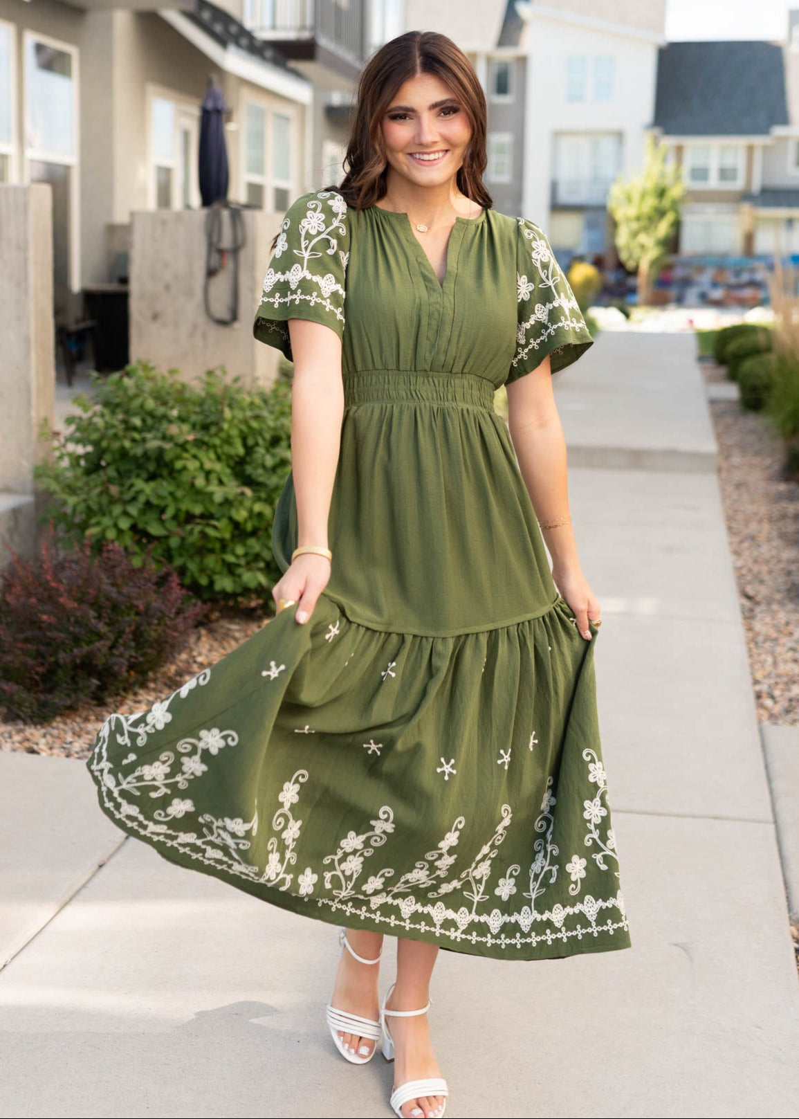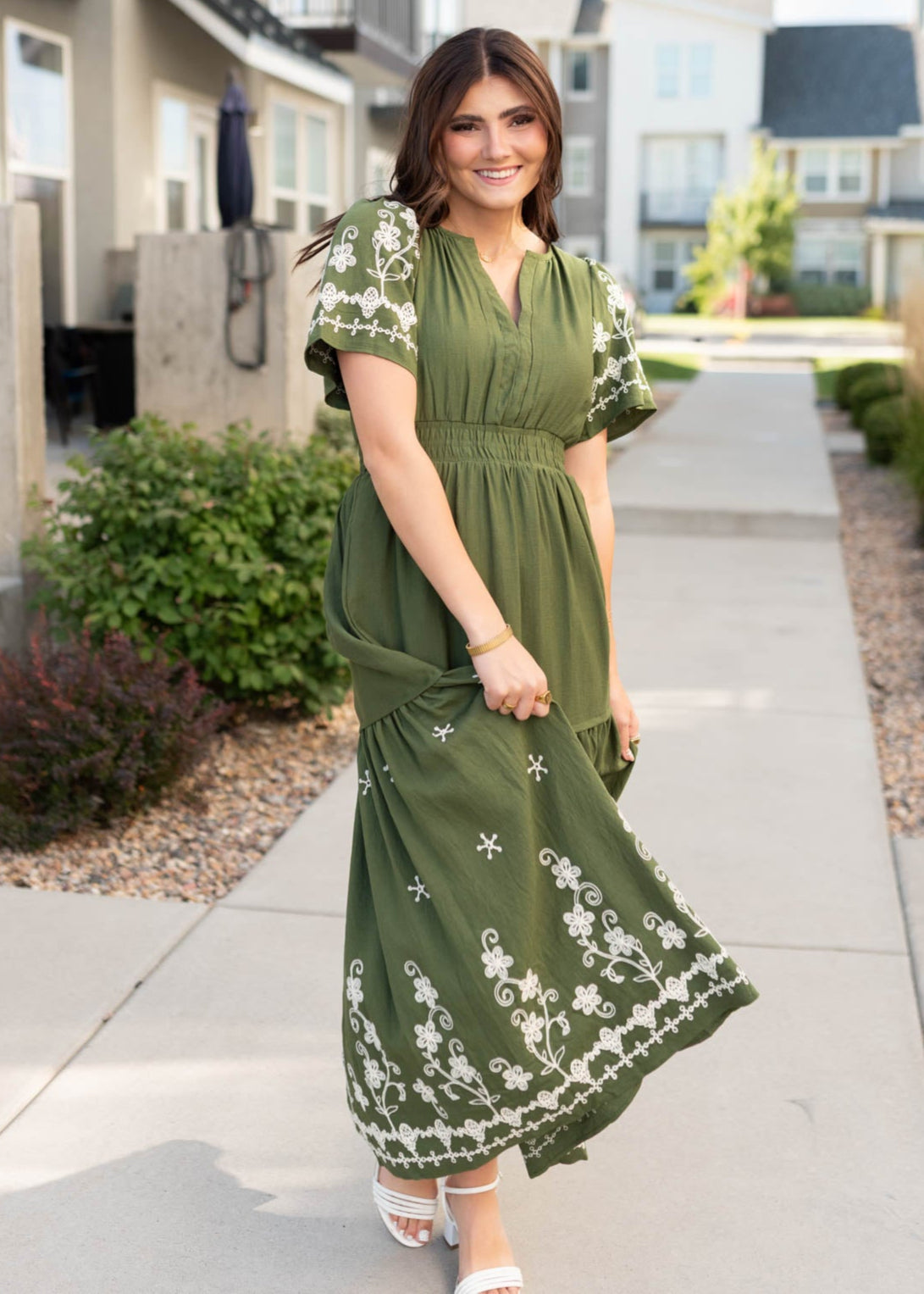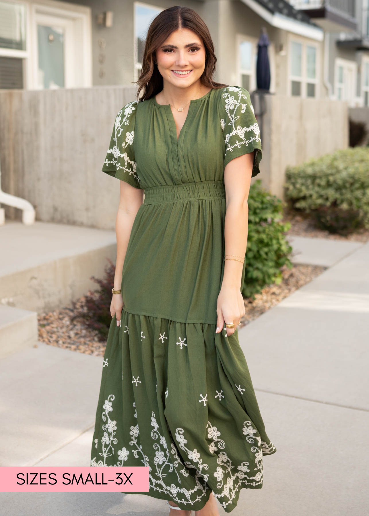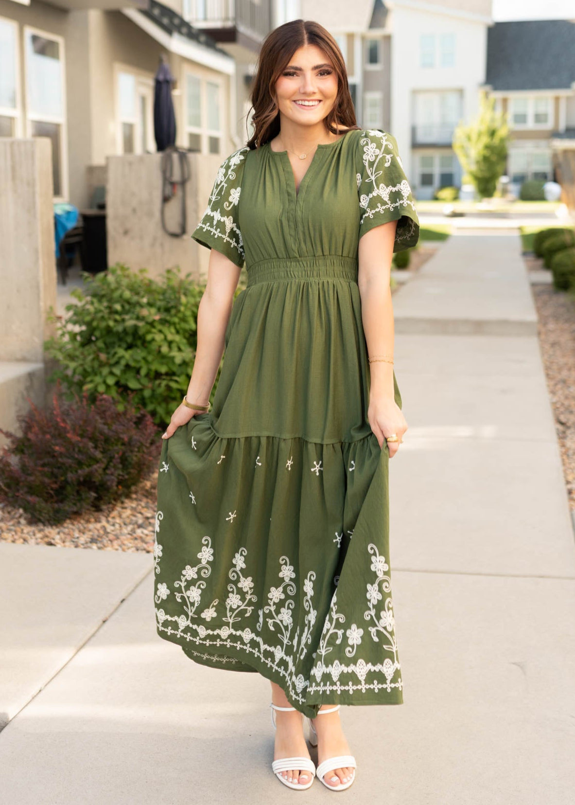 The Sofia Olive Embroidered Dress is all about understated elegance. With its soft olive hue, intricate embroidery, and flattering tiered skirt, this beauty blends comfort and charm for a look you’ll want to wear on repeat.