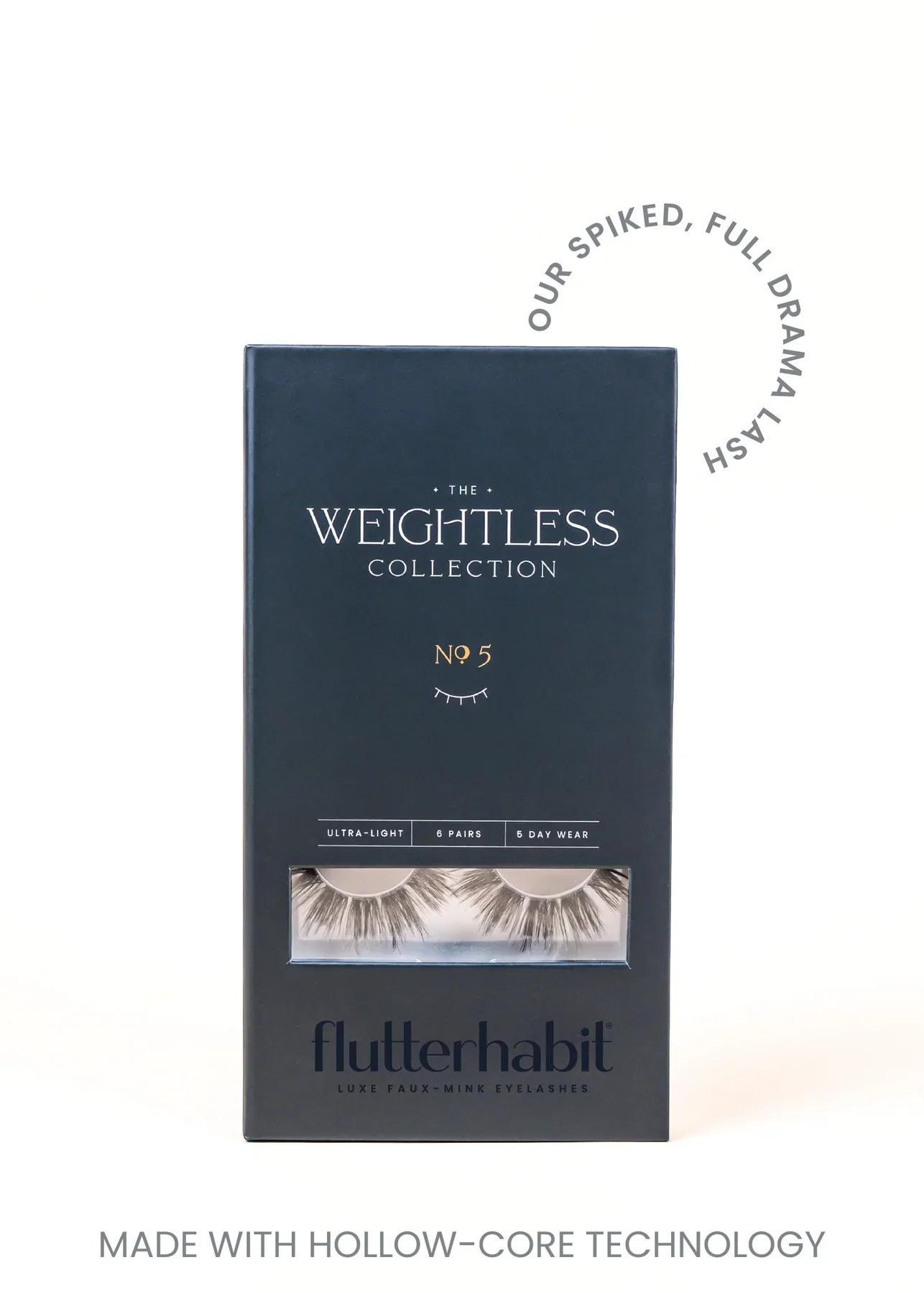 Drama queens, this one is for you! The Weightless No. 5 is our spiciest lash ever. This doll-eyed lash is a spiky style with multi-length fibers that invites you to take a walk on the wild side. Using our NEW, ultra-light, hollow core fiber technology, we’ve dialed up the sass without sacrificing comfort. This style is the perfect addition to any glam lover’s collection.
