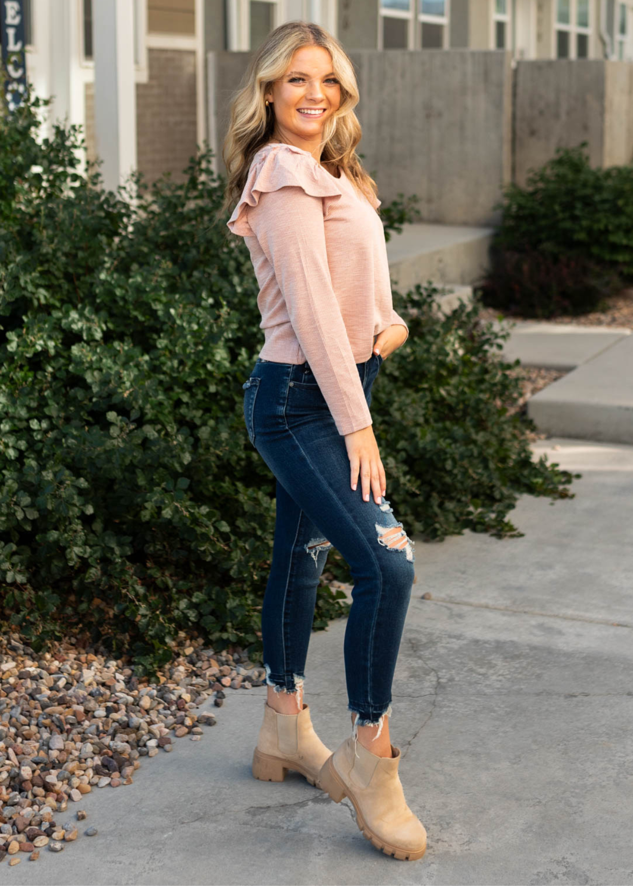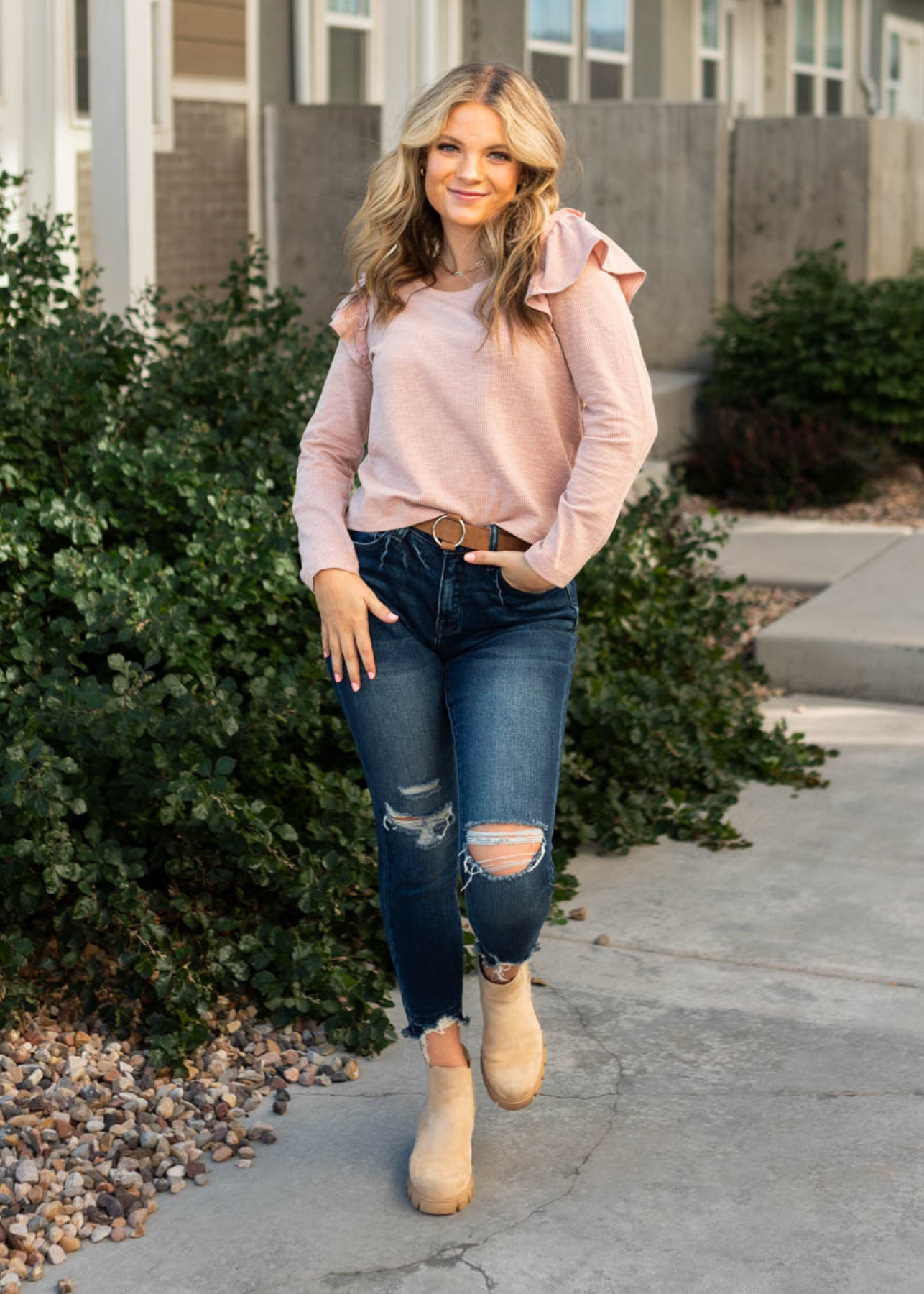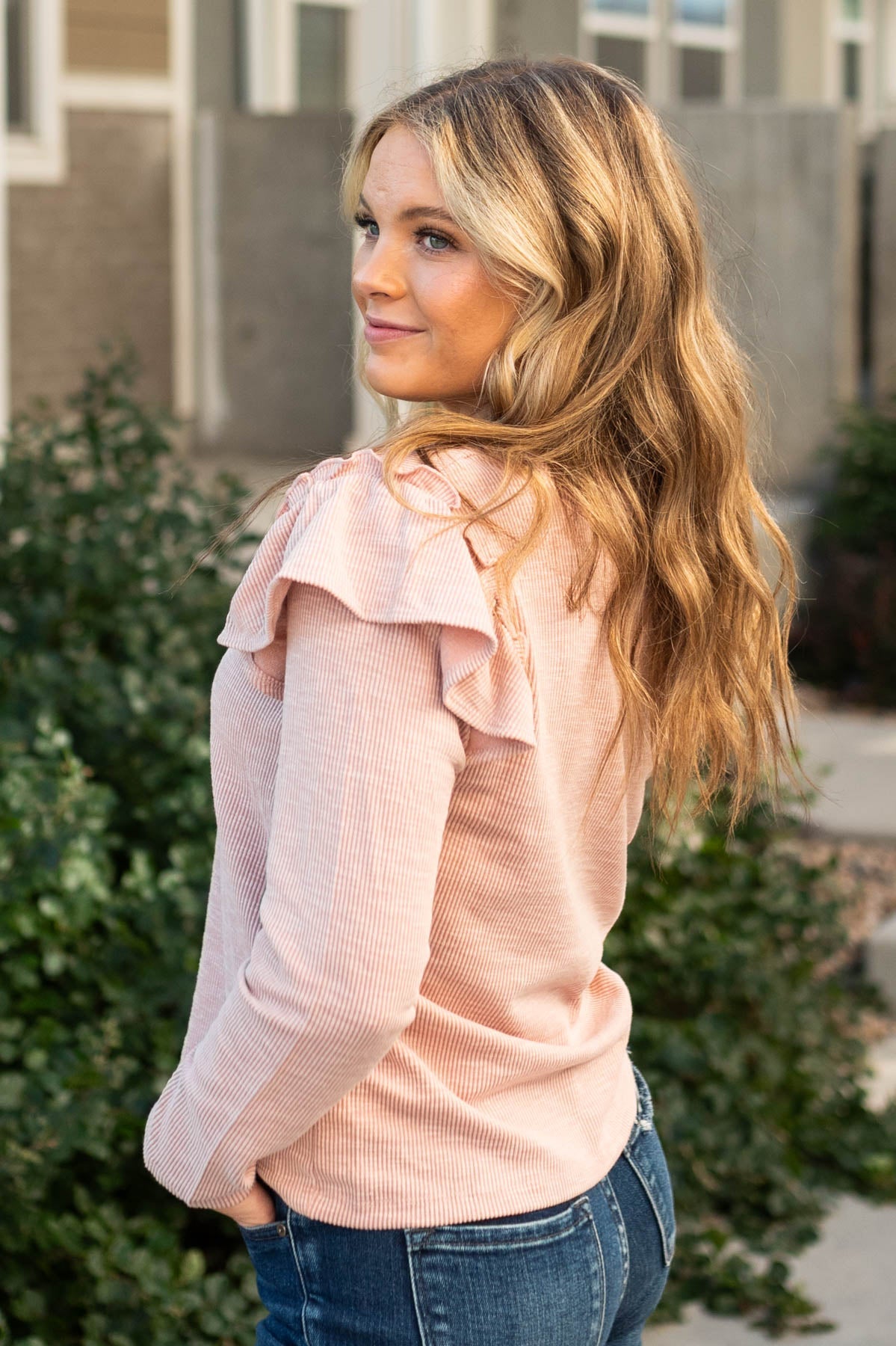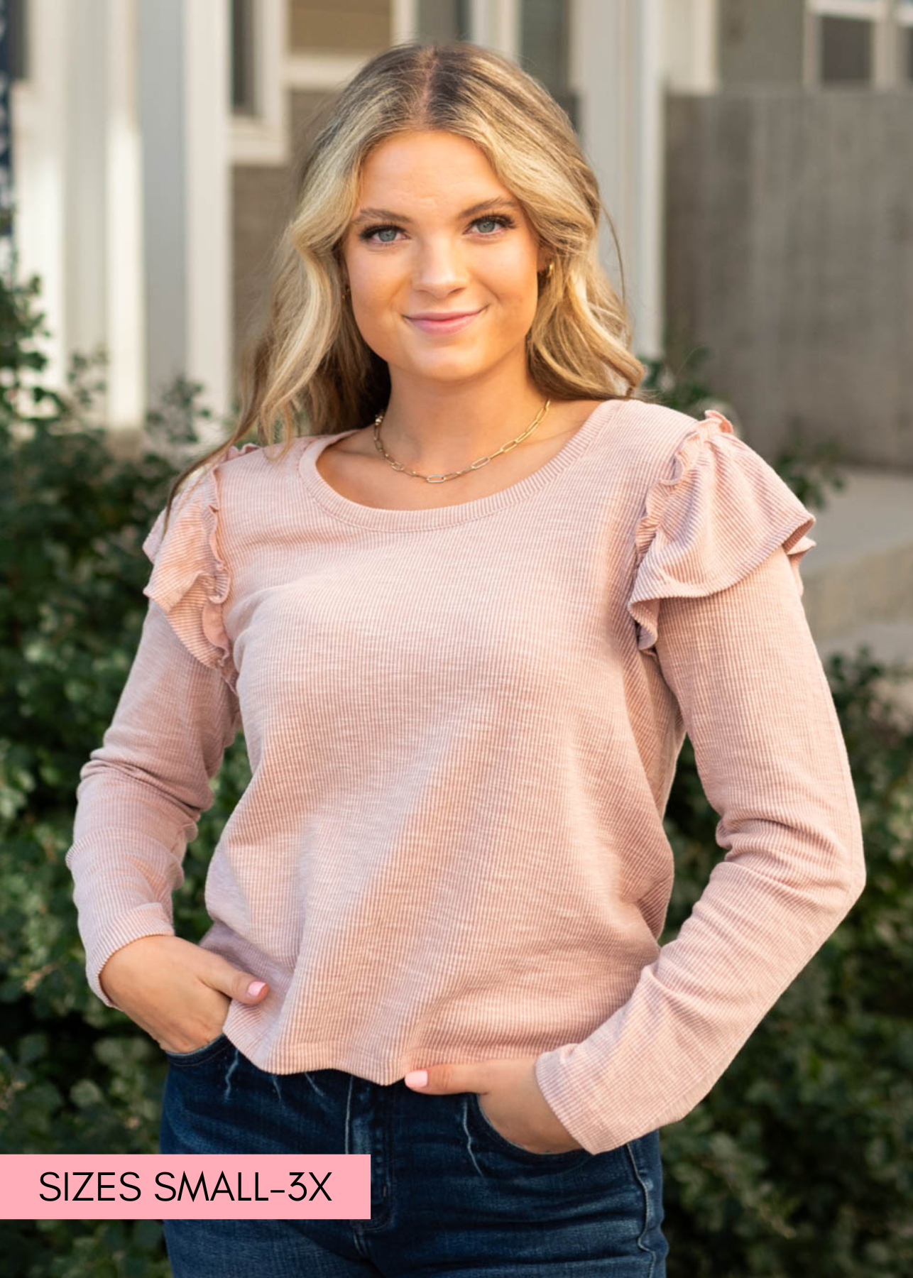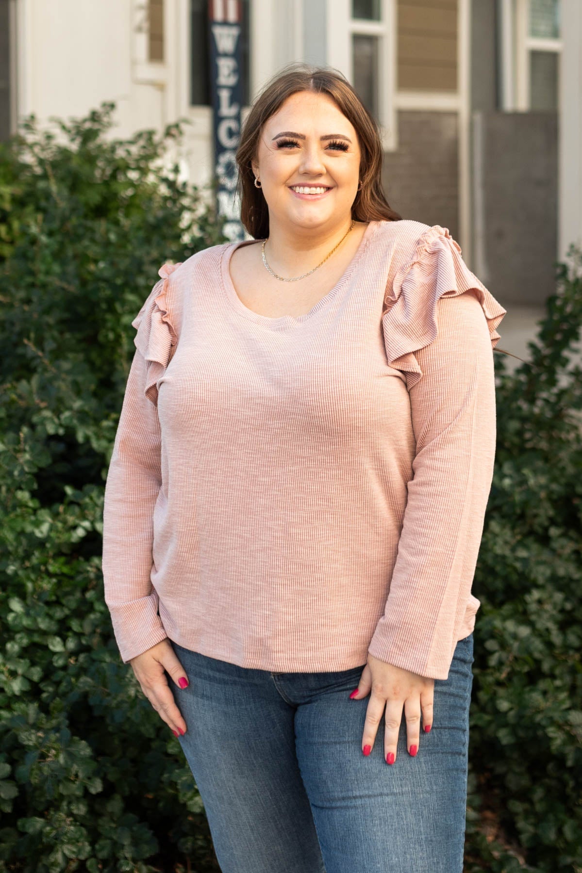 - Mauve ribbed fabric + cute ruffled shoulders