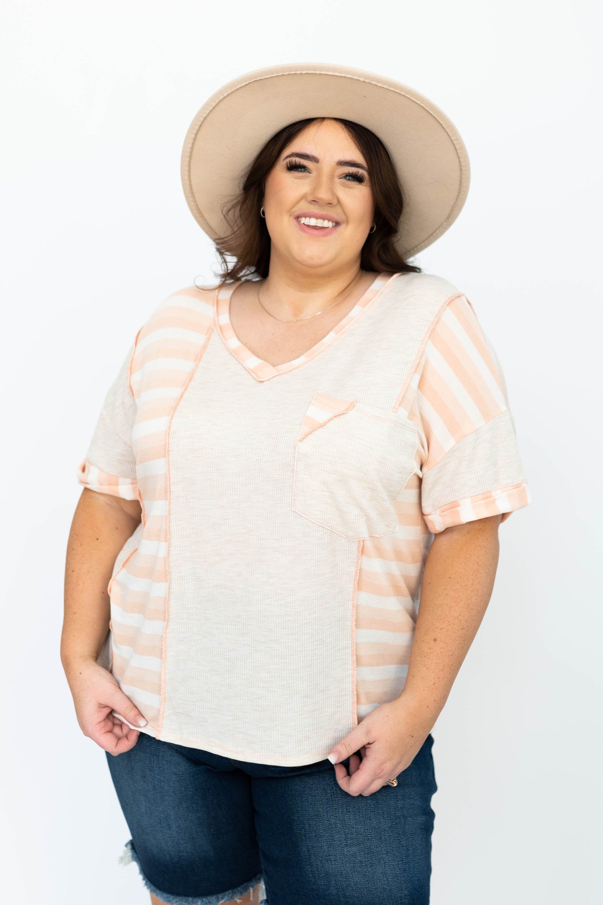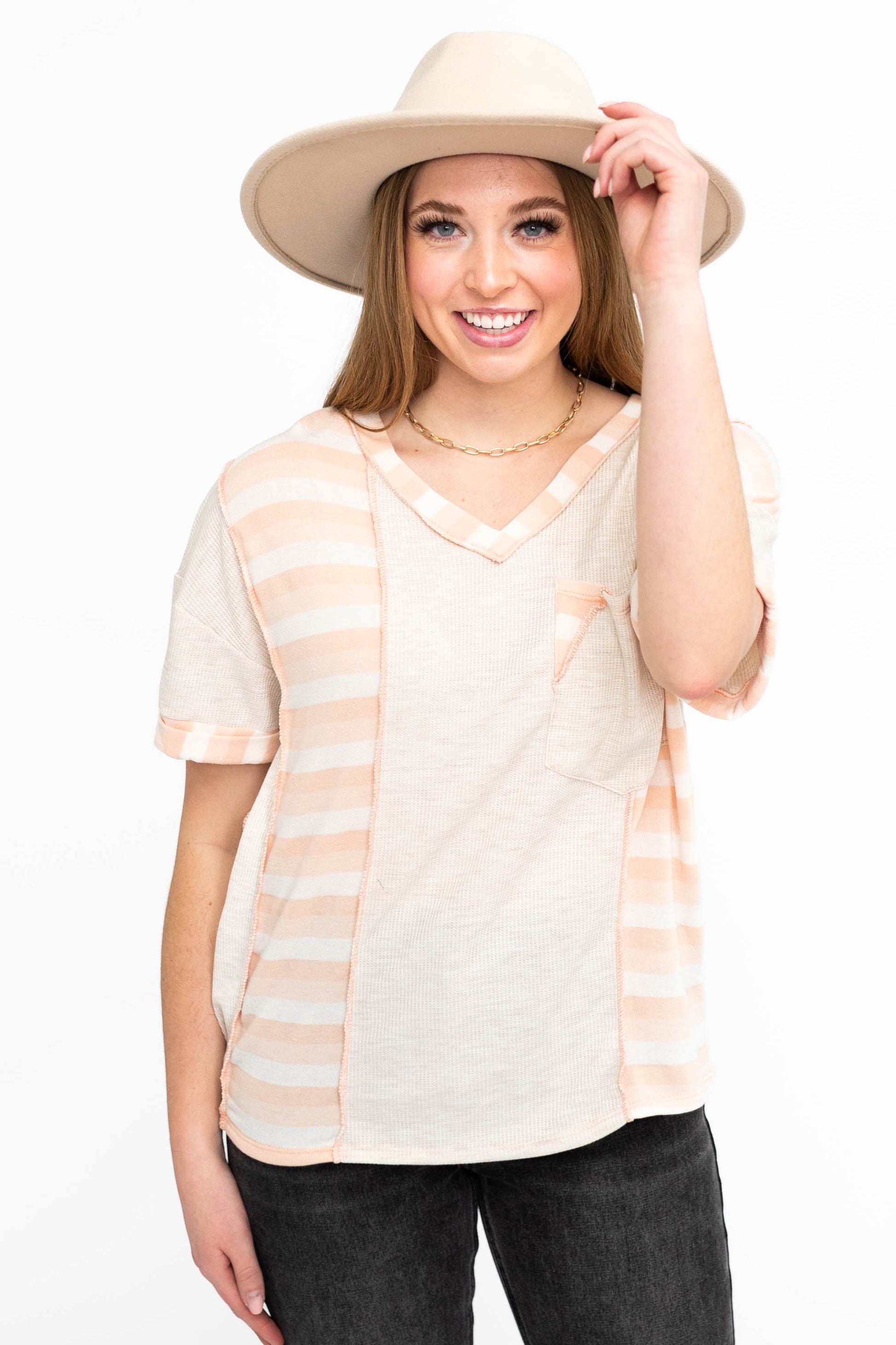- Color blocking with oatmeal, peach, and white stripes